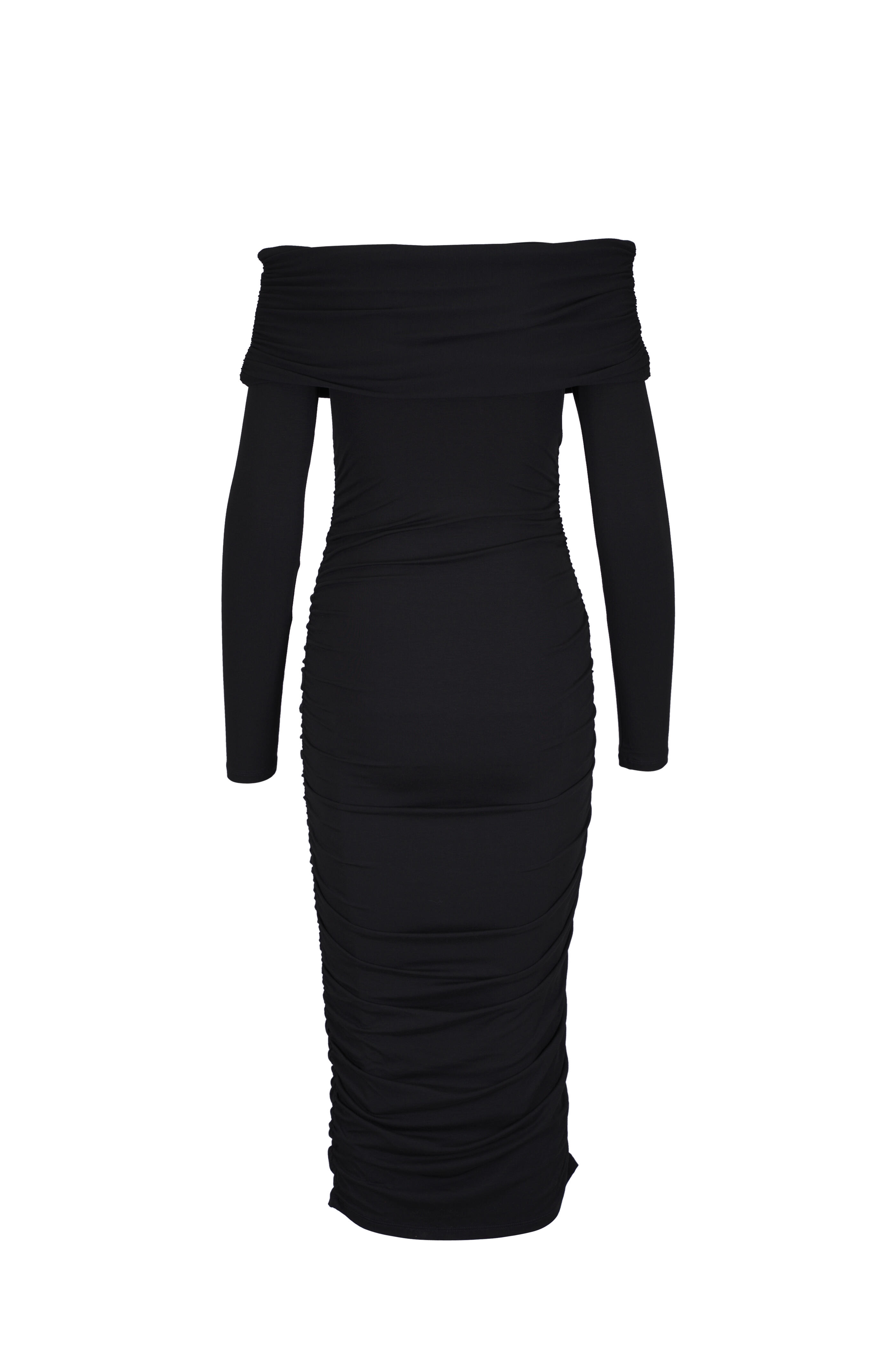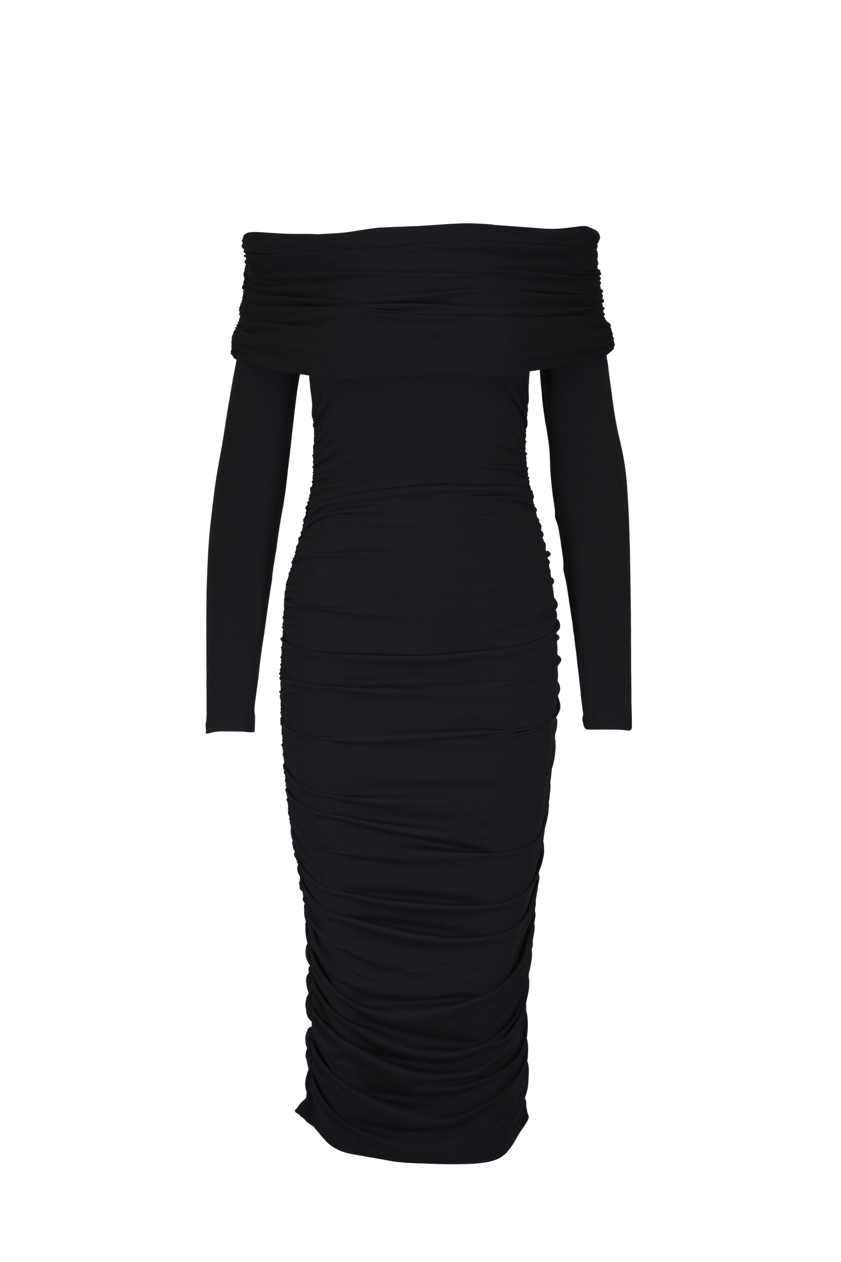 Off-the-shoulder neckline. Side ruching. Pull over style. Imported. About 50" shoulder to hem. 90% lyocell, 10% elastane. Machine wash.