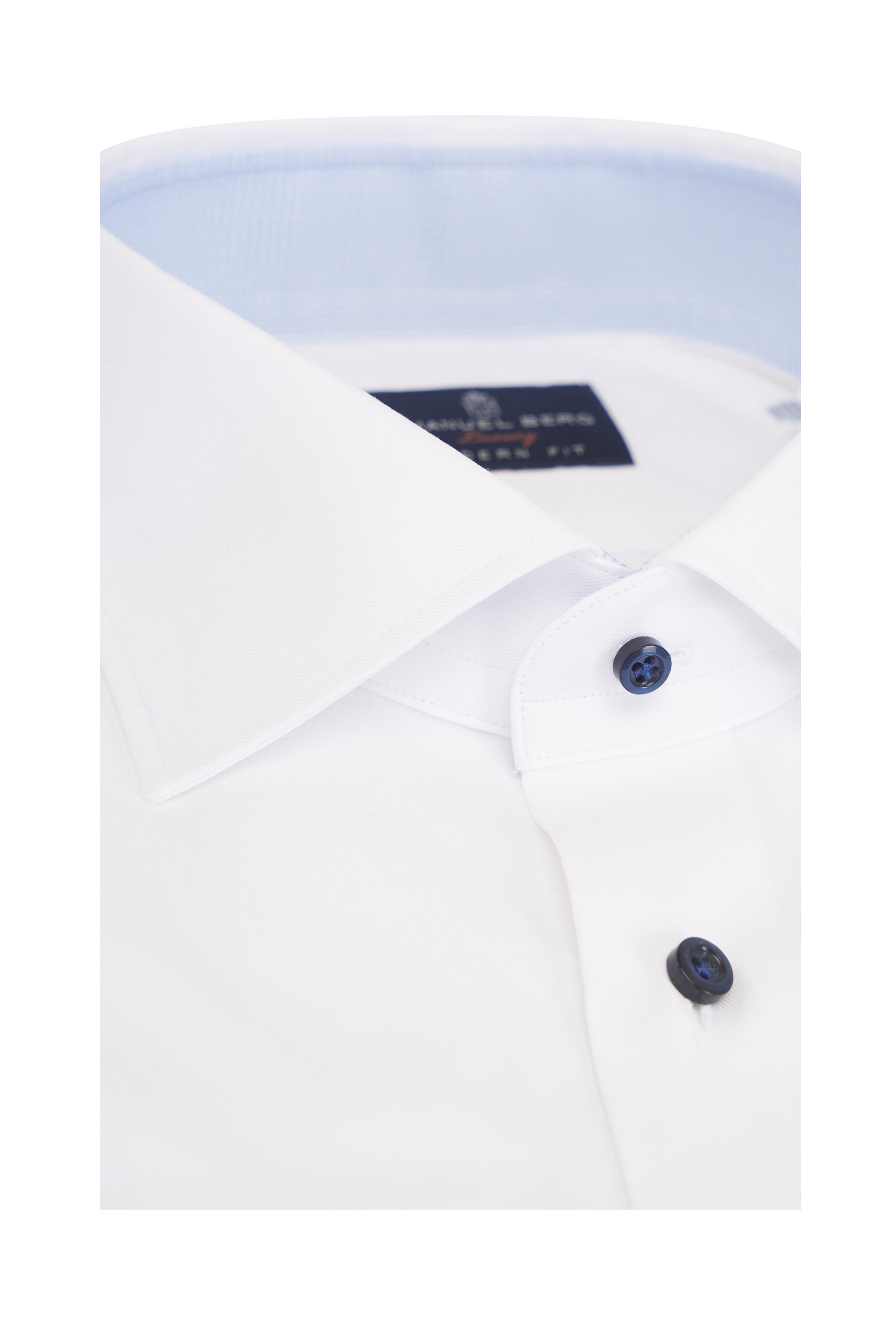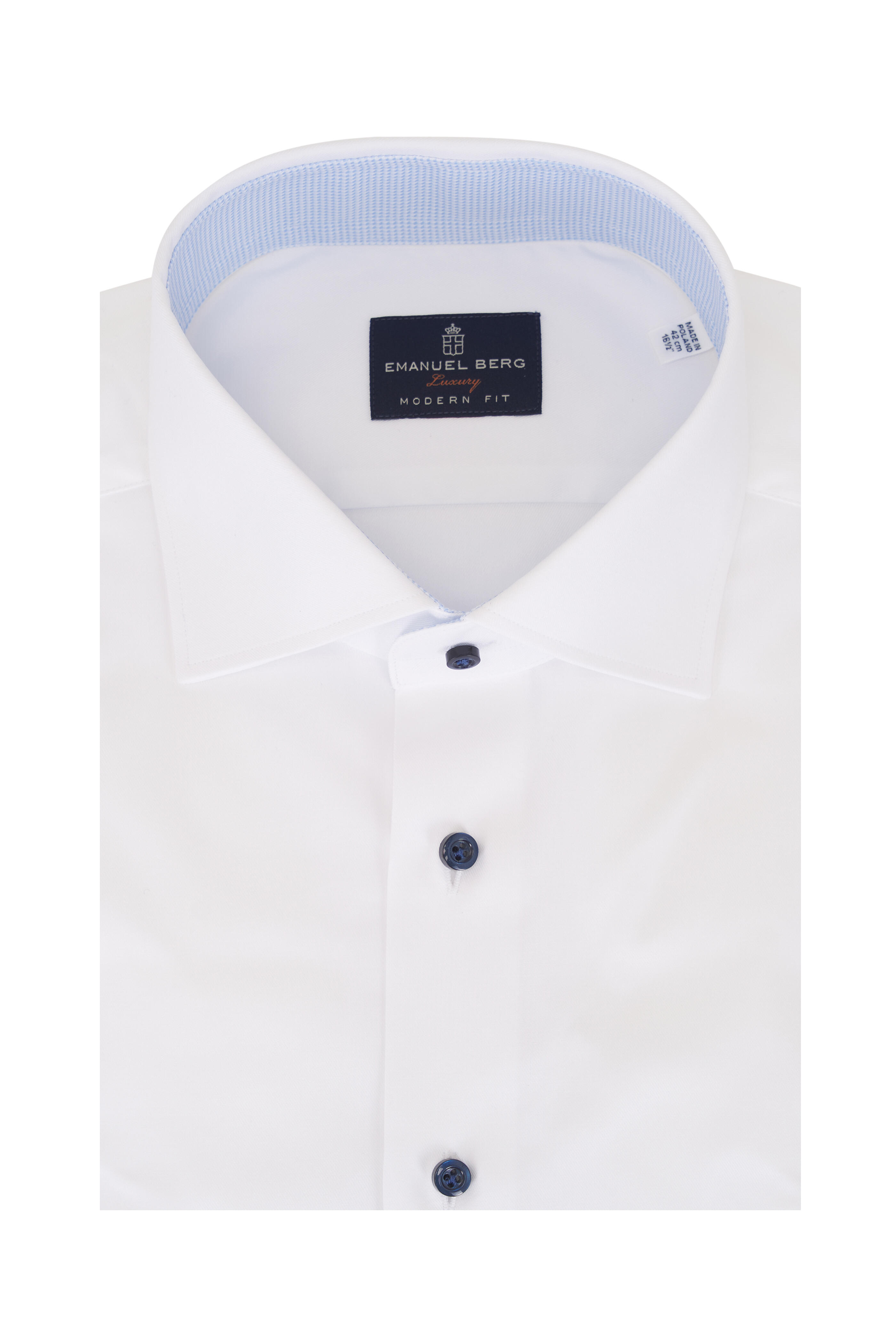 Spread collar. French front button placket. Adjustable single button mitered cuffs. Made in Poland. 100% cotton. Machine wash.