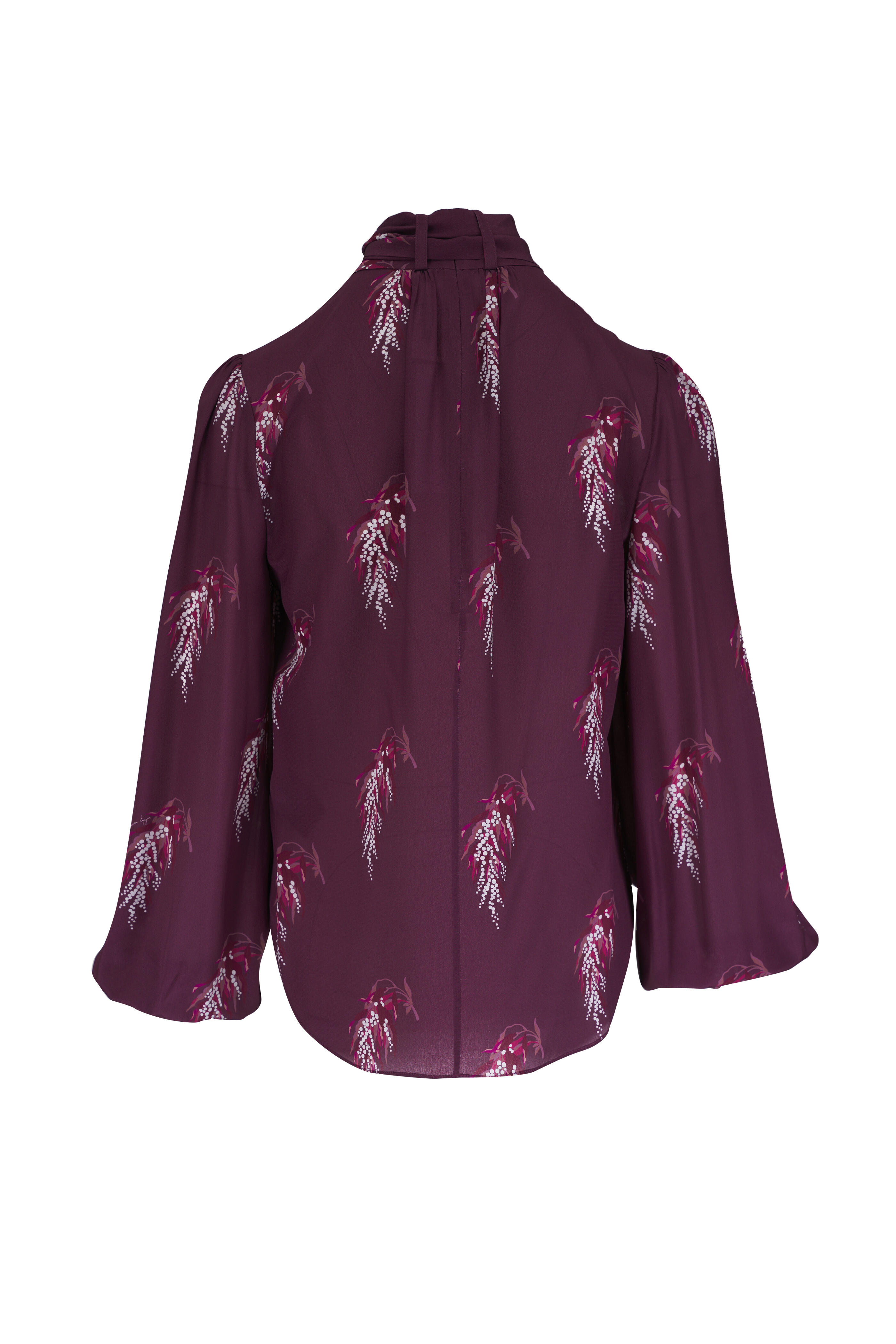 Stand collar; removable self-tie bow. Concealed back zip. Single button sleeves. Made in USA. 100% silk. Dry clean.