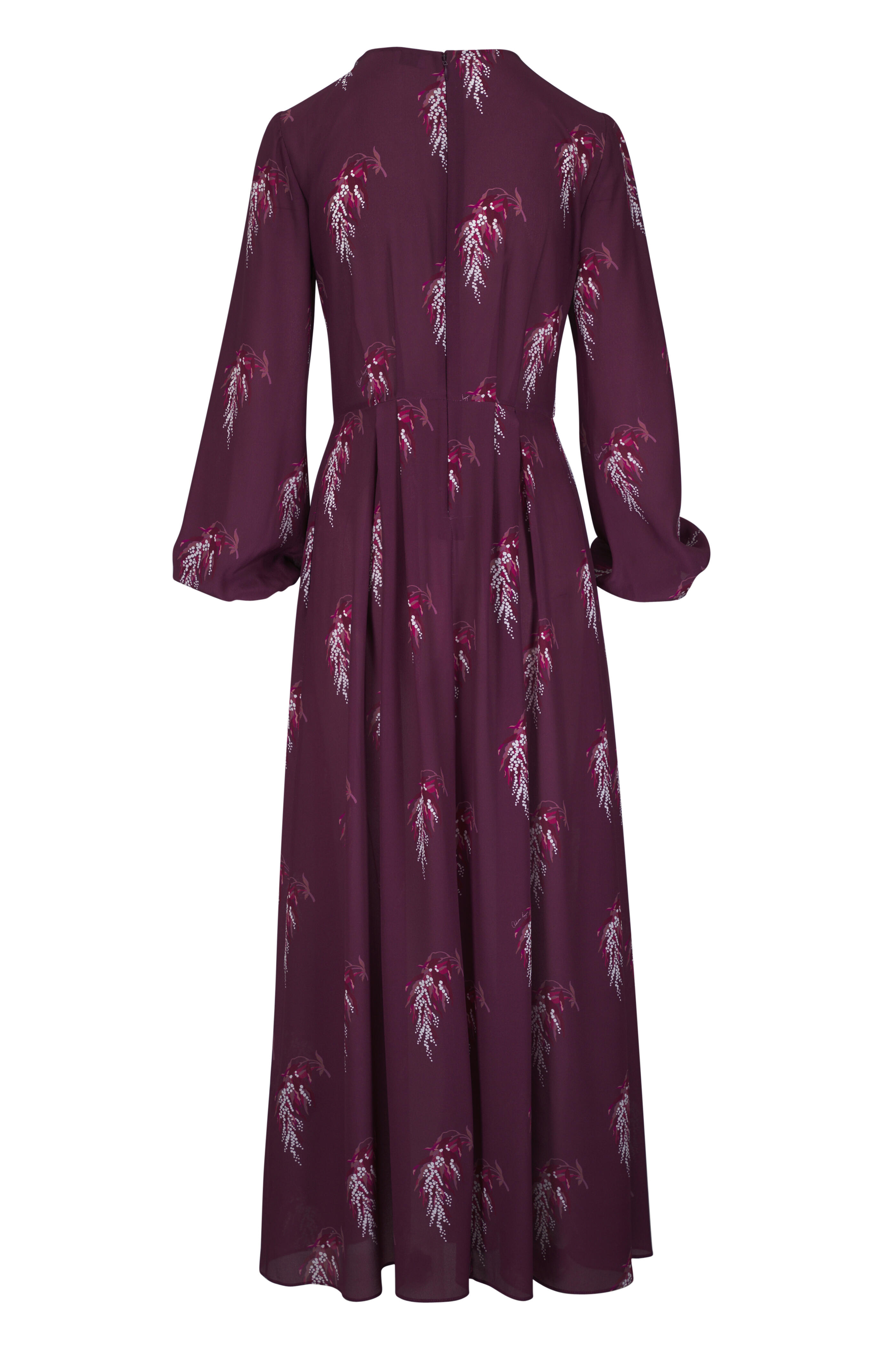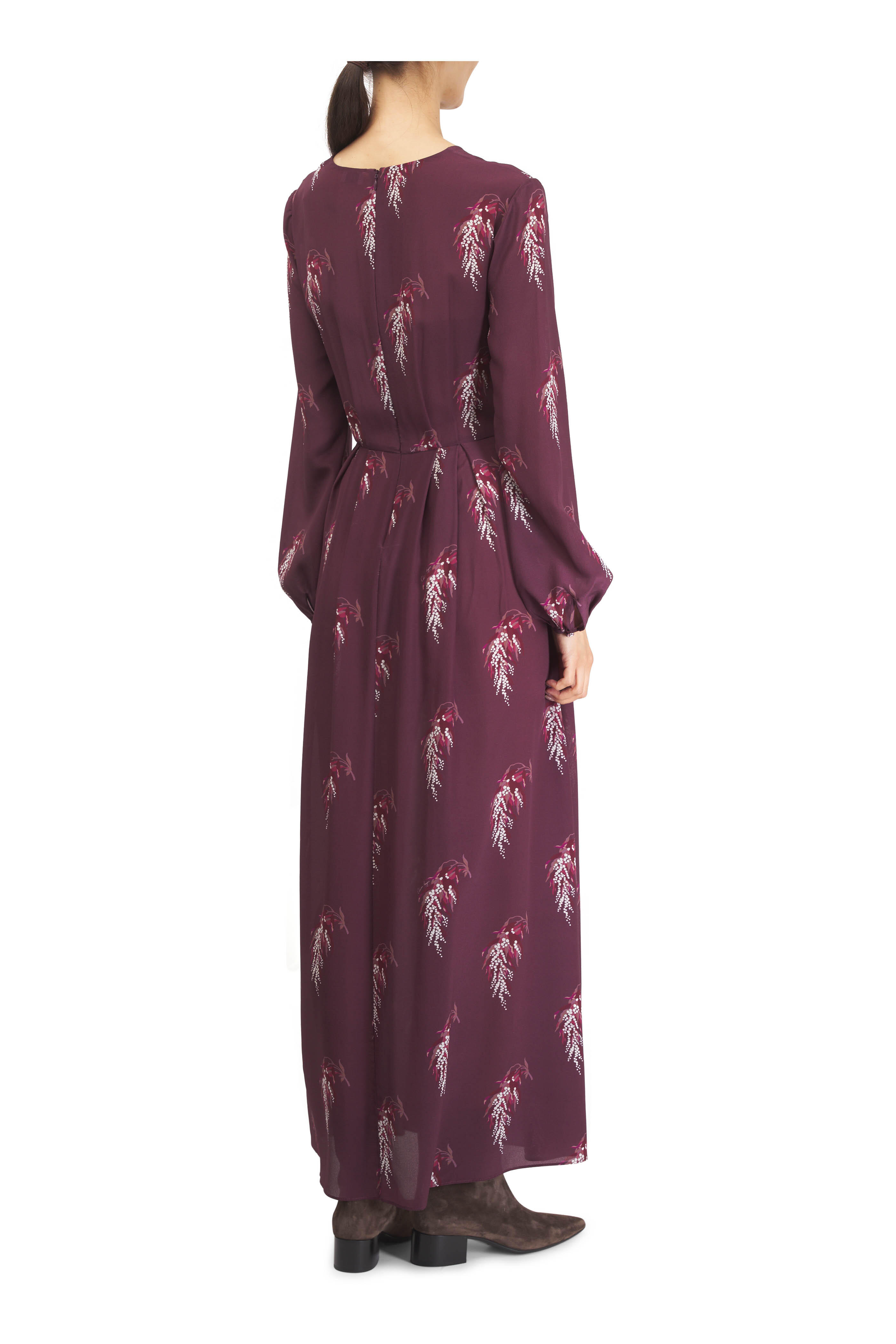 Round neckline. Concealed back zip. Elasticized cuffs. Side slip pockets. Made in USA. 55" shoulder to hem. 100% silk. Dry clean.