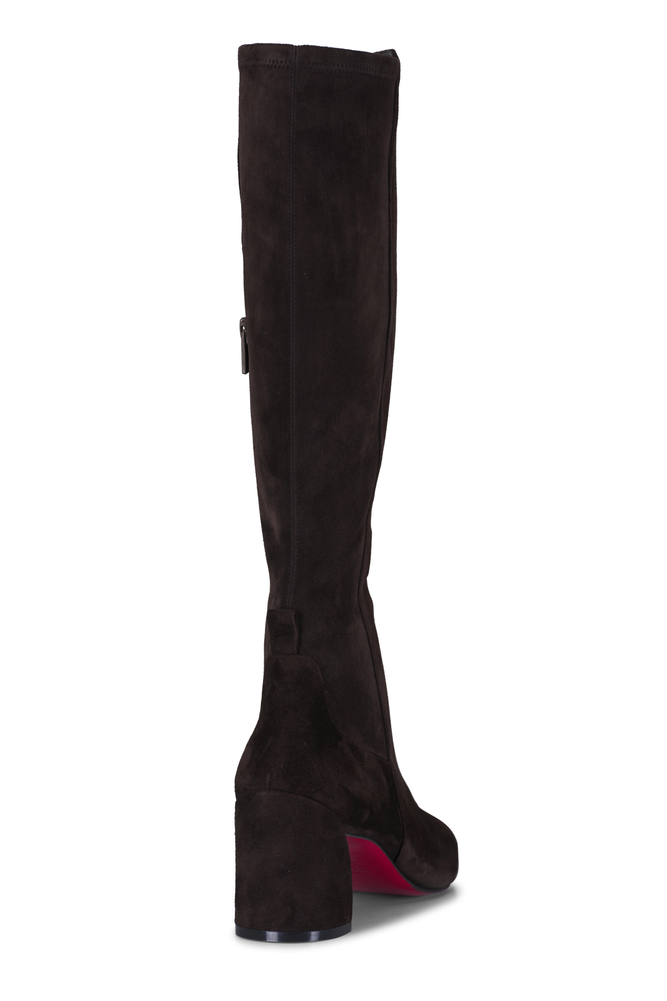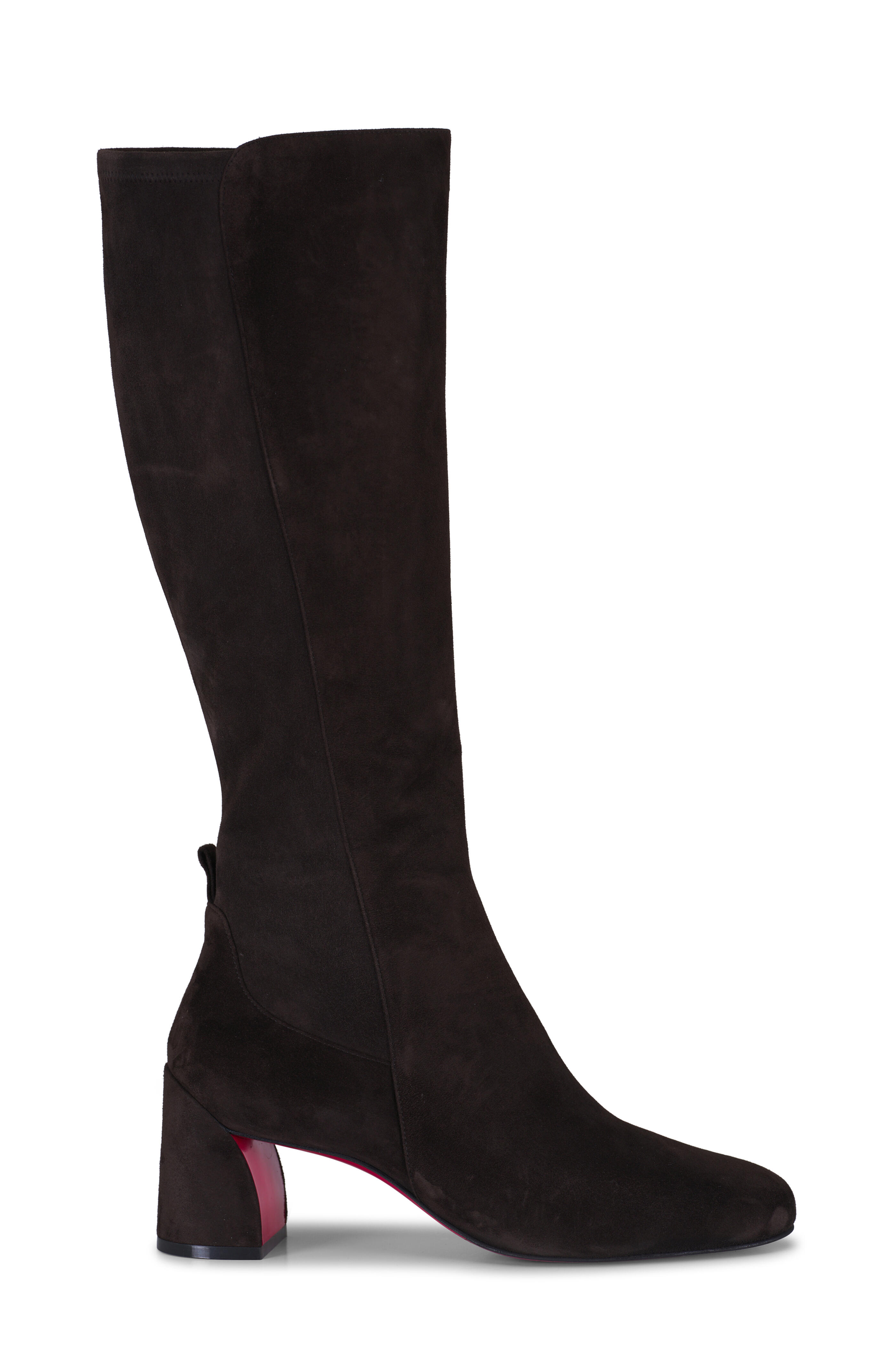 Suede upper. Round toe. Slip-on style. Side zip closure. Pull-on style; pull-tabs. Leather lining and insole. Signature red sole. Made in Italy. Heel measurement: 55mm.