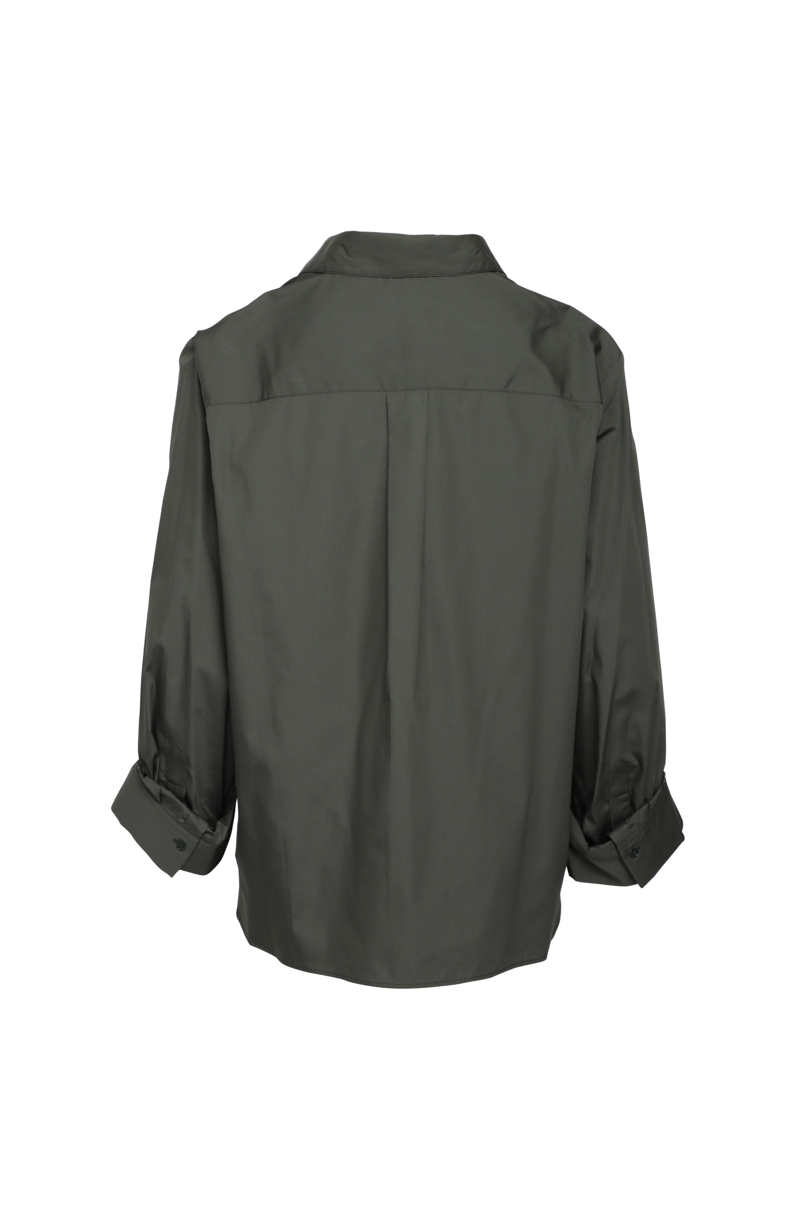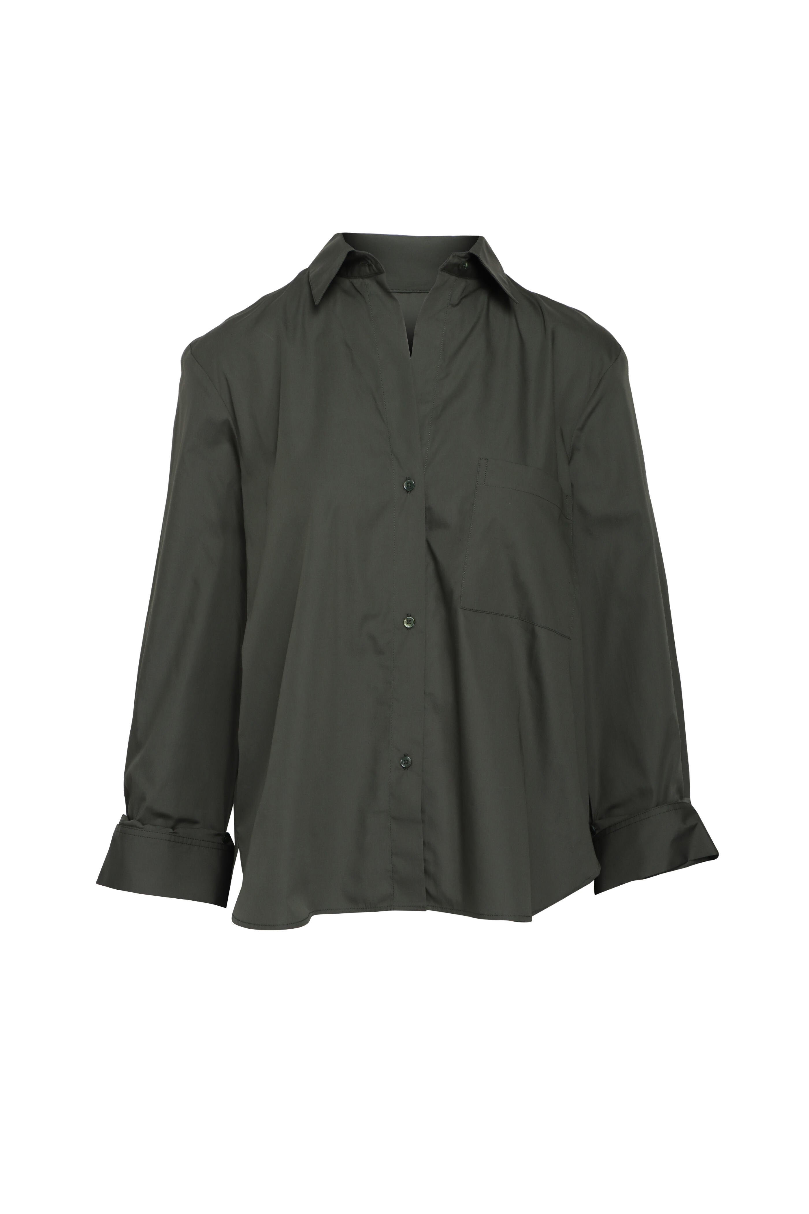 Collar. Long sleeves; button cuffs. Button front closure. Single chest patch pocket. Relaxed fit. Imported. Bust 34.5” (Size S). Hip 37” (Size S). 100% cotton. Machine washable.