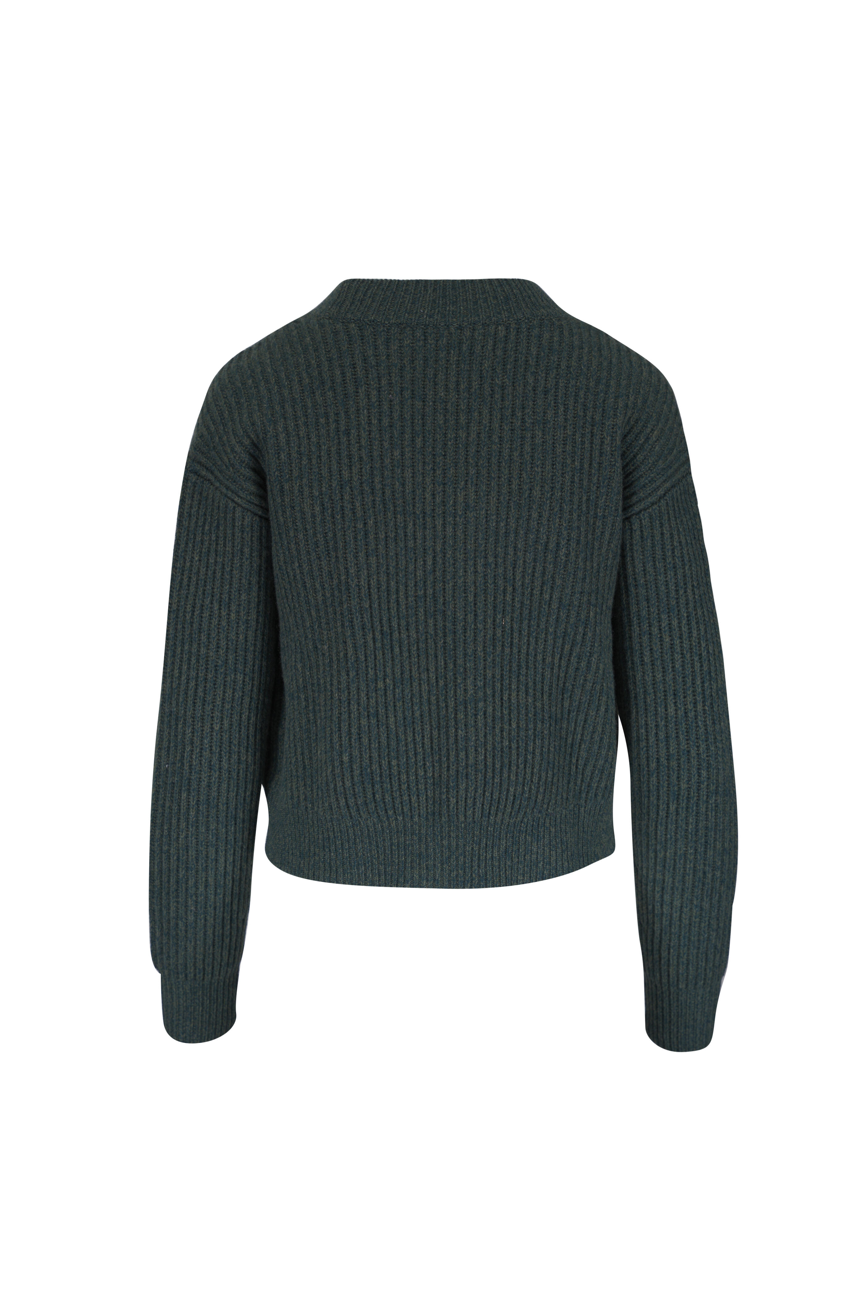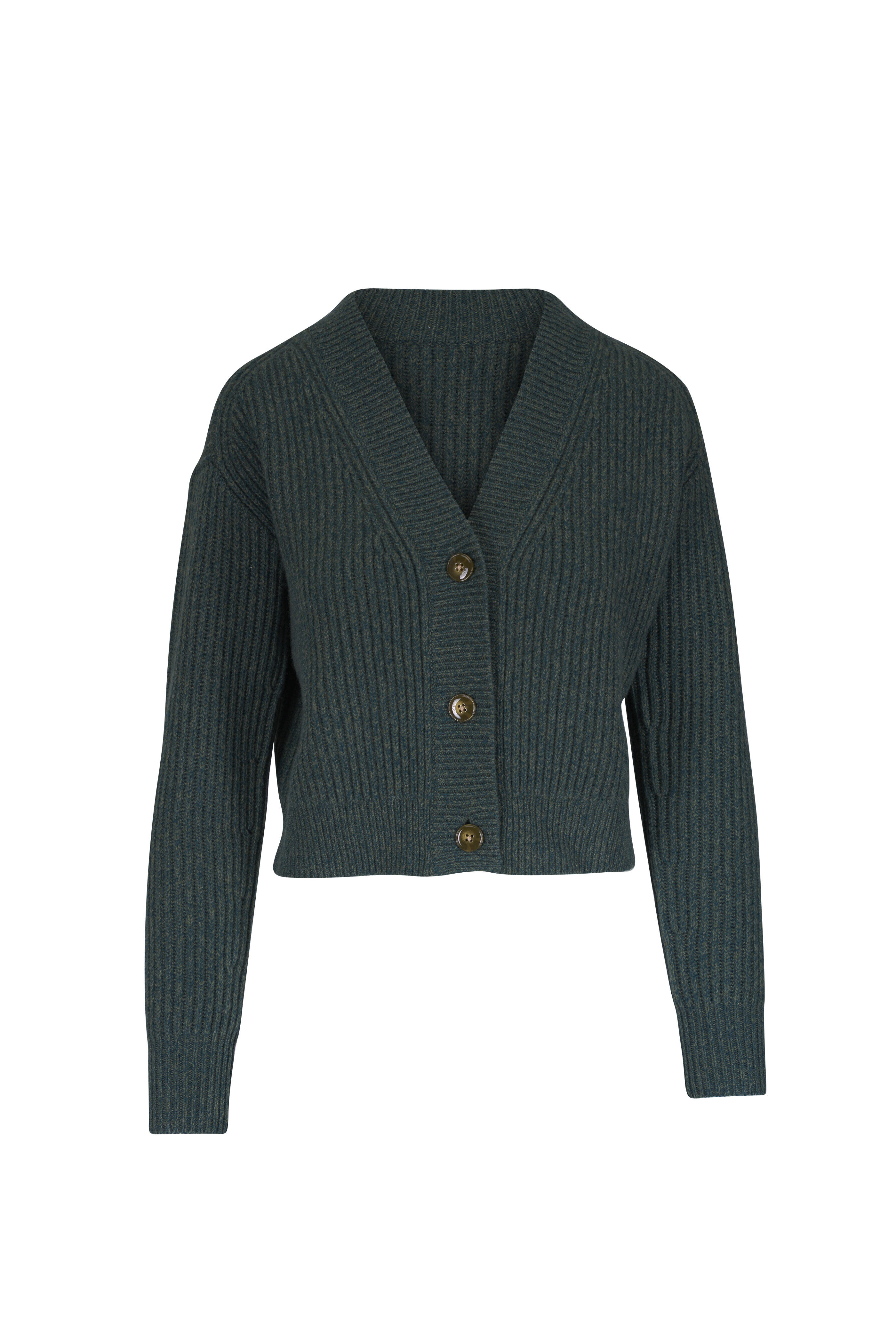 V-neckline. Front button placket. Ribbed throughout. Imported. Color: Duffle Bag. Approximately 20" shoulder to hem (measurements taken from size XS). 100% cashmere. Dry clean.