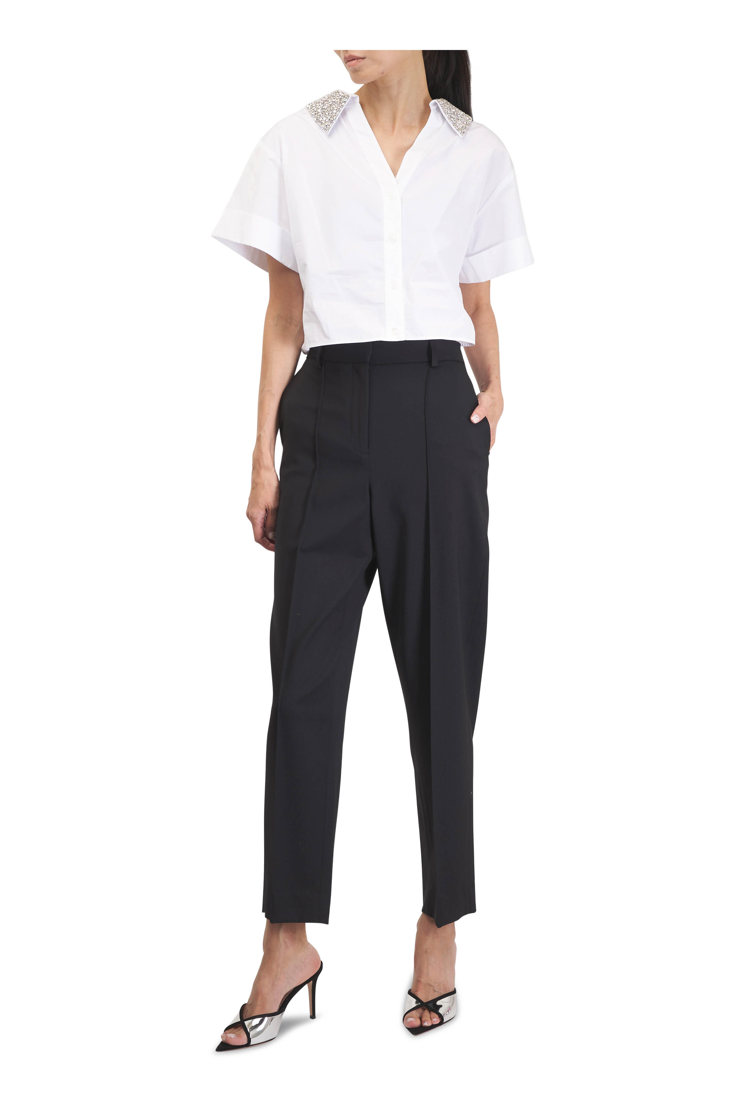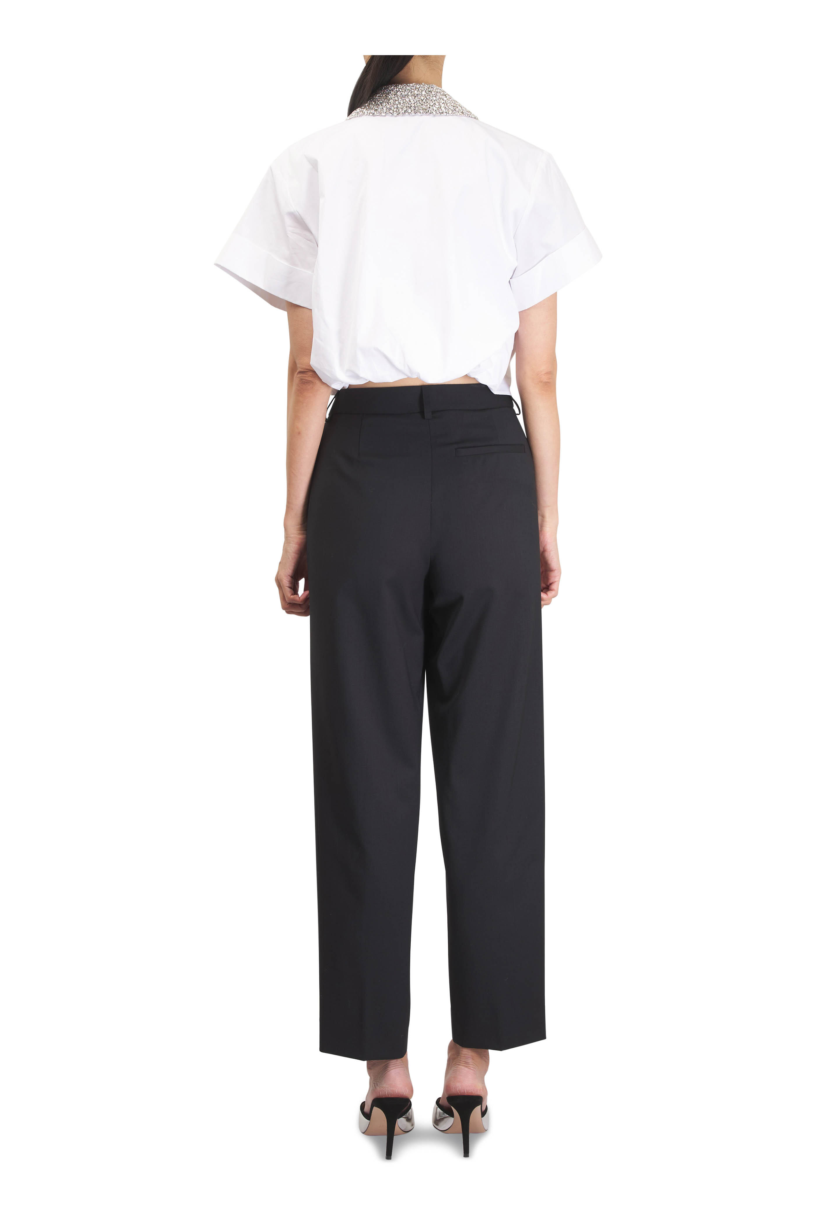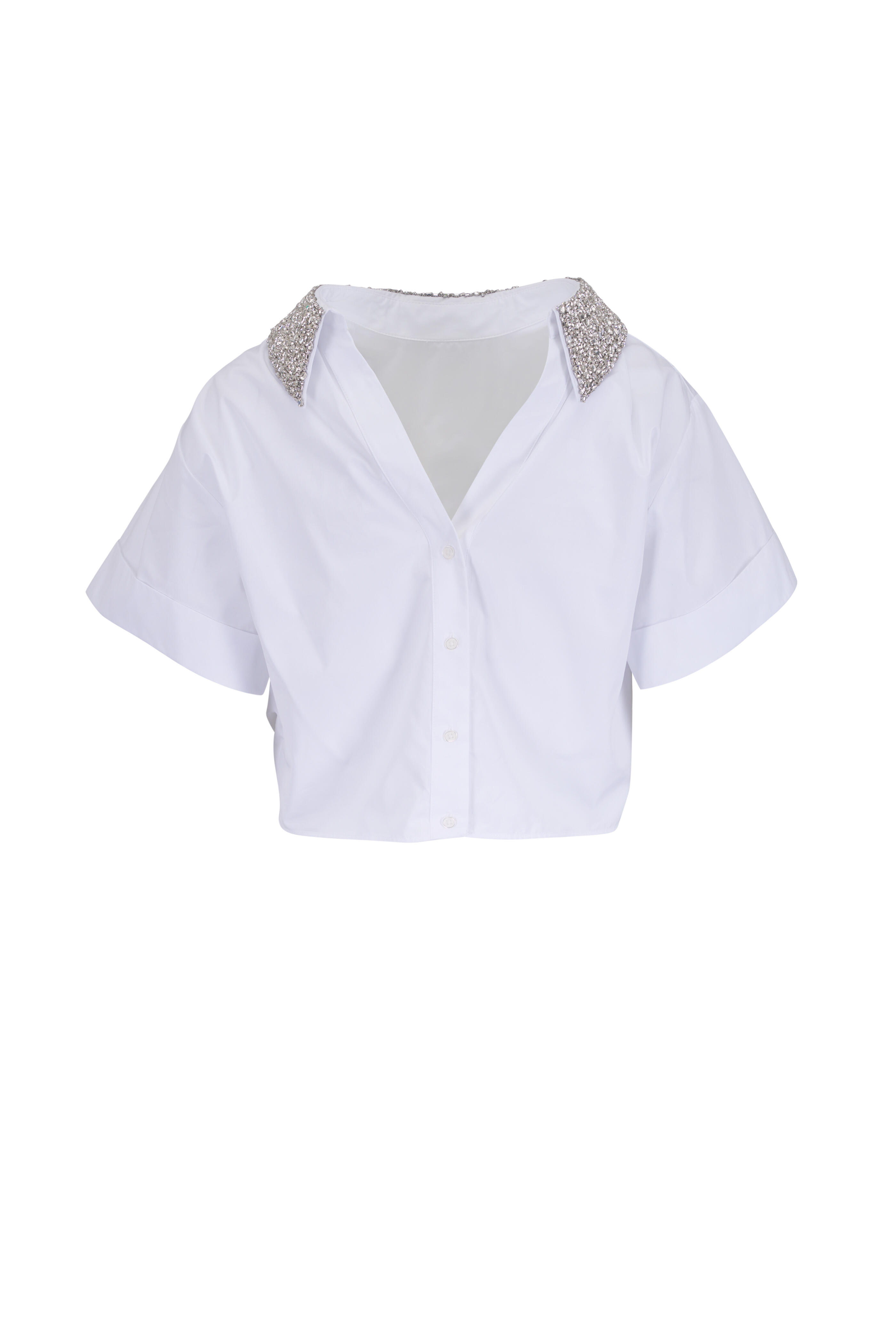Specialist clean. Can be worn front to back. Embellished wide neckline. Open back with button placket. Cuffed short sleeves. Cinched at waist. Cropped hem. Made in the USA. Approximately 18" shoulder to hem (measurements taken from size XS/S). 100% cotton.