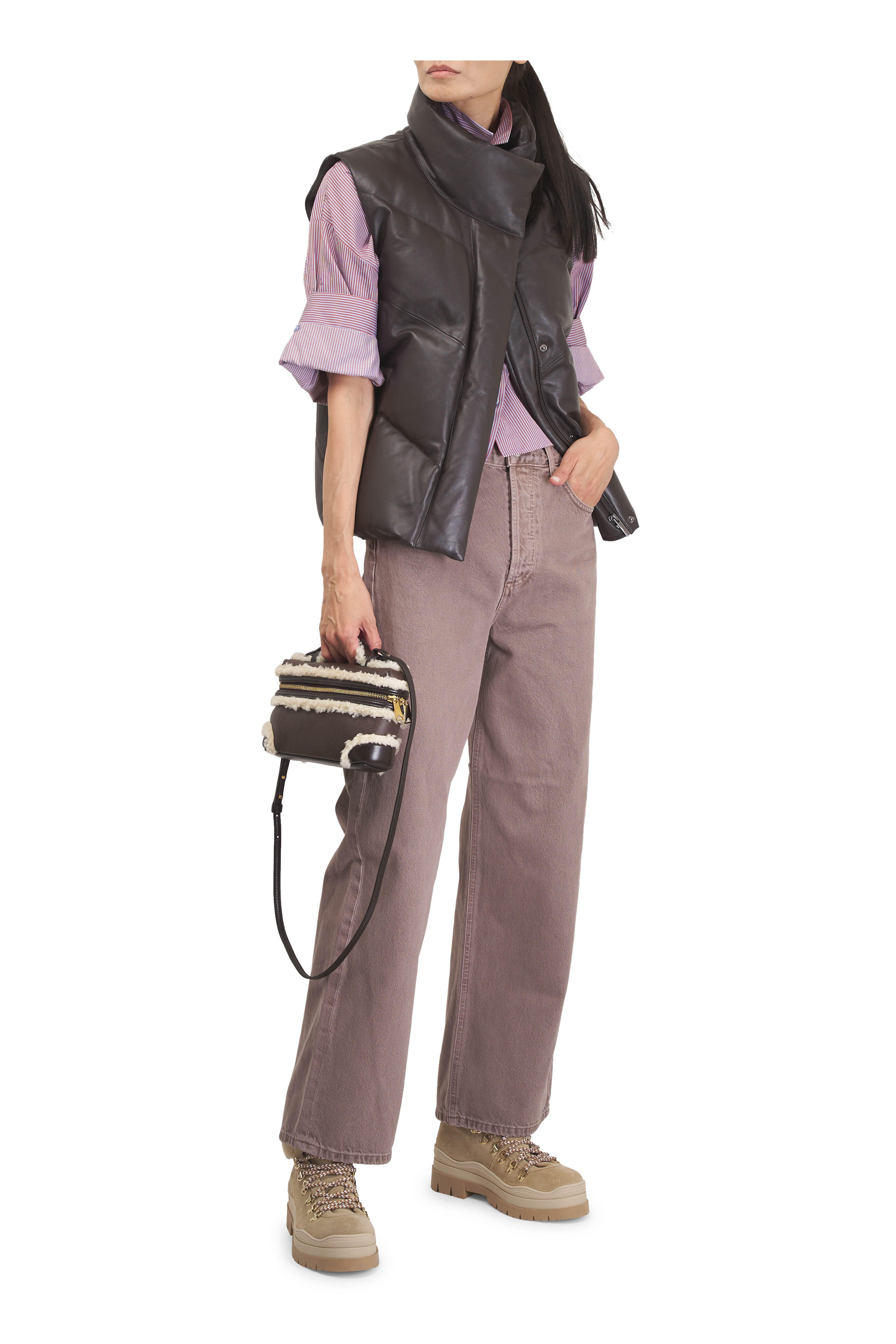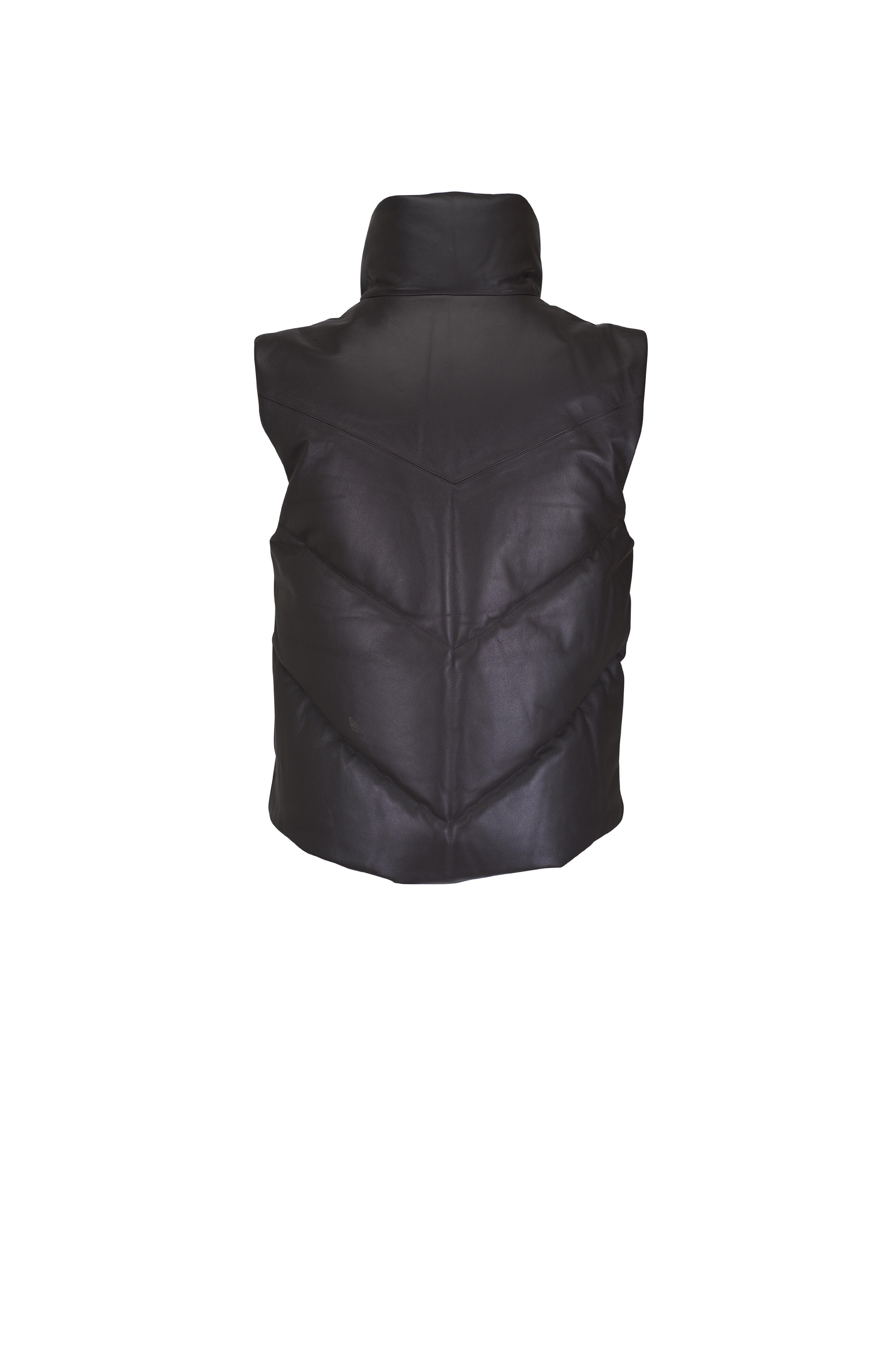 Specialist clean. Stand collar with asymmetrical snap button closure. Concealed zip placket; concealed snap button placket. Side concealed snap button slip pockets. Interior adjustable drawstring at waist. Imported. Approximately 22" shoulder to hem (measurements taken from size XS). 100% lambskin leather; lining: 100% silk; fill: 90% goose down, 10% feather.