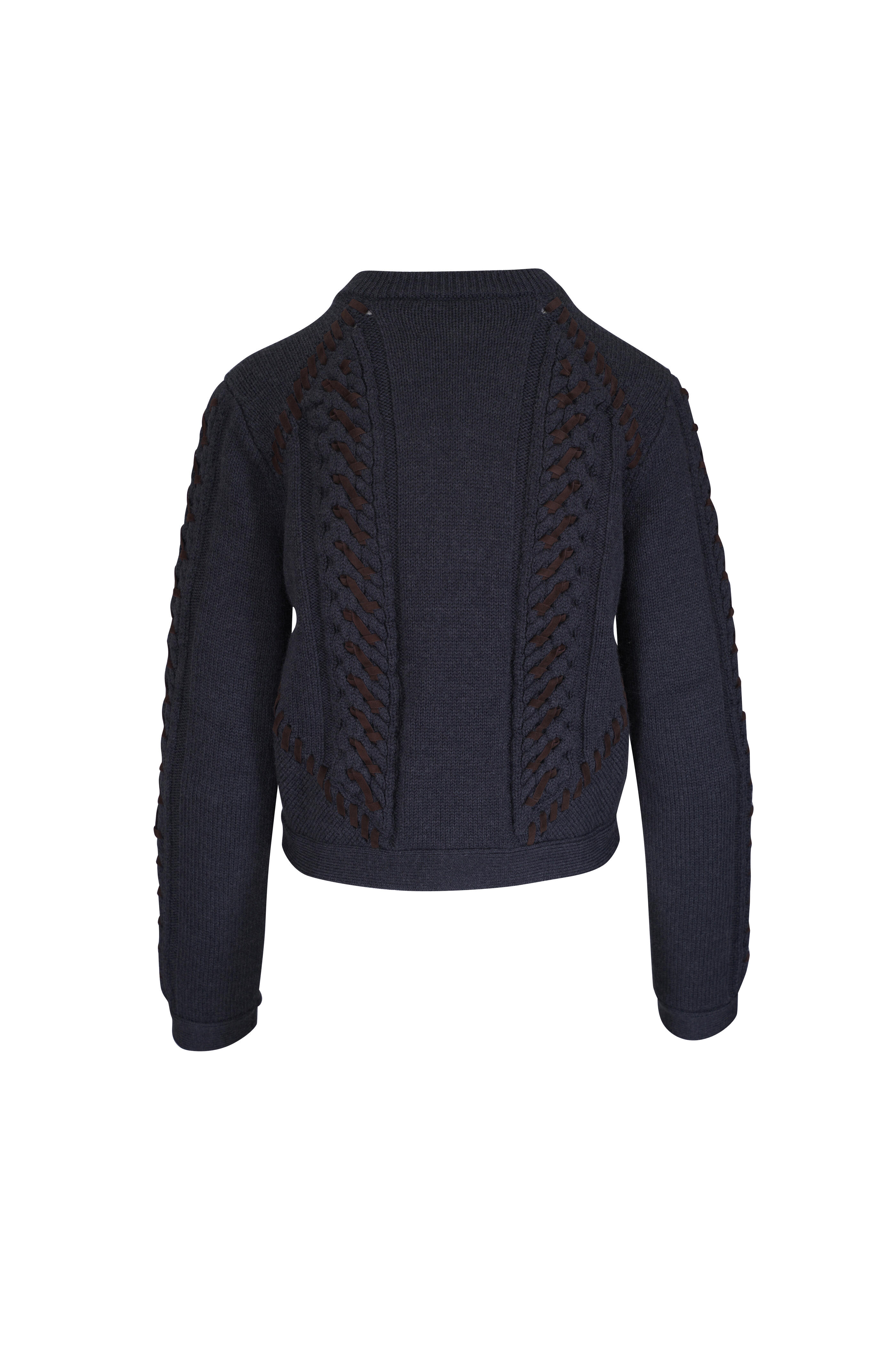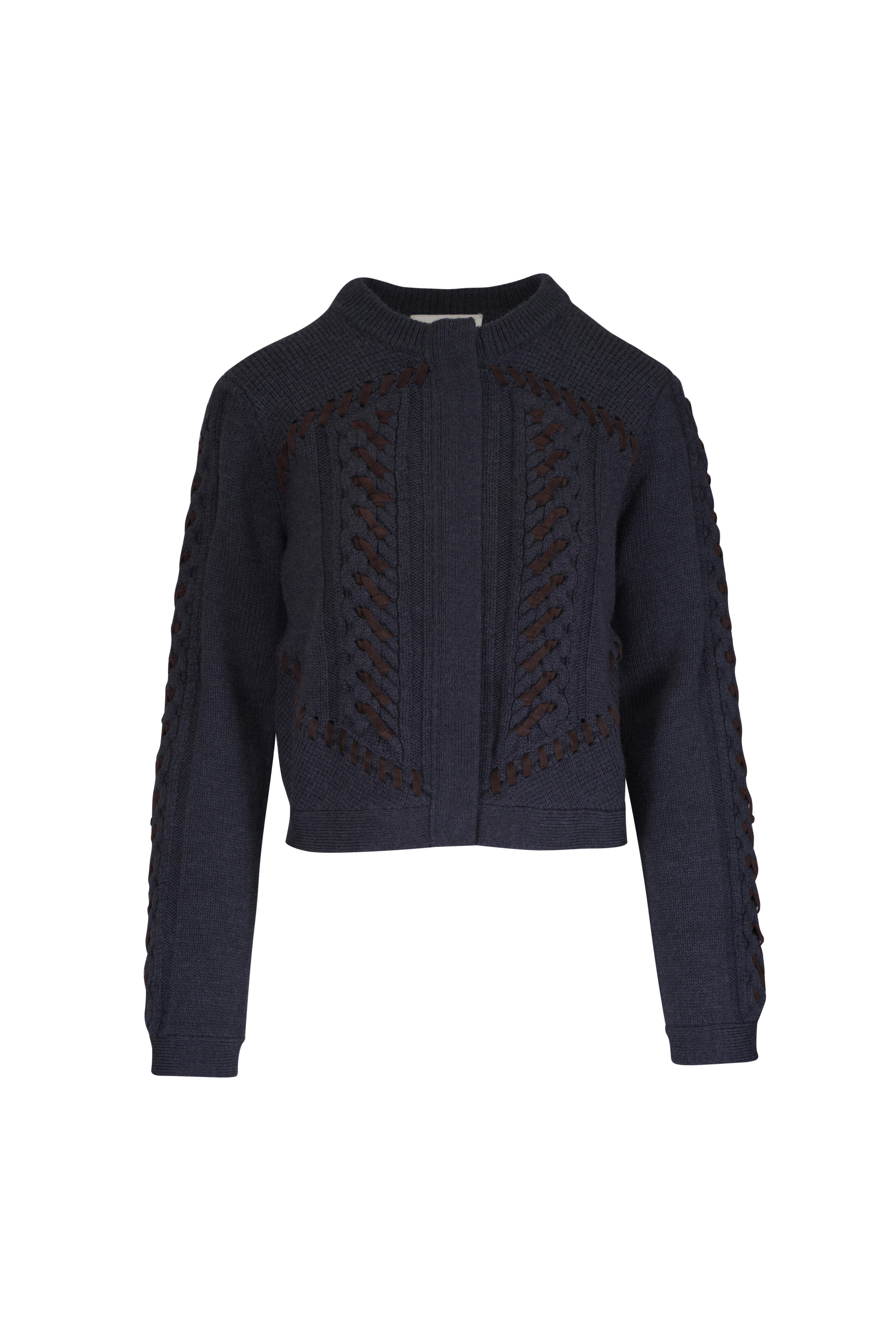 Specialist clean. Crew neckline. Concealed front zip placket; hook-and-eye closure at neck. Embellished with woven suede. Ribbed knit trim. Imported. Approximately 21" shoulder to hem (measurements taken from size S). 100% merino wool; trim: 100% lambskin leather.