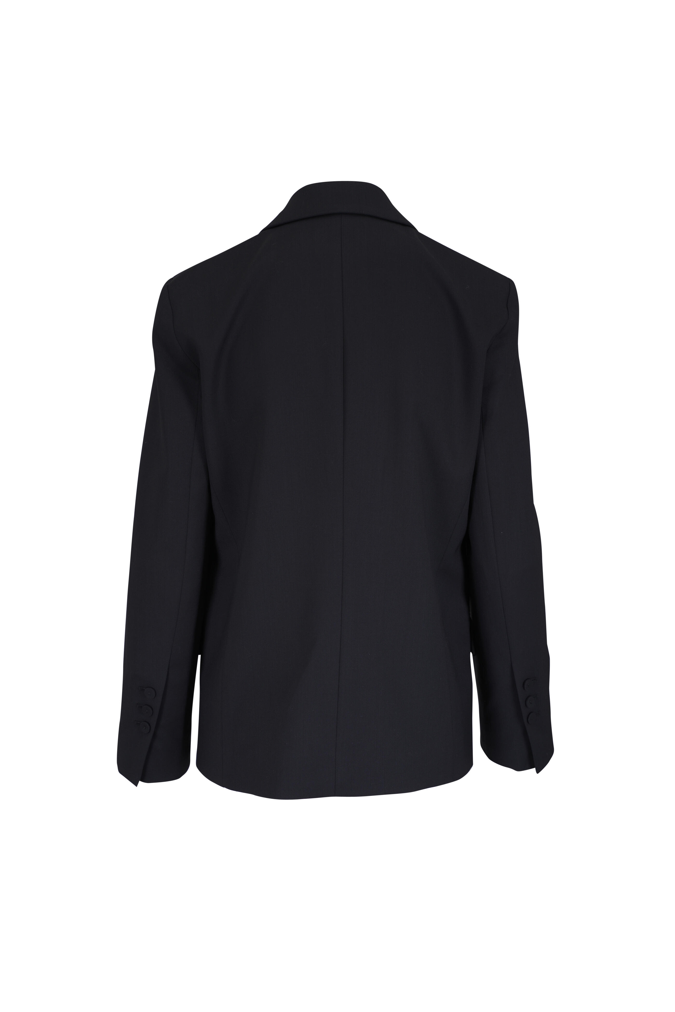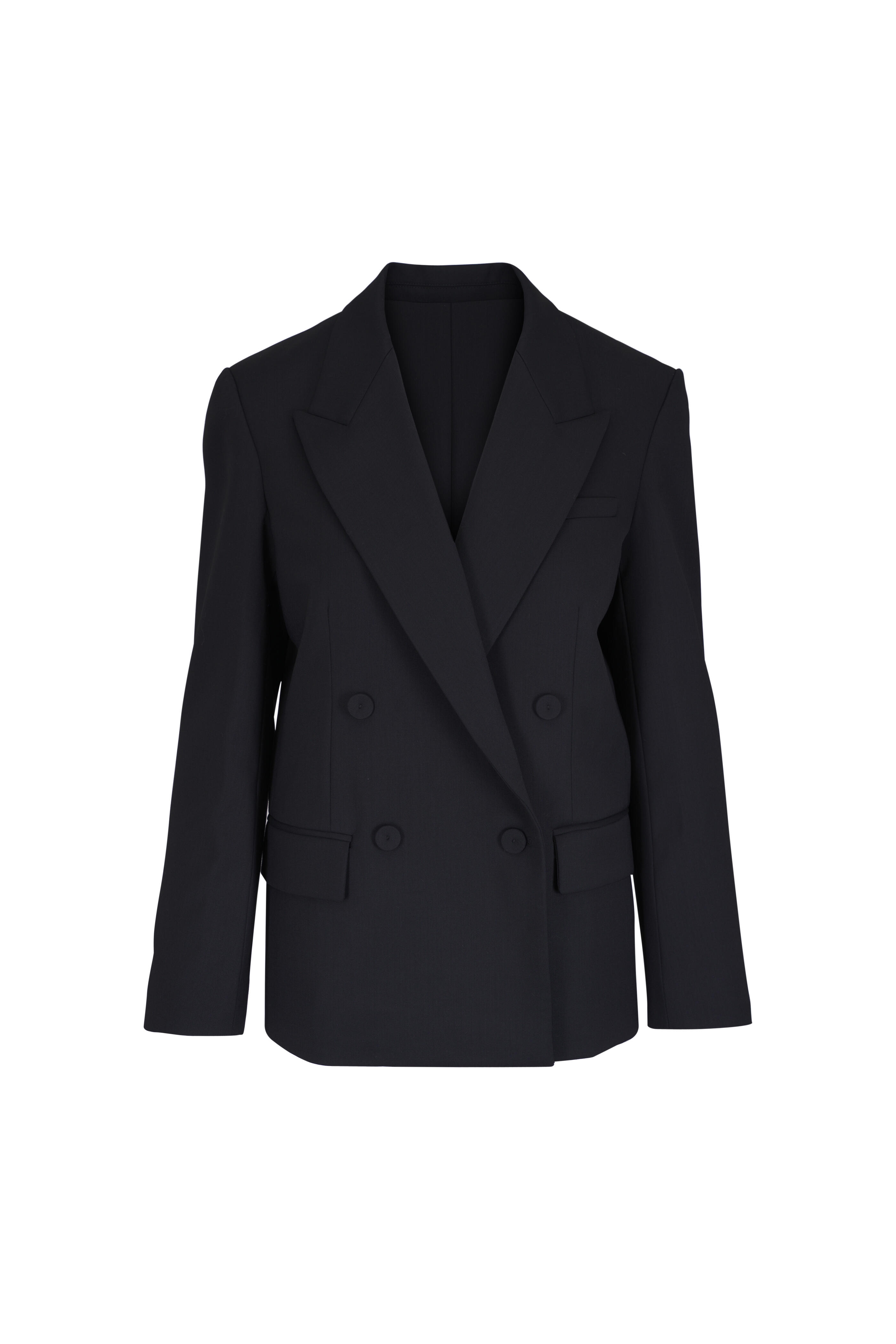 Peak lapels. Double breasted; single button closure. Chest welt pocket; Lower flap pockets; internal slip pockets. Three button square cuffs. Straight hem. Made in Italy. Shoulder to hem 27" (size xs). 98% virgin wool, 2% elastane: fully lined. Dry clean.