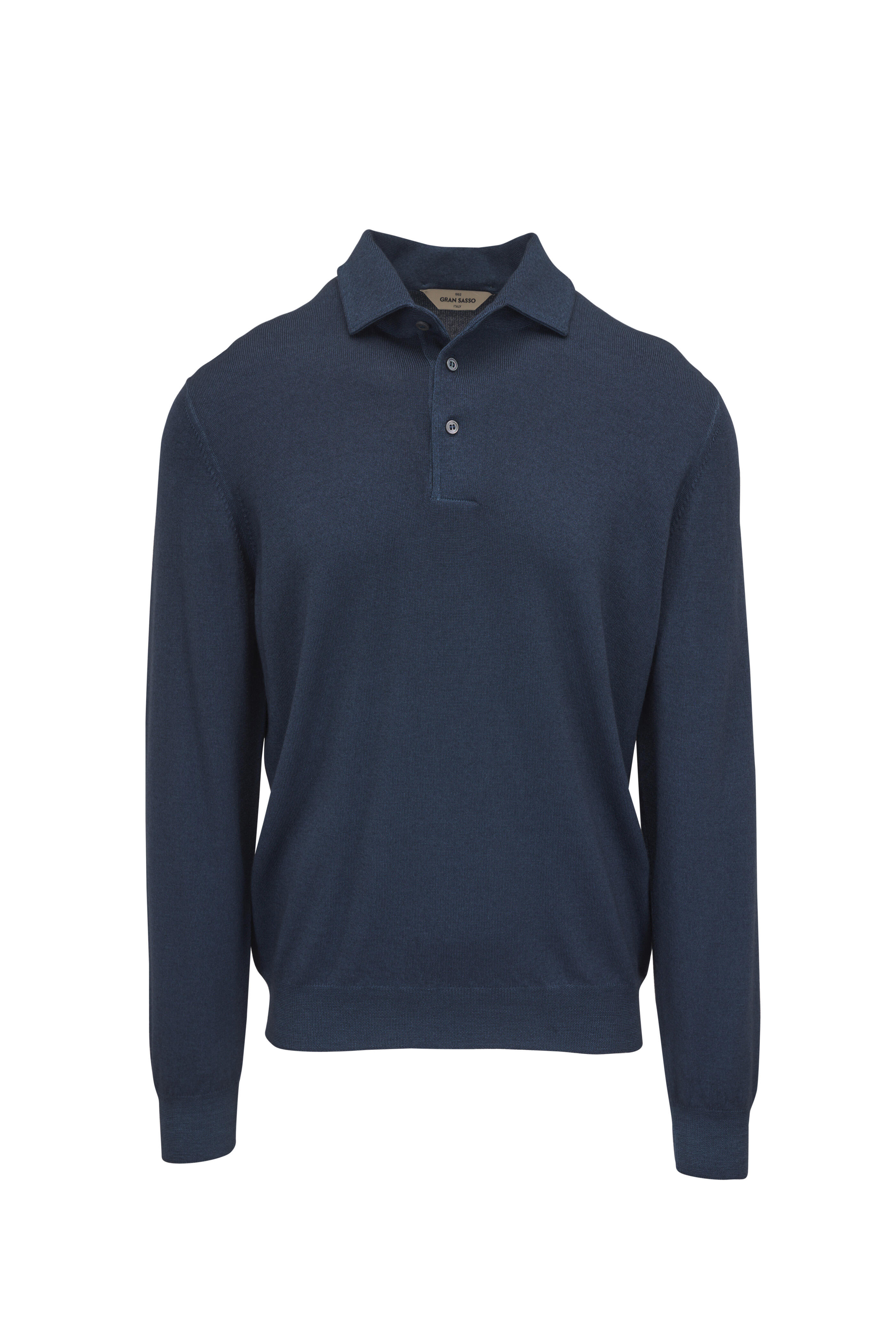 Spread collar. Three button placket. Ribbed trims. Straight hem. Made in Italy. Shoulder to hem 28" (size l). 100% Virgin wool. Hand wash.