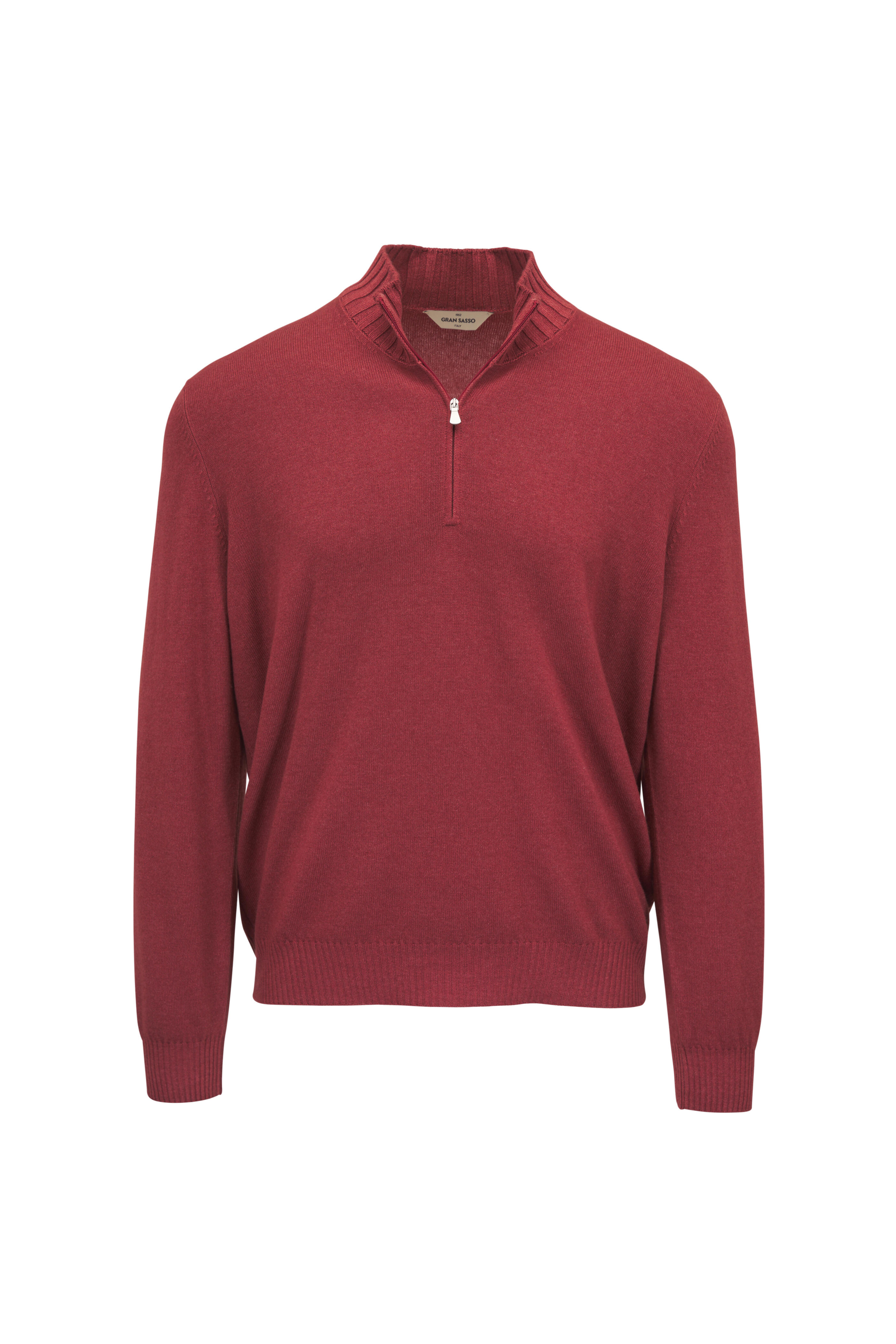 Mock neck. Quarter zip placket. Pullover style. Ribbed trims. Straight hem. Made in Italy. Shoulder to hem 29" (size l). 80% Virgin wool, 10% viscose, 10% cashmere. Hand wash.