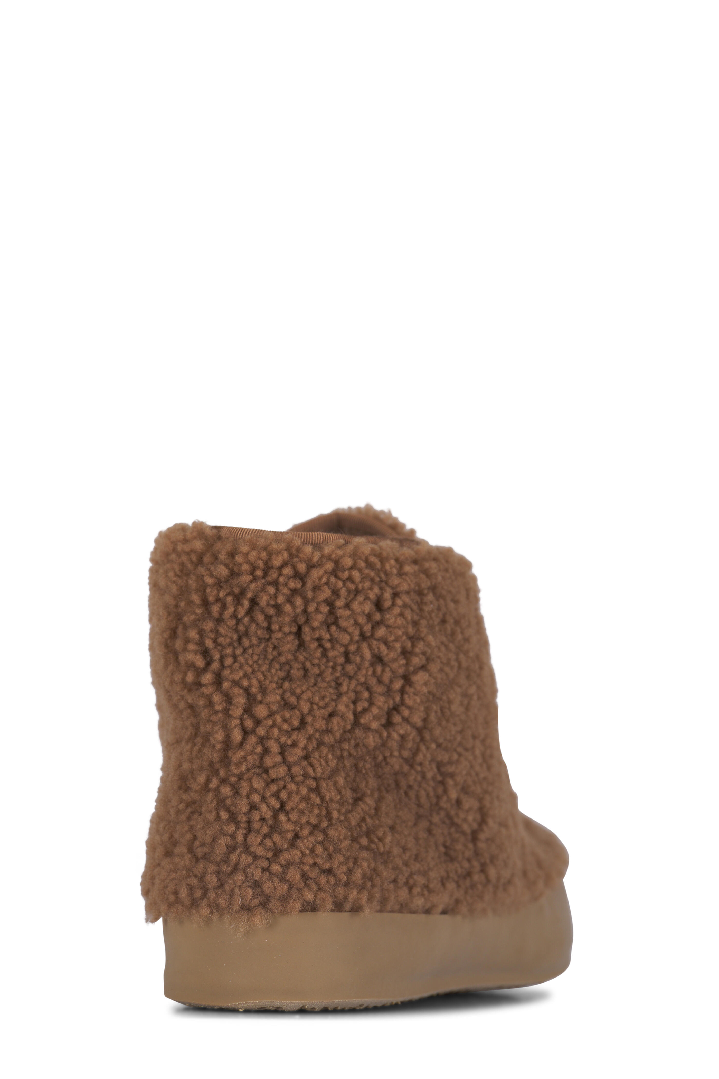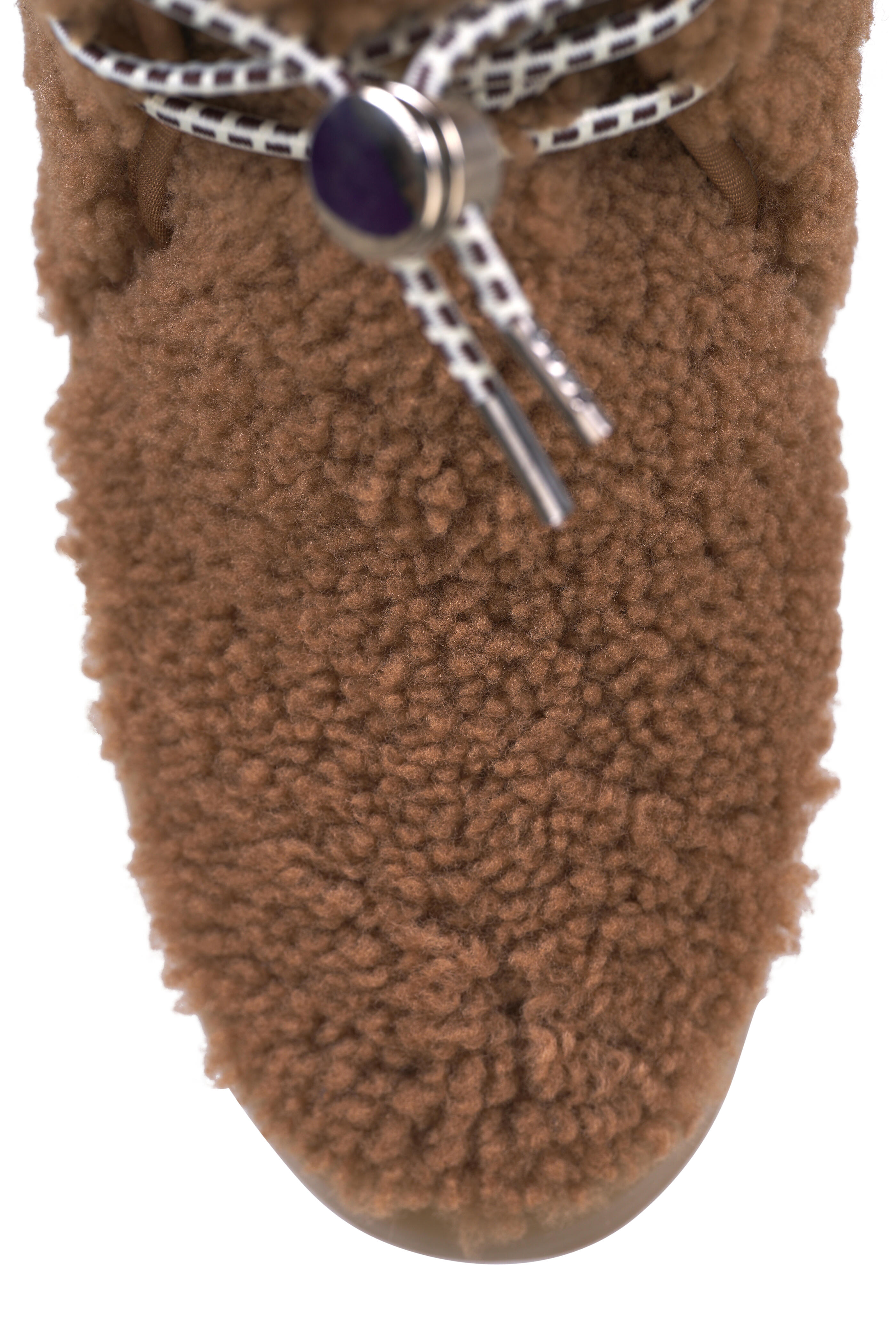 Shearling upper. Round toe. Slip-on style. Adjustable toggle laces. Leather lining & removable shearling insole. Rubber sole. Made in Italy.