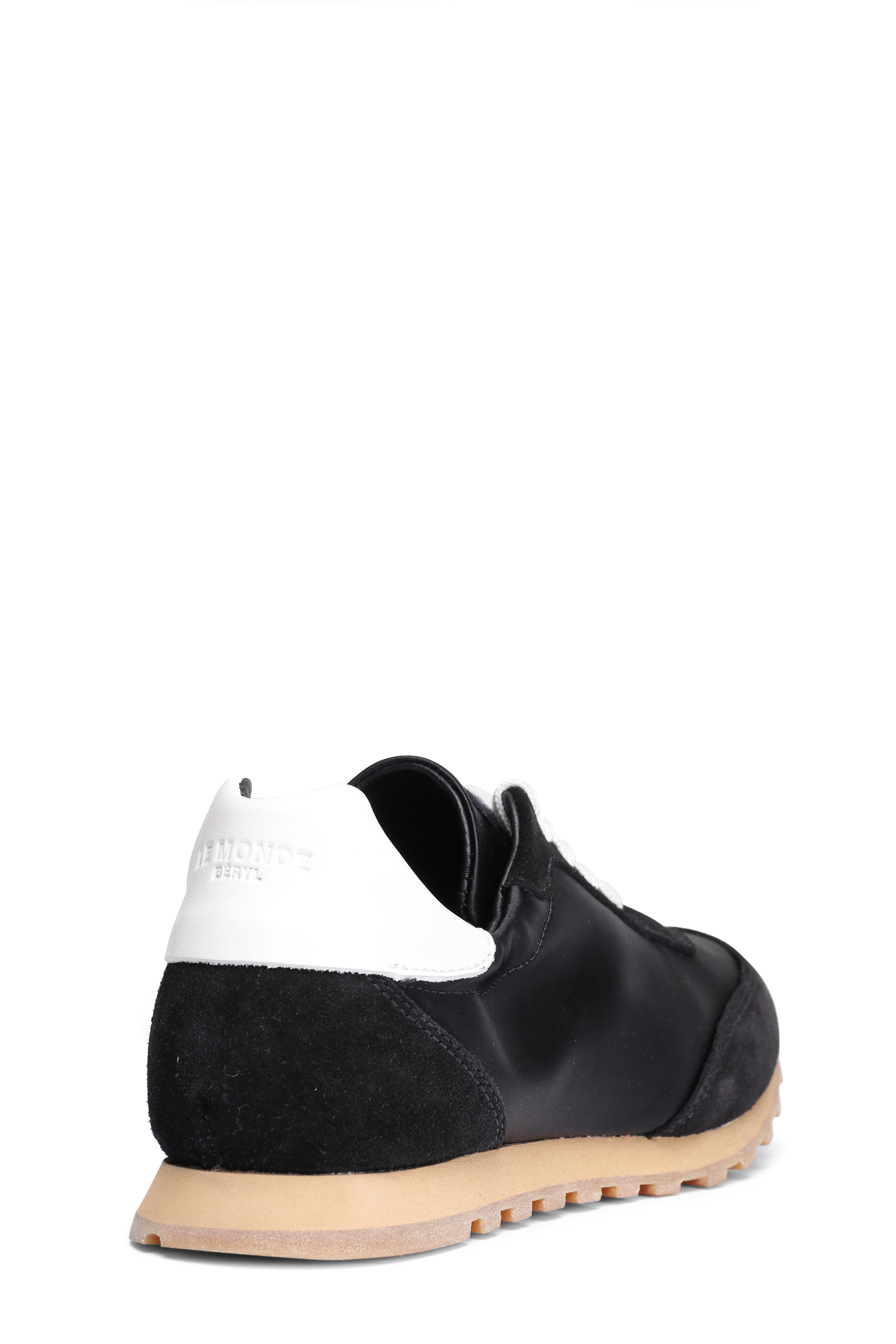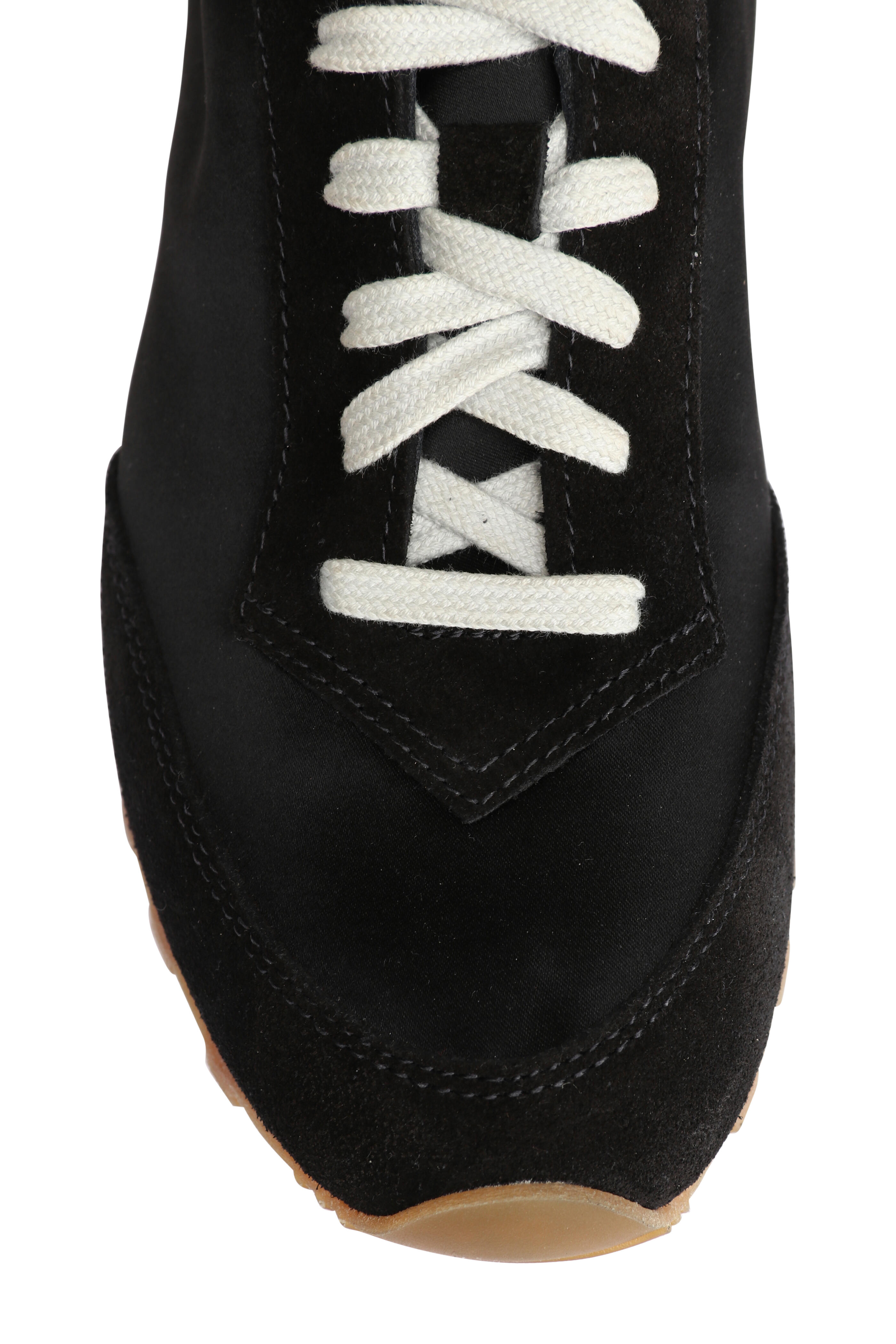 Black satin and suede upper. Goat skin leather lining. Rubber sole. Round toe. Lace-up vamp. Flat fabric laces. Two-tone design. Slip-on style. Made in Italy. This style runs true to size. If you are between sizes, then round up to the next larger size.