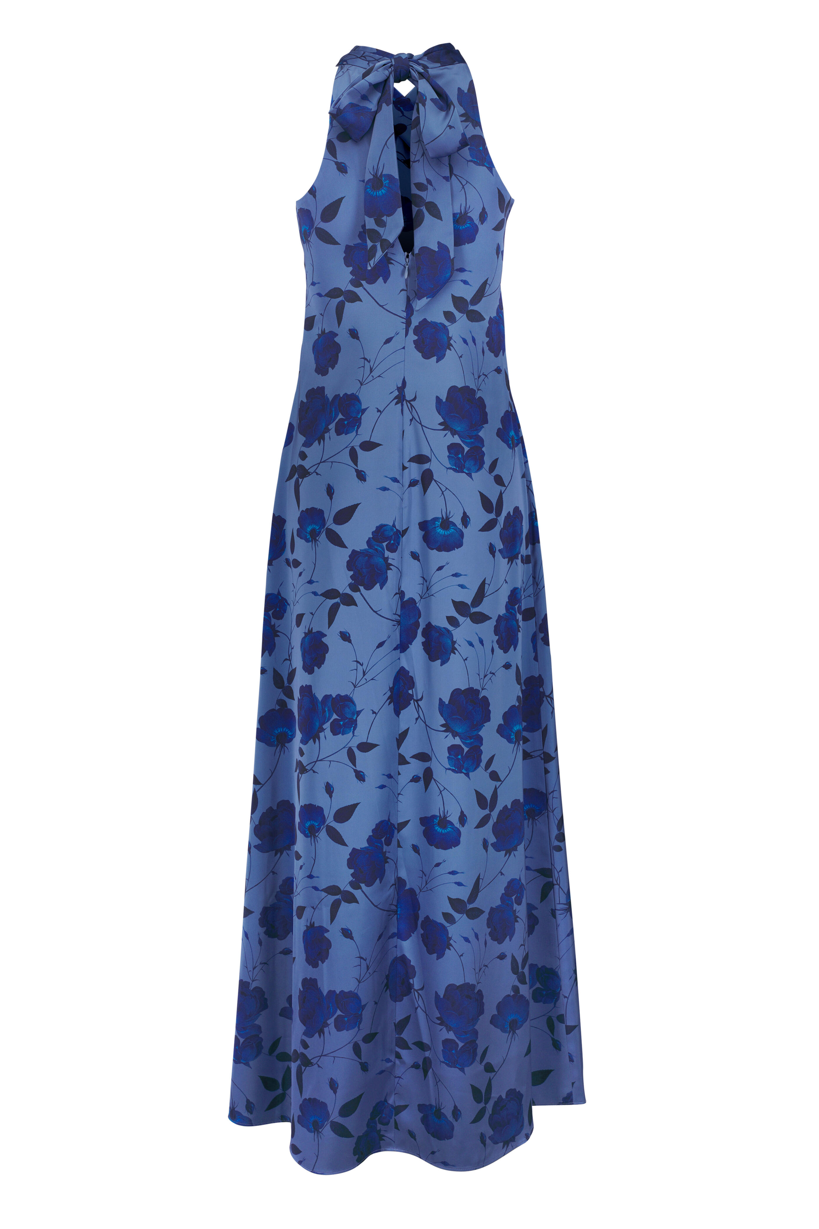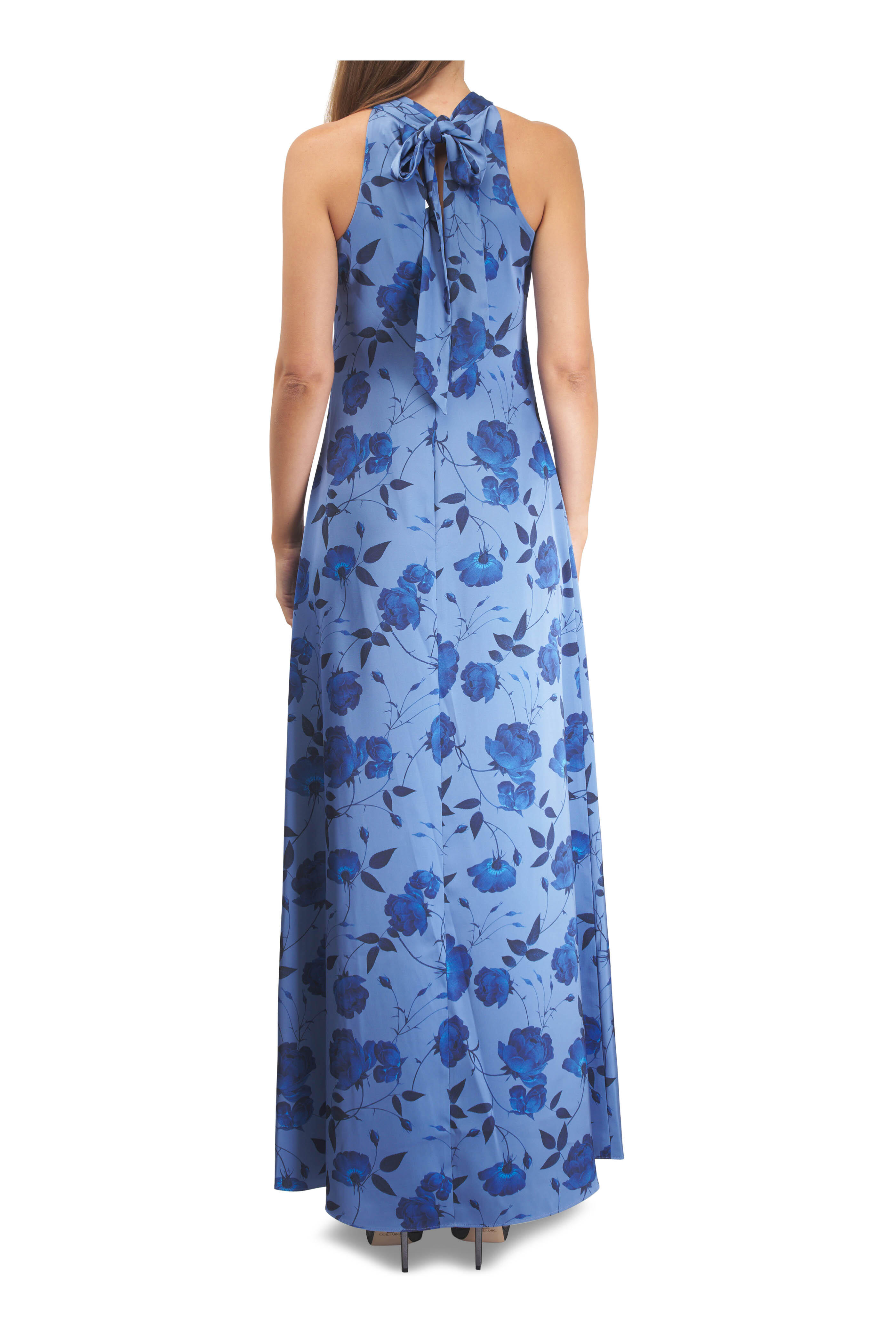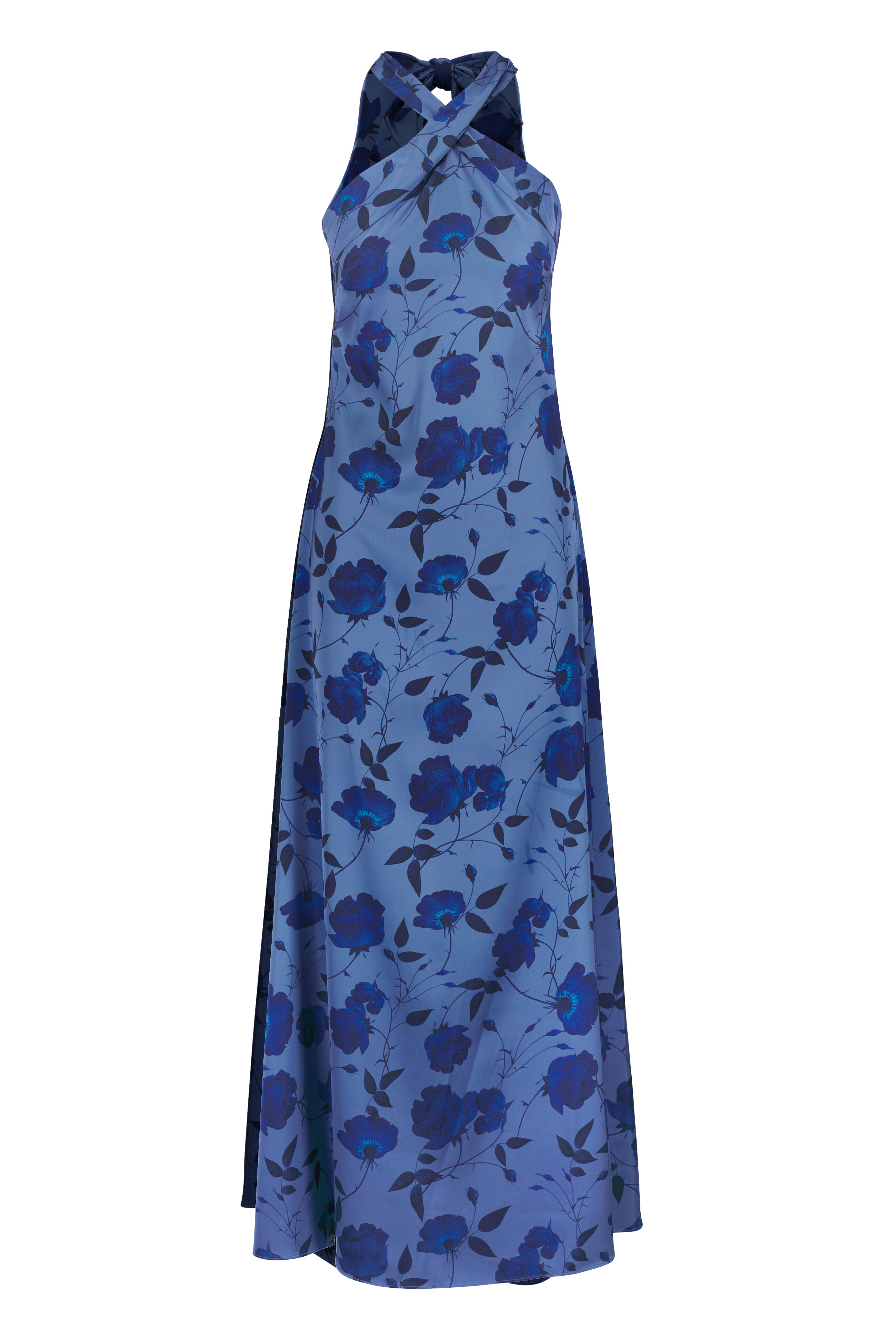 Cross halter neck with self-tie at neck. Concealed back zip. Imported. Approximately 58" shoulder to hem (measurements taken from size 2). 100% polyester. Dry clean.