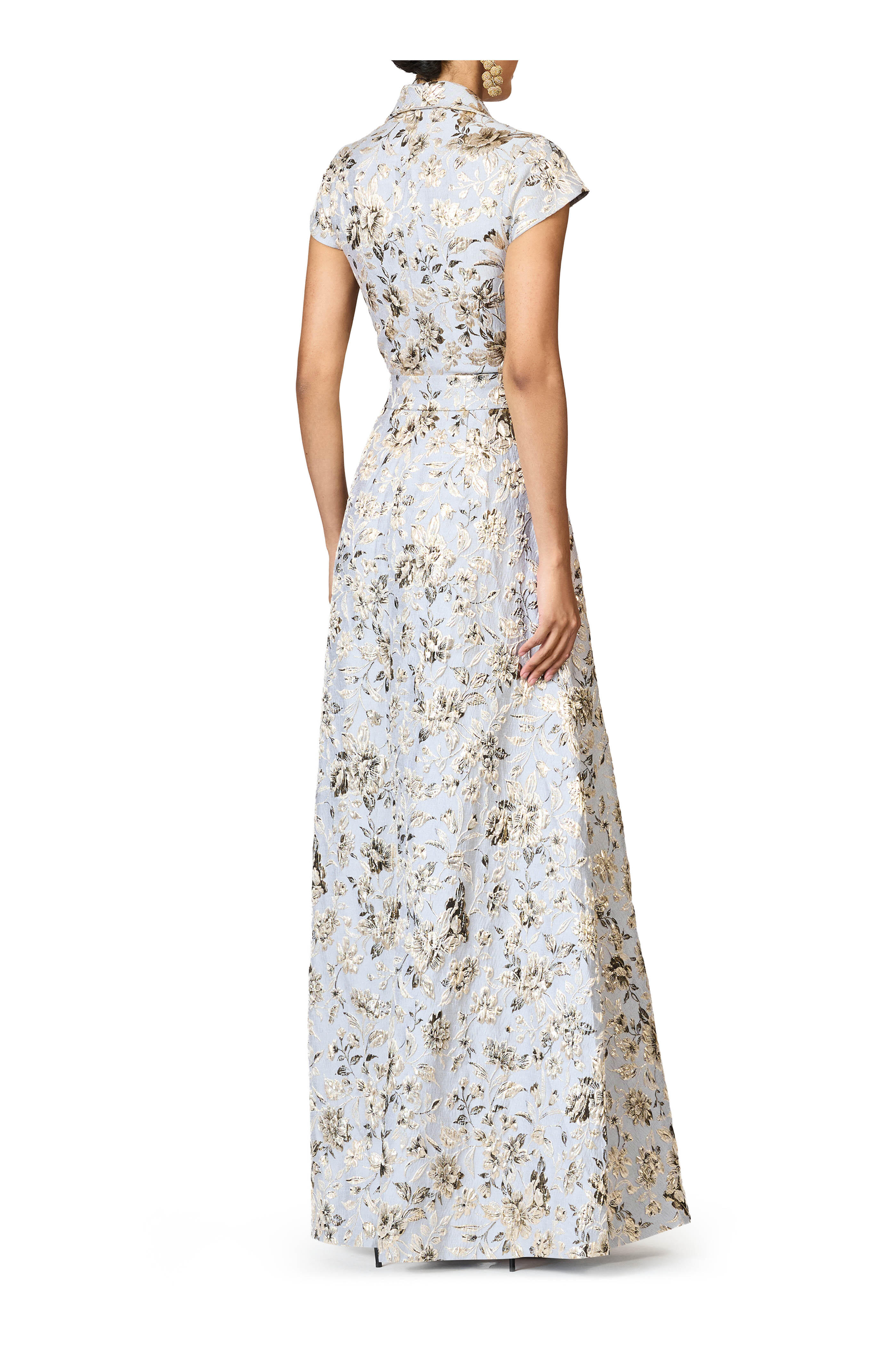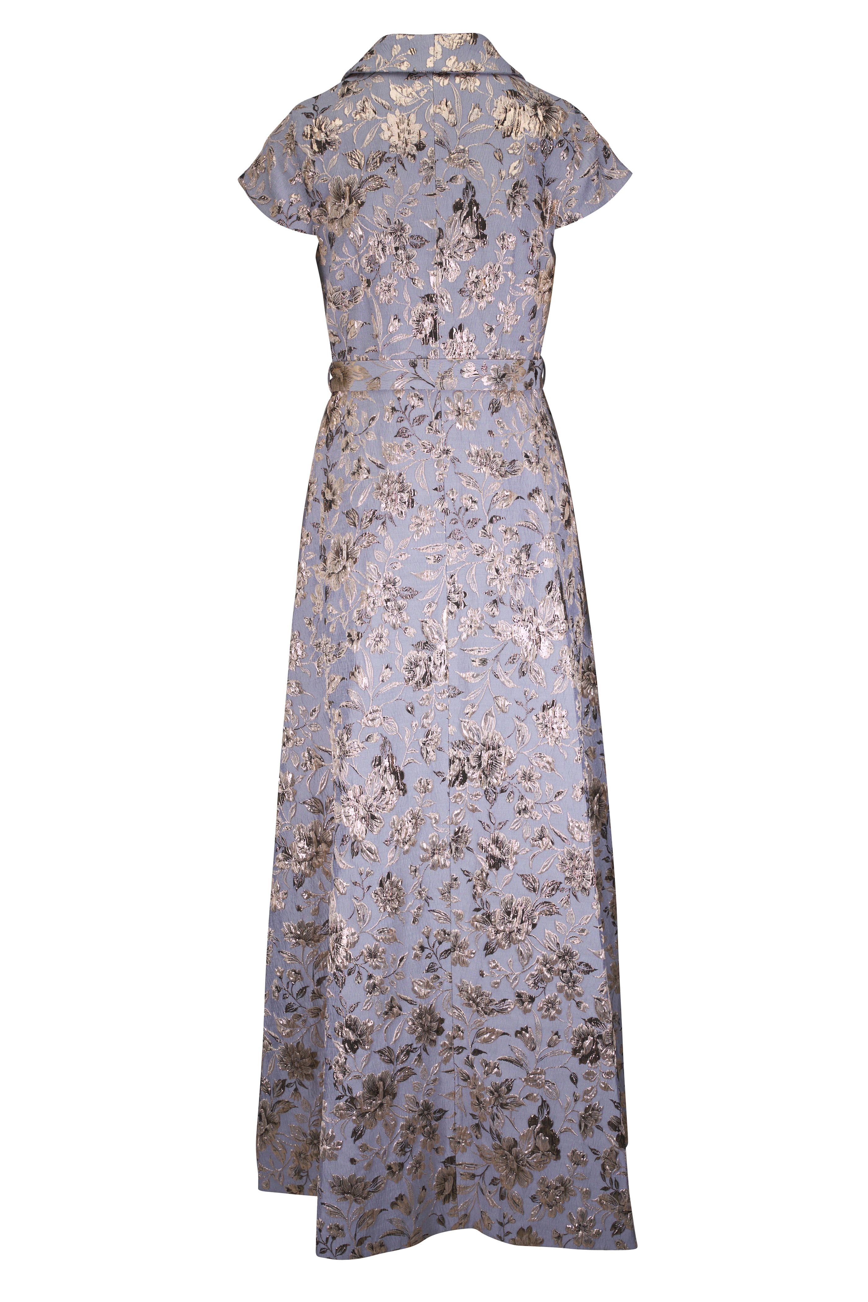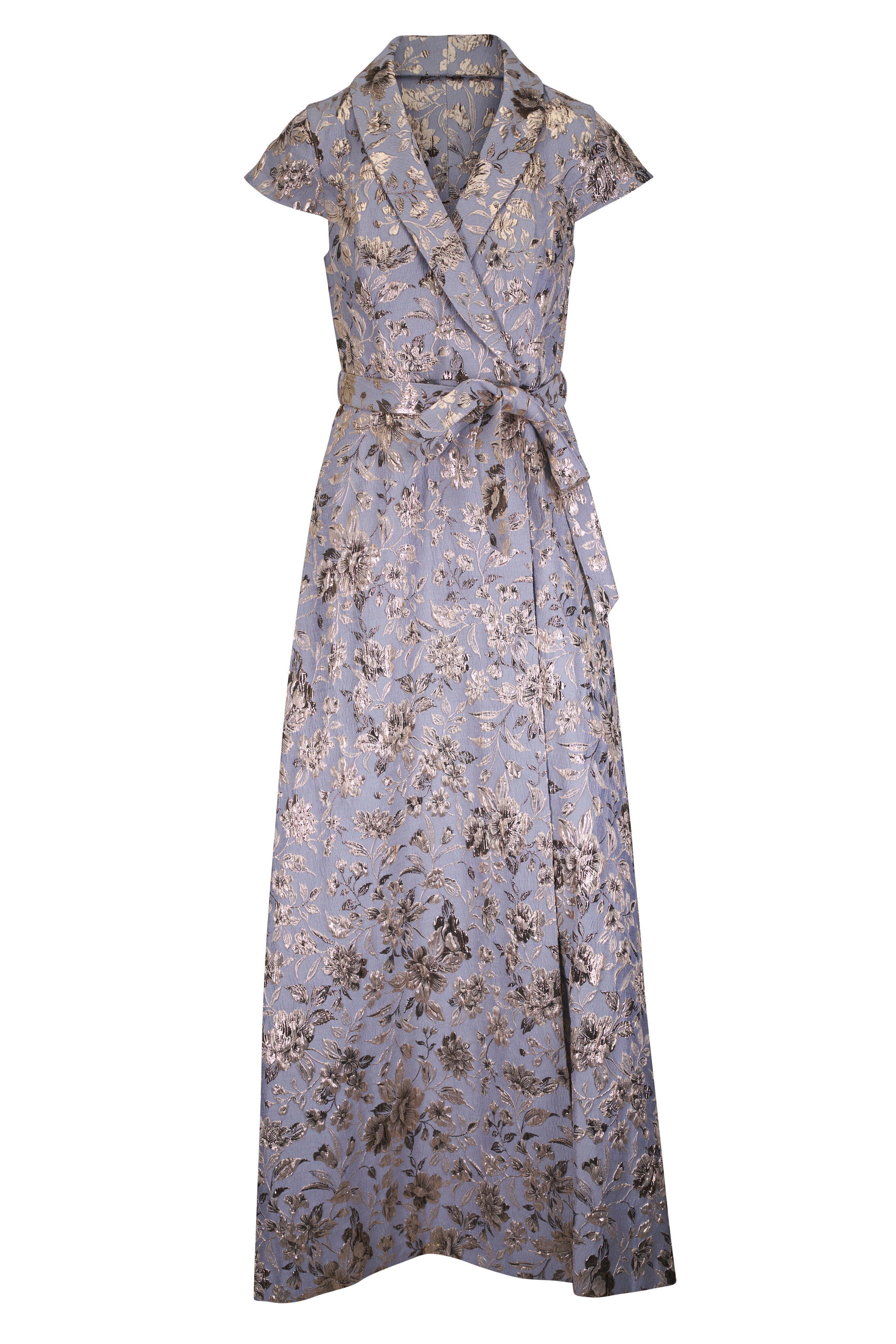 Surplice neckline; shawl collar. Internal button; overlap hook and eye closure. Cap sleeves. Side slip pockets. Metallic jacquard fabrication. Imported. Full-Length, 60 1/2" length. 49% polyester, 25% ramie, 13% metallic, 11% nylon, 2% spandex; fully lined. Dry clean.