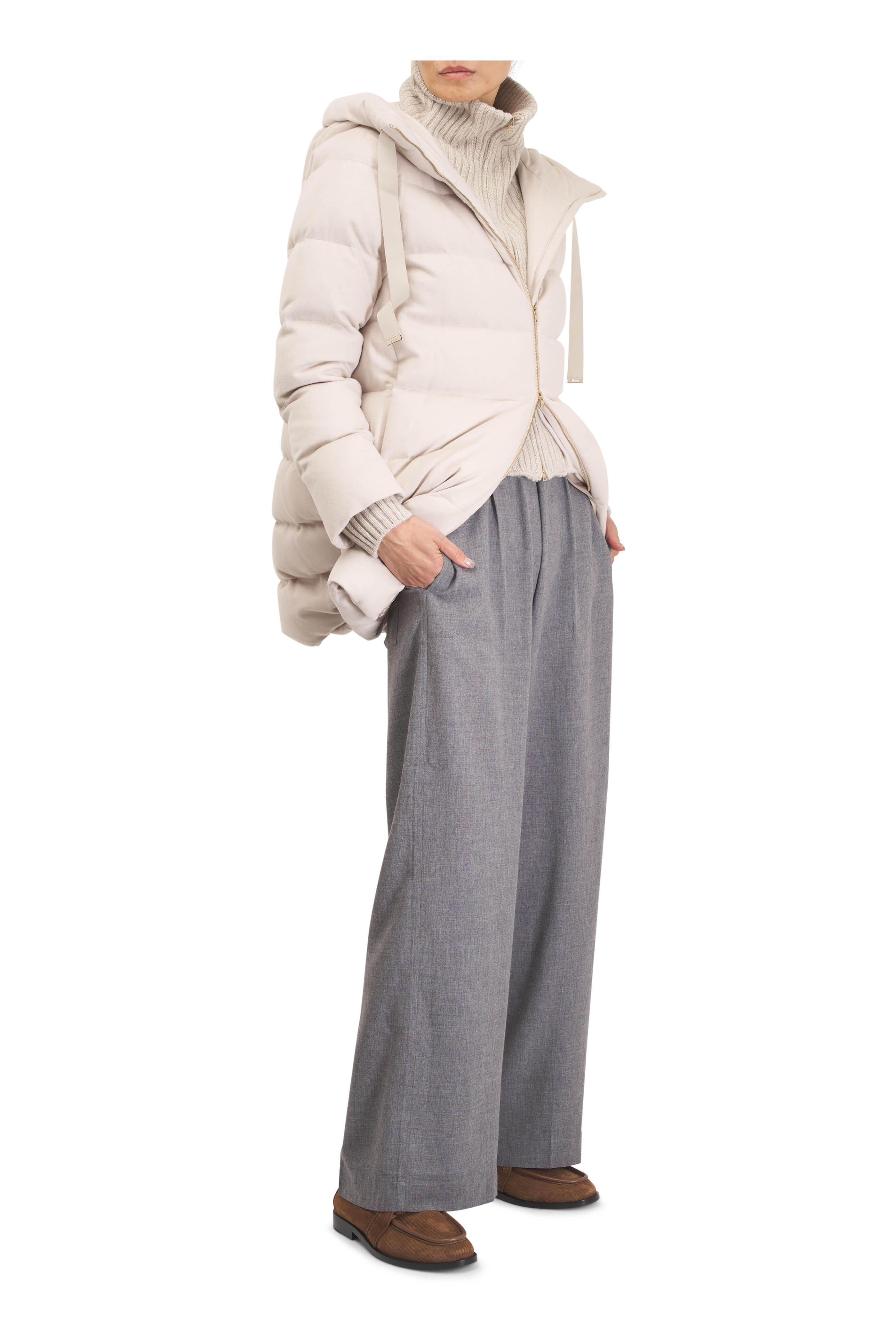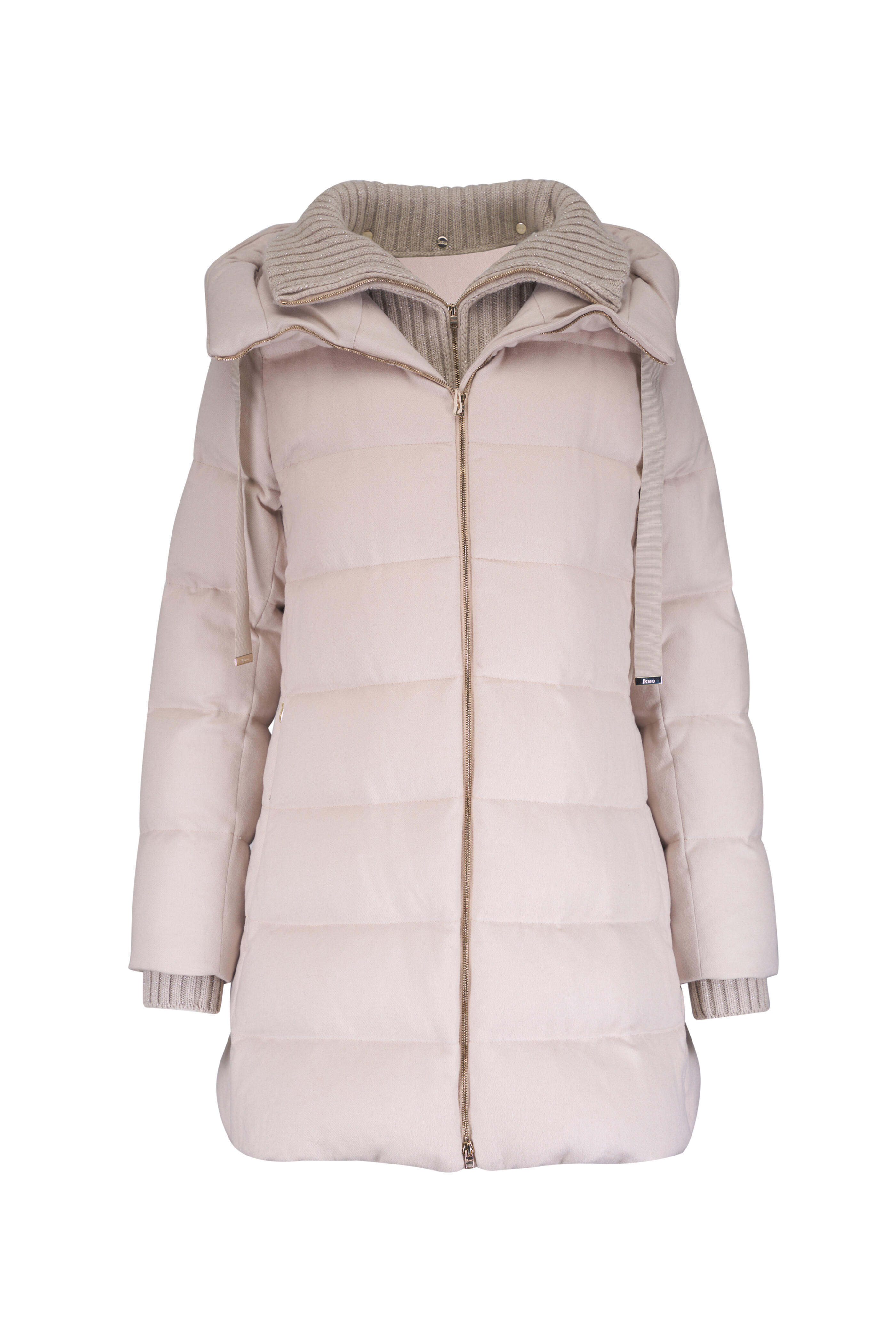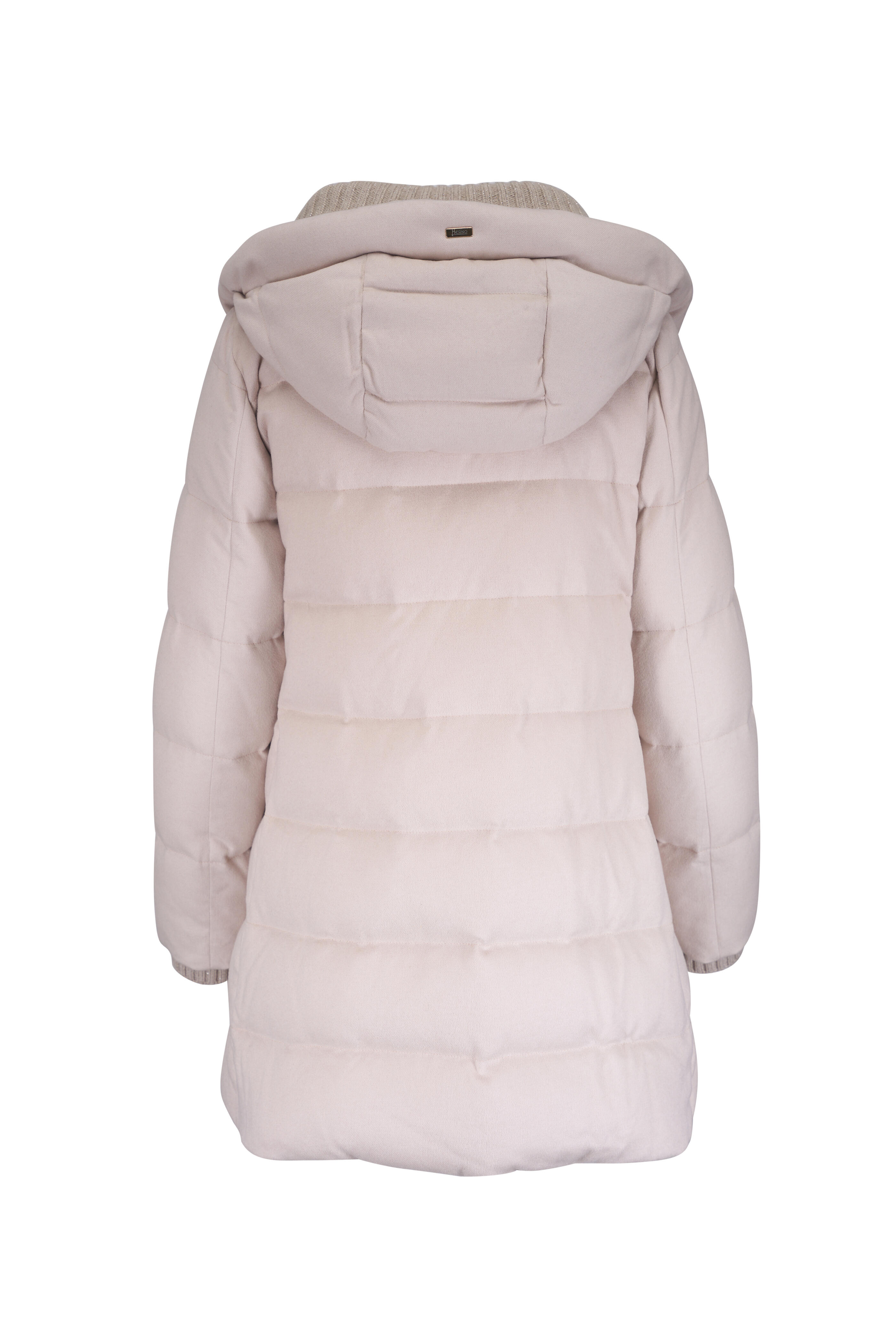 Stand collar; attached hood with drawstring. Front two-way zip placket. Zip-out ribbed stand collar dickey. Side zip pockets. Ribbed knit trim at cuffs. Made in Italy. Approximately 29" shoulder to hem (measurements taken from size 4). 51% silk, 49% cashmere; contrasting fabric: 55% cotton, 45% polyester; fill: 90% down, 10% feather; lined. Dry clean.