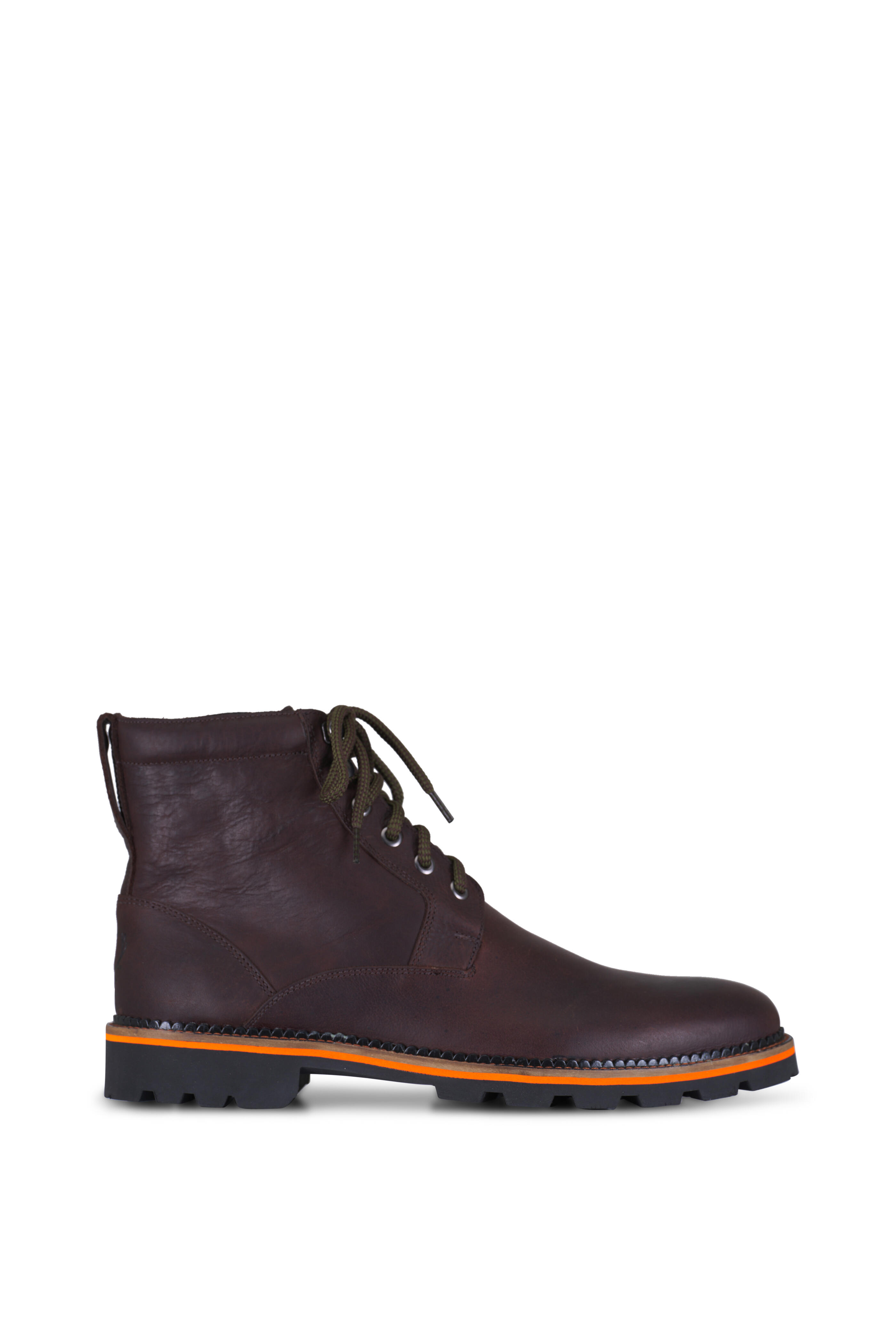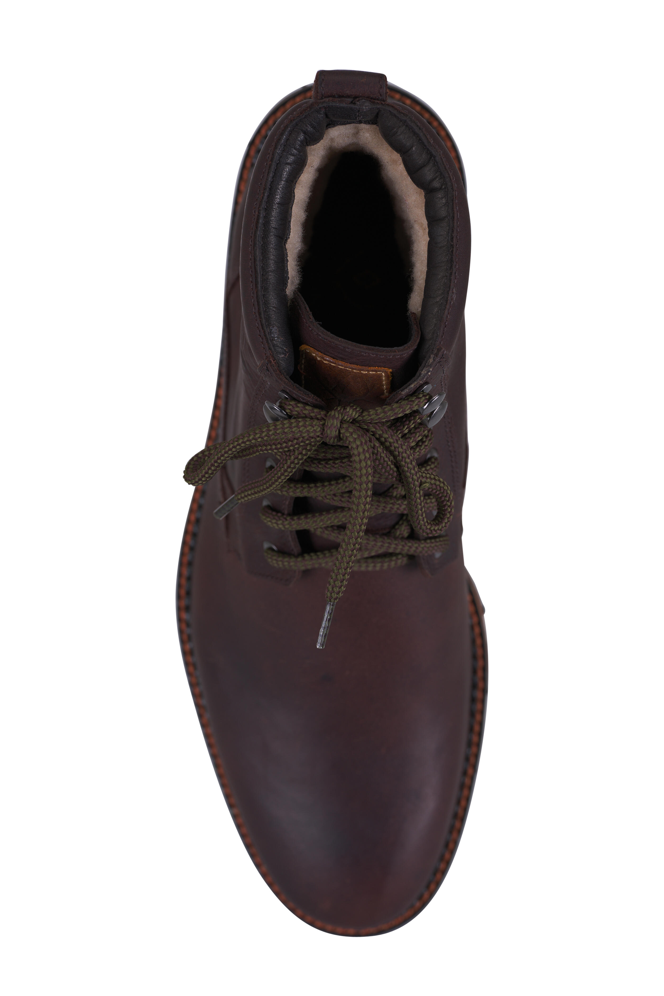 Oiled leather upper. Round toe. Lace-up. Shearling lining. Vibram rubber lug sole. Waterproof. Made in Italy.