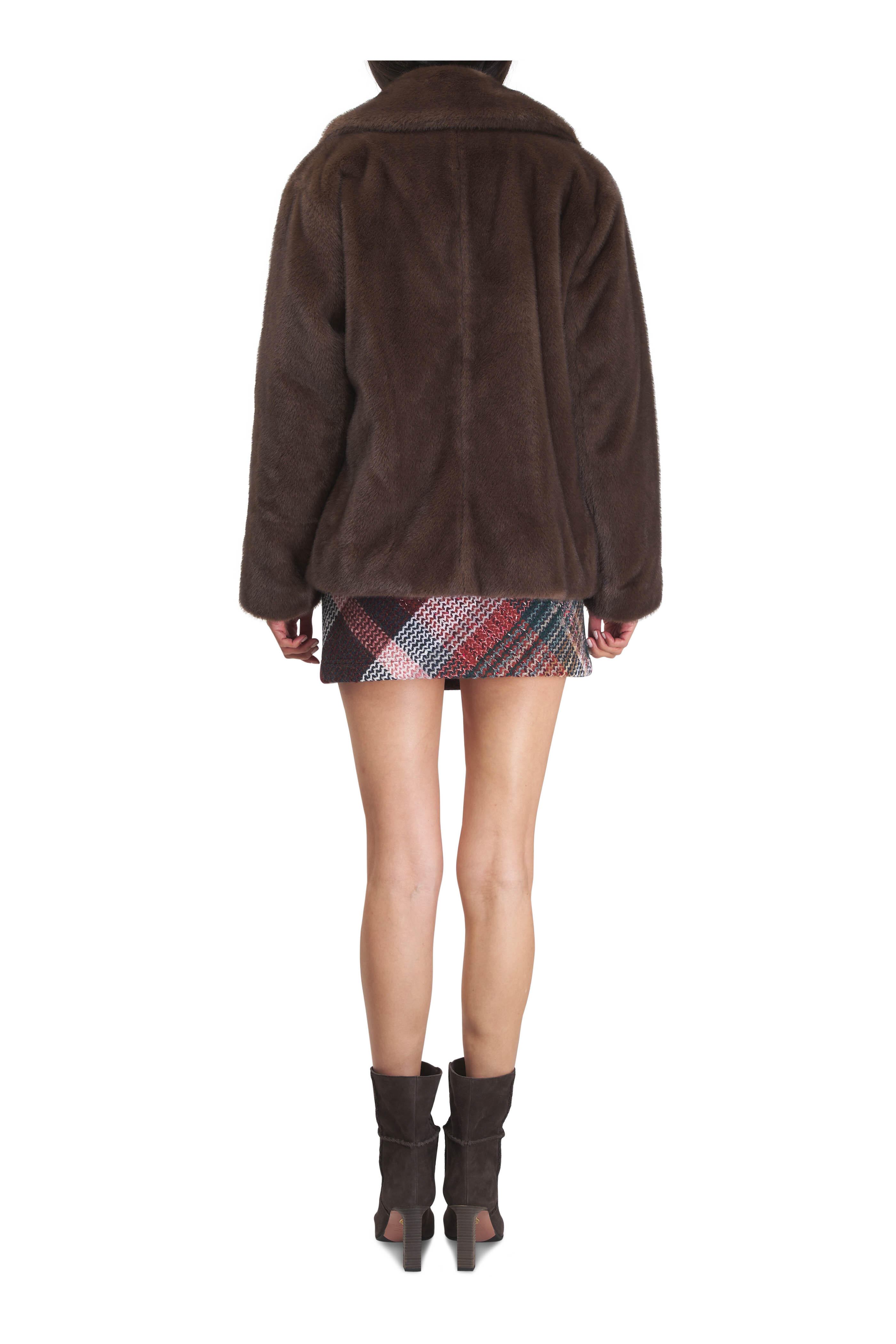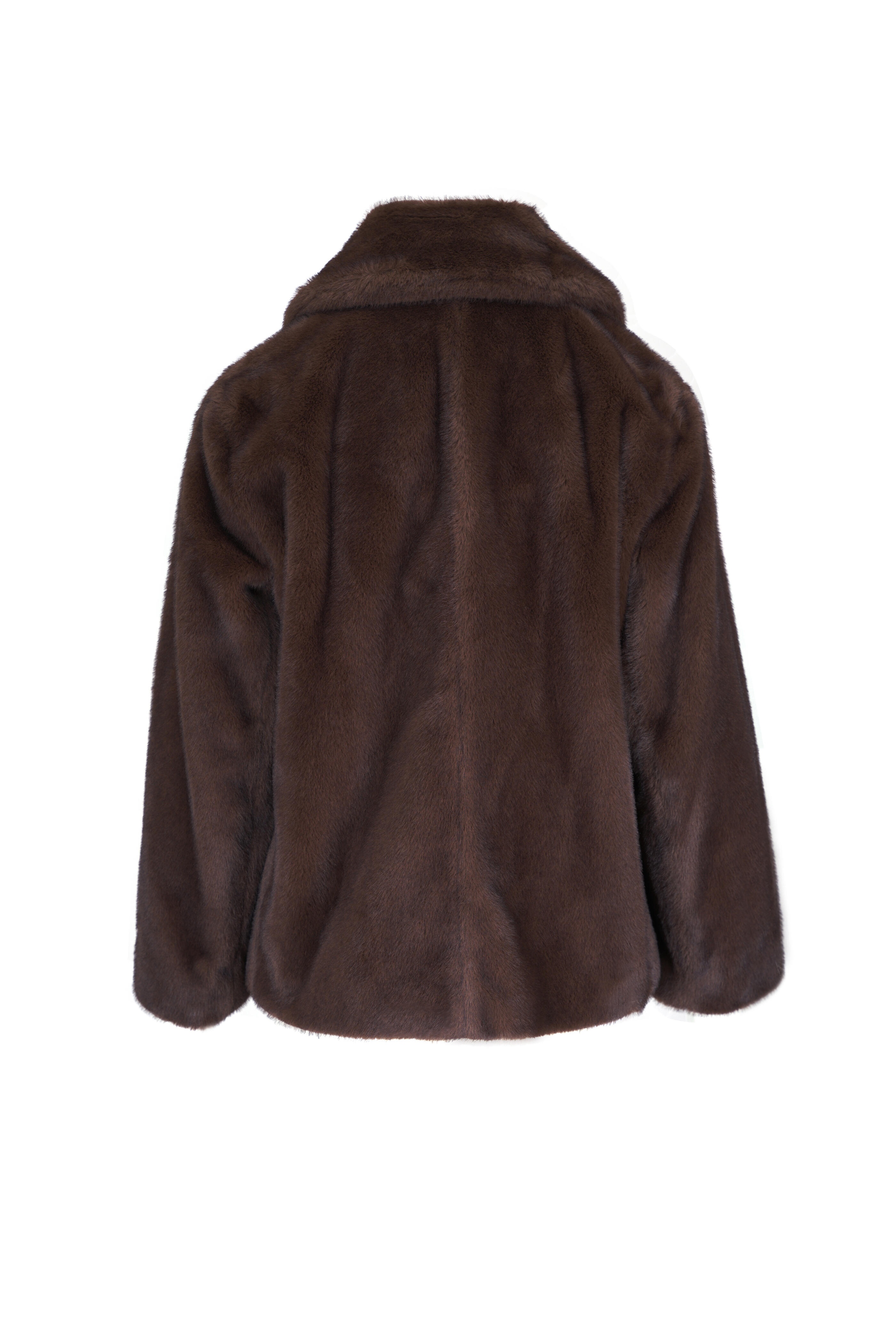 Oversized notched lapel collar. Front double breasted button closure. Side slip pockets. Imported. Approximately 25" shoulder to hem (measurements taken from size 4). 100% polyester; lined. Dry clean.