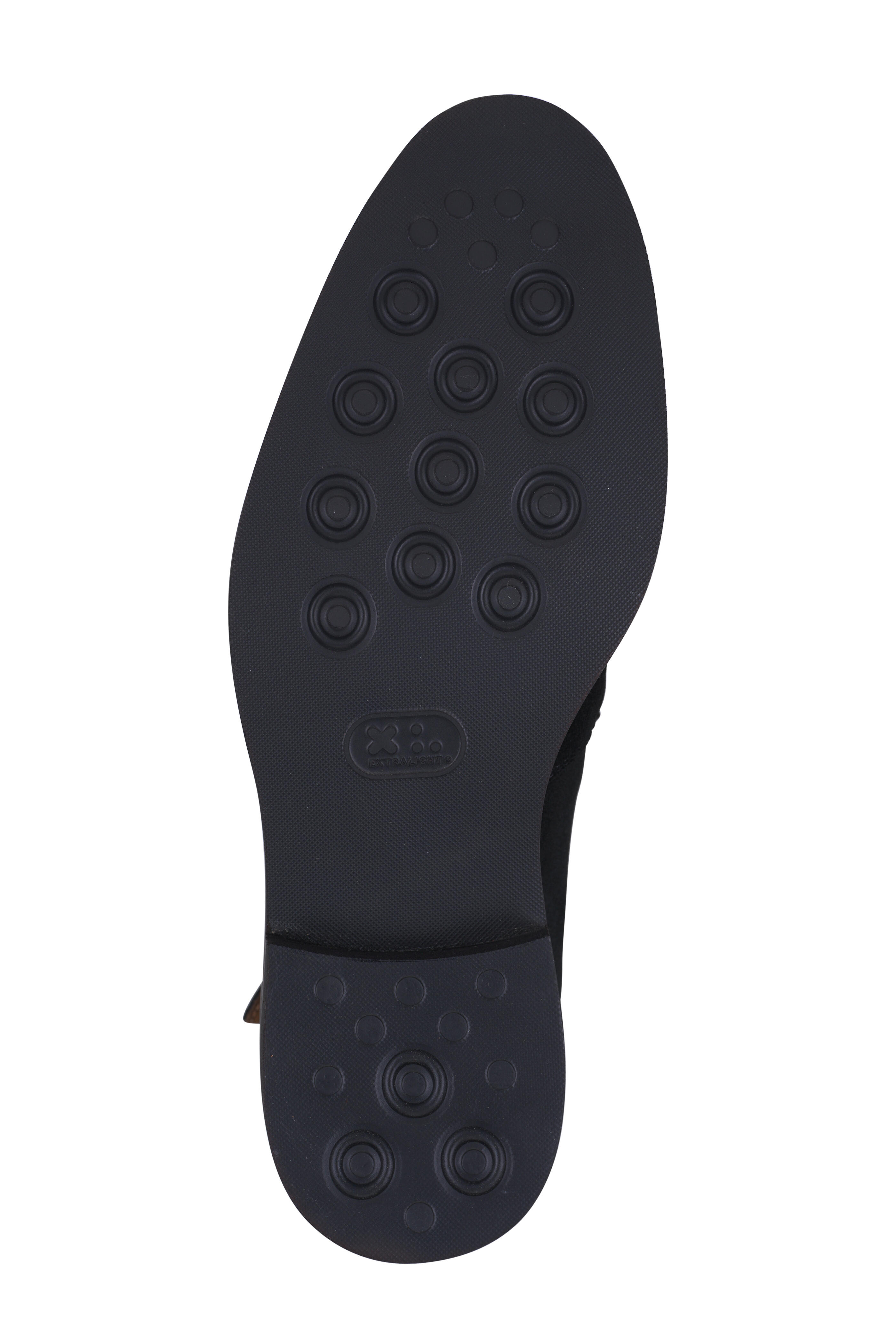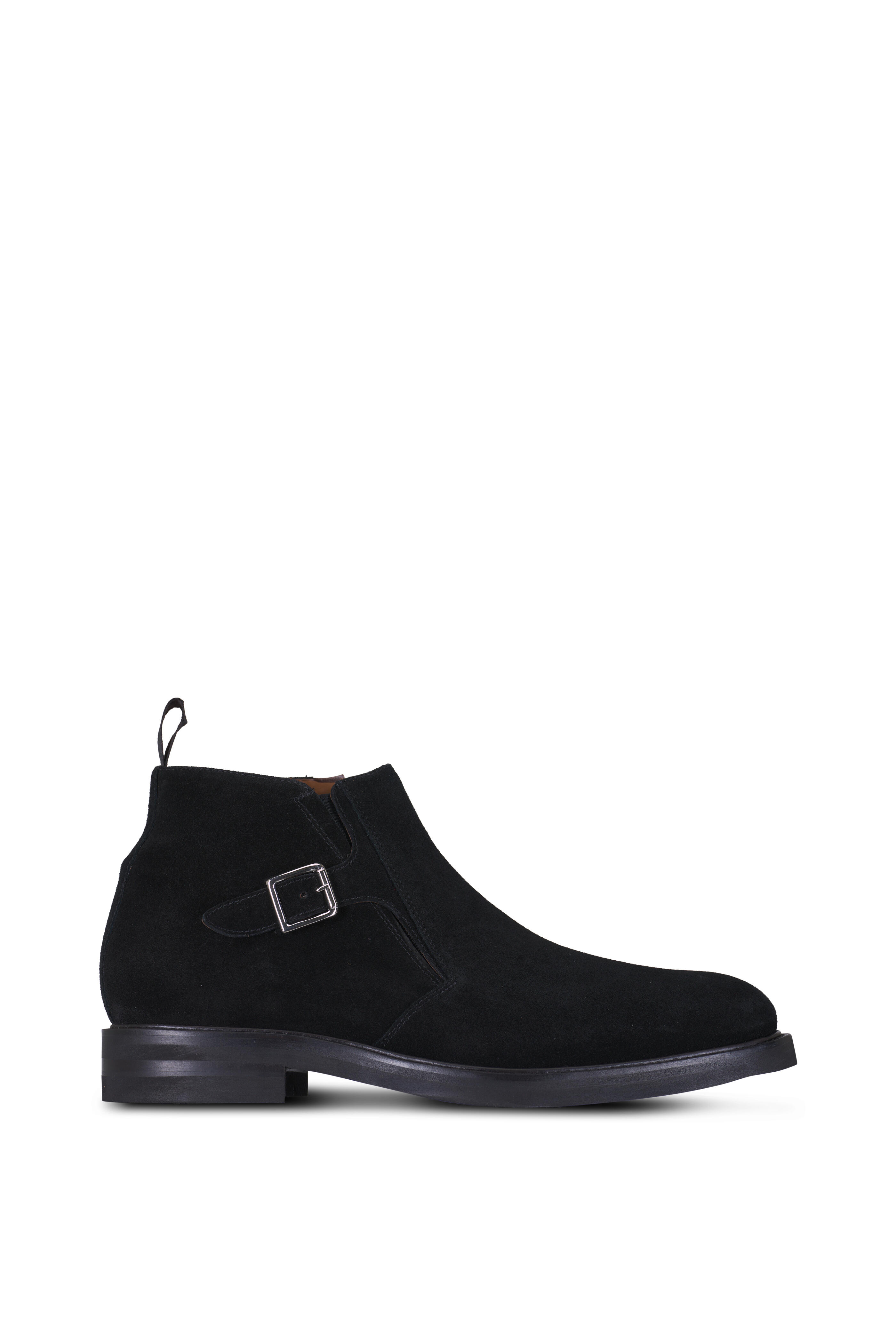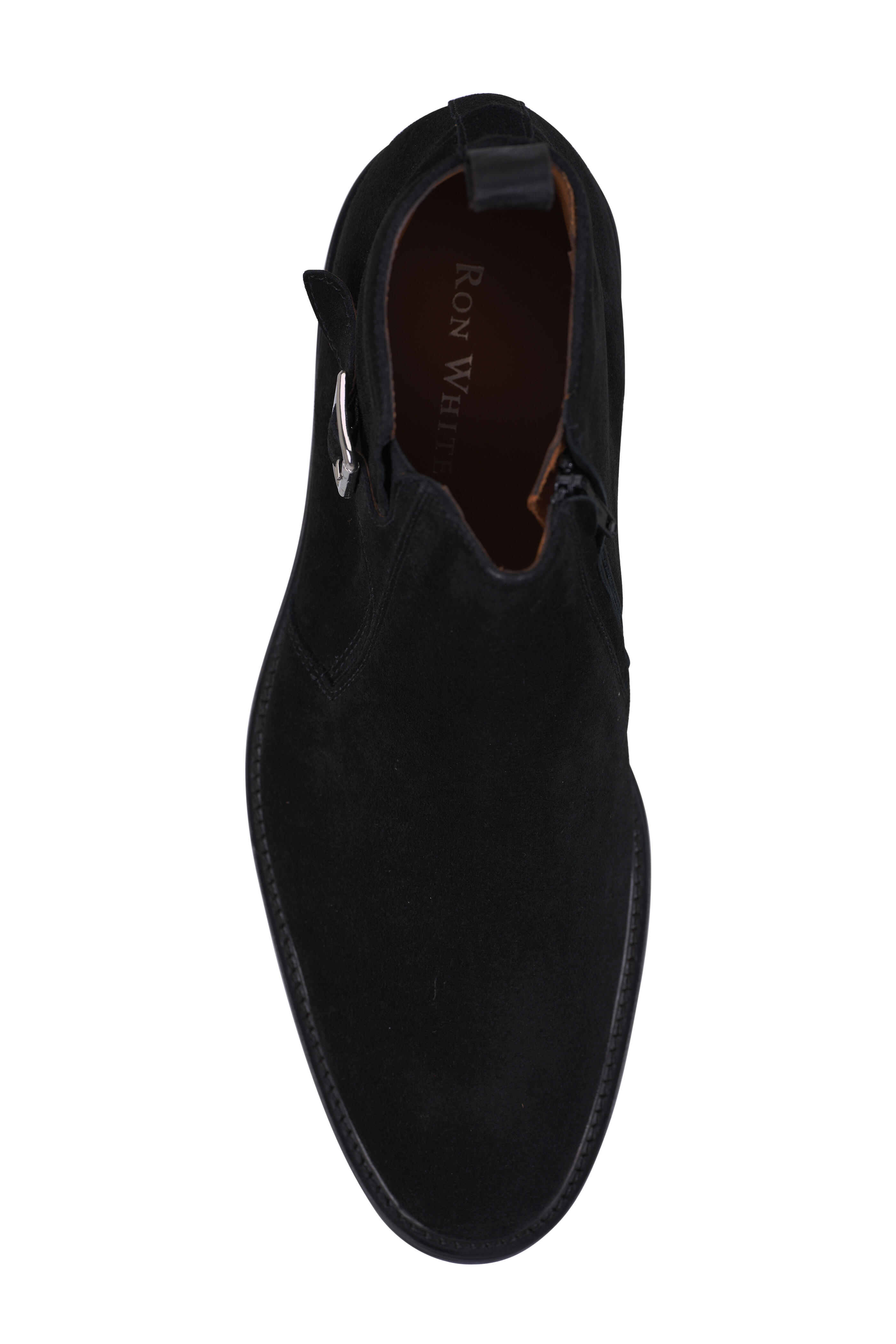 Suede upper. Almond toe. Ankle zip closure; adjustable buckle. Leather lining and PORON cushioned insole. Ultralight blown rubber sole. Stacked heel. Made in Italy. Runs small, size up.