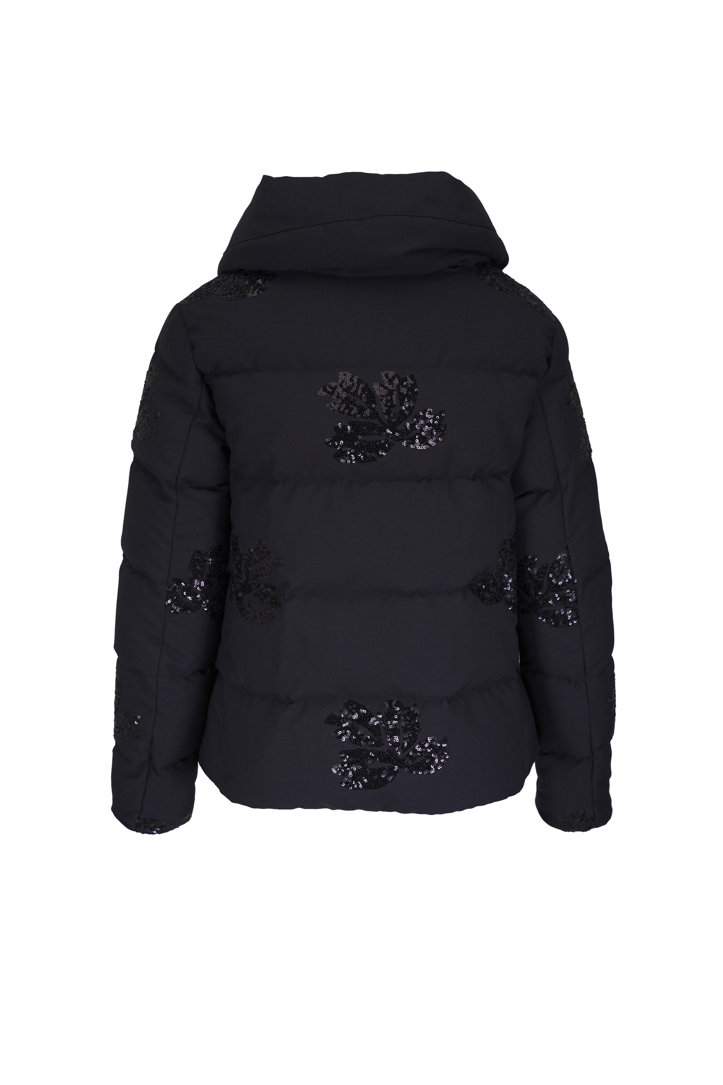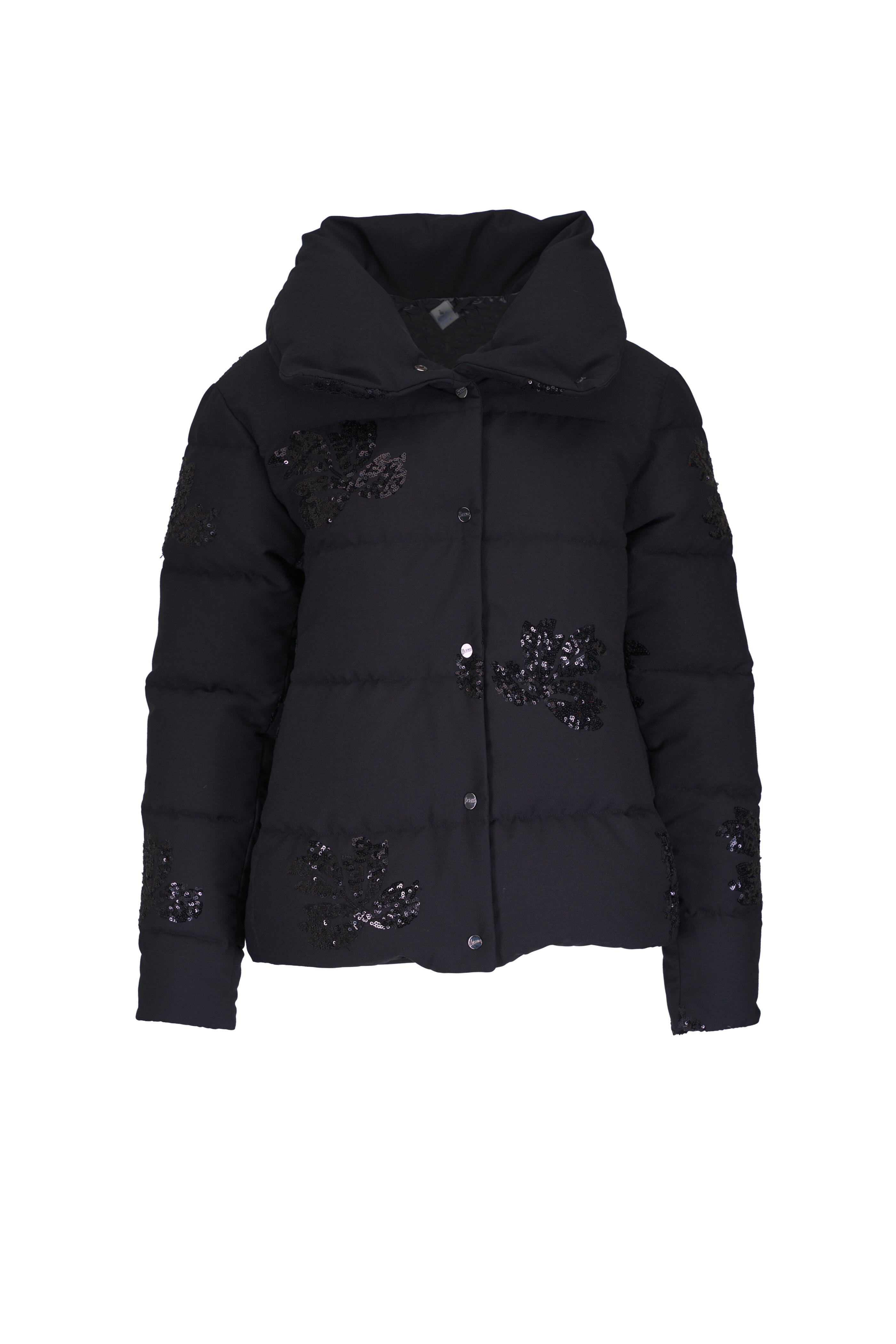 Stand collar. Snap closure. Lower slip pockets. Water and wind proof. Embellished with sequin. Straight hem. Imported. Classic fit. Shoulder to hem 23" (size 2). 100% polyamide; fill: 80% down, 20% feathers. Hand wash.