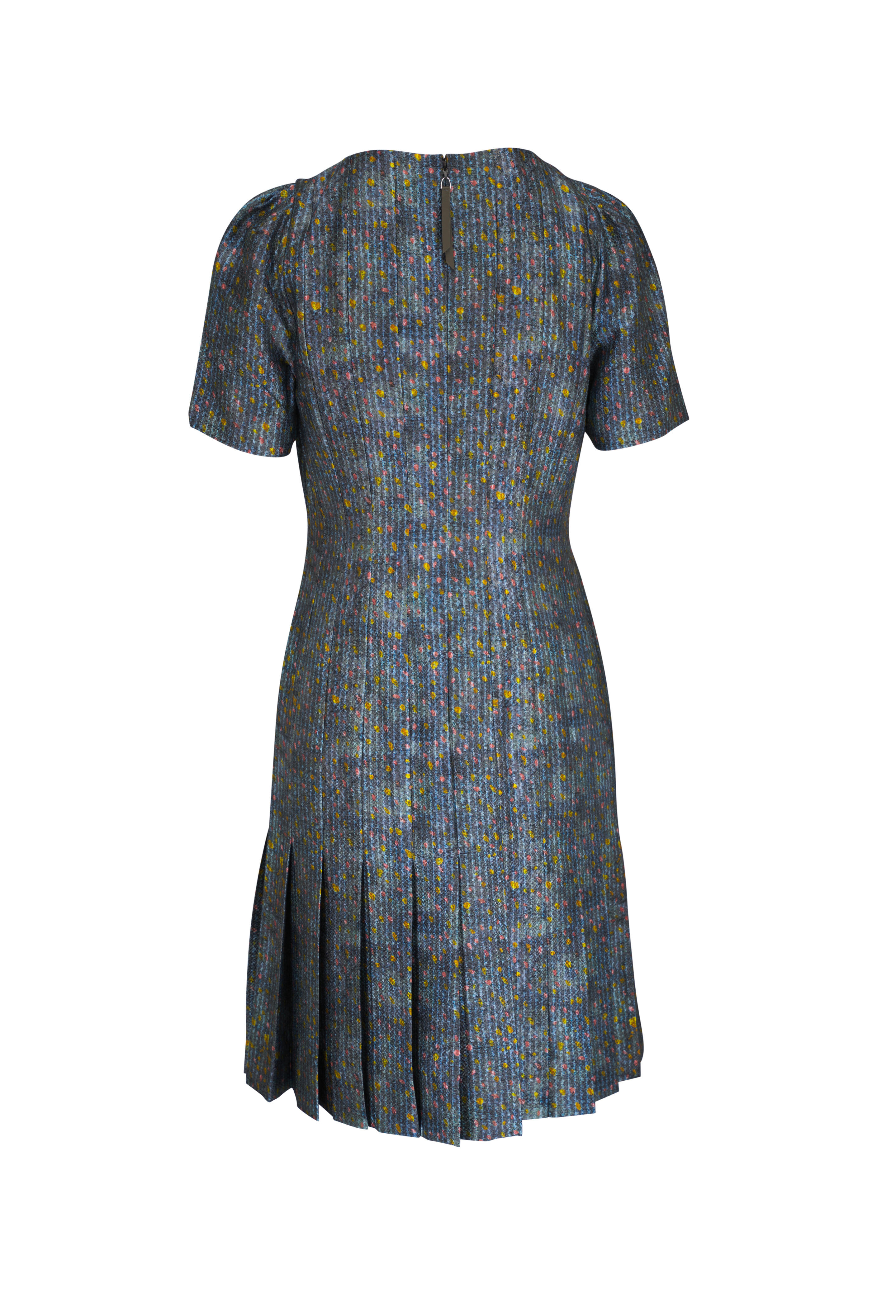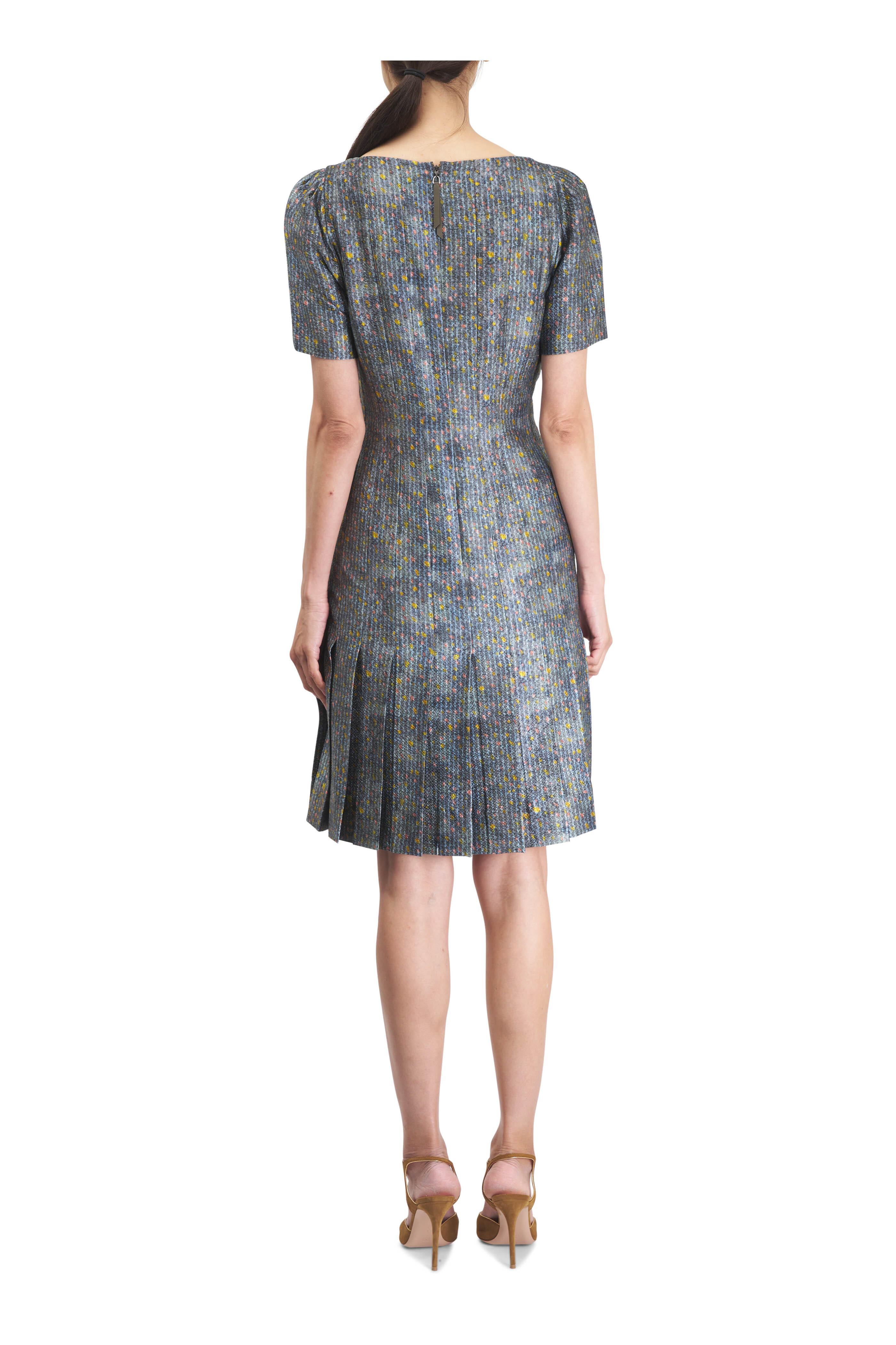 Crew neckline. Concealed back zip. Pleated at bottom. Imported. Approximately 38" shoulder to hem (measurements taken from size 4). 80% silk, 10% elastane; lined. Dry clean.