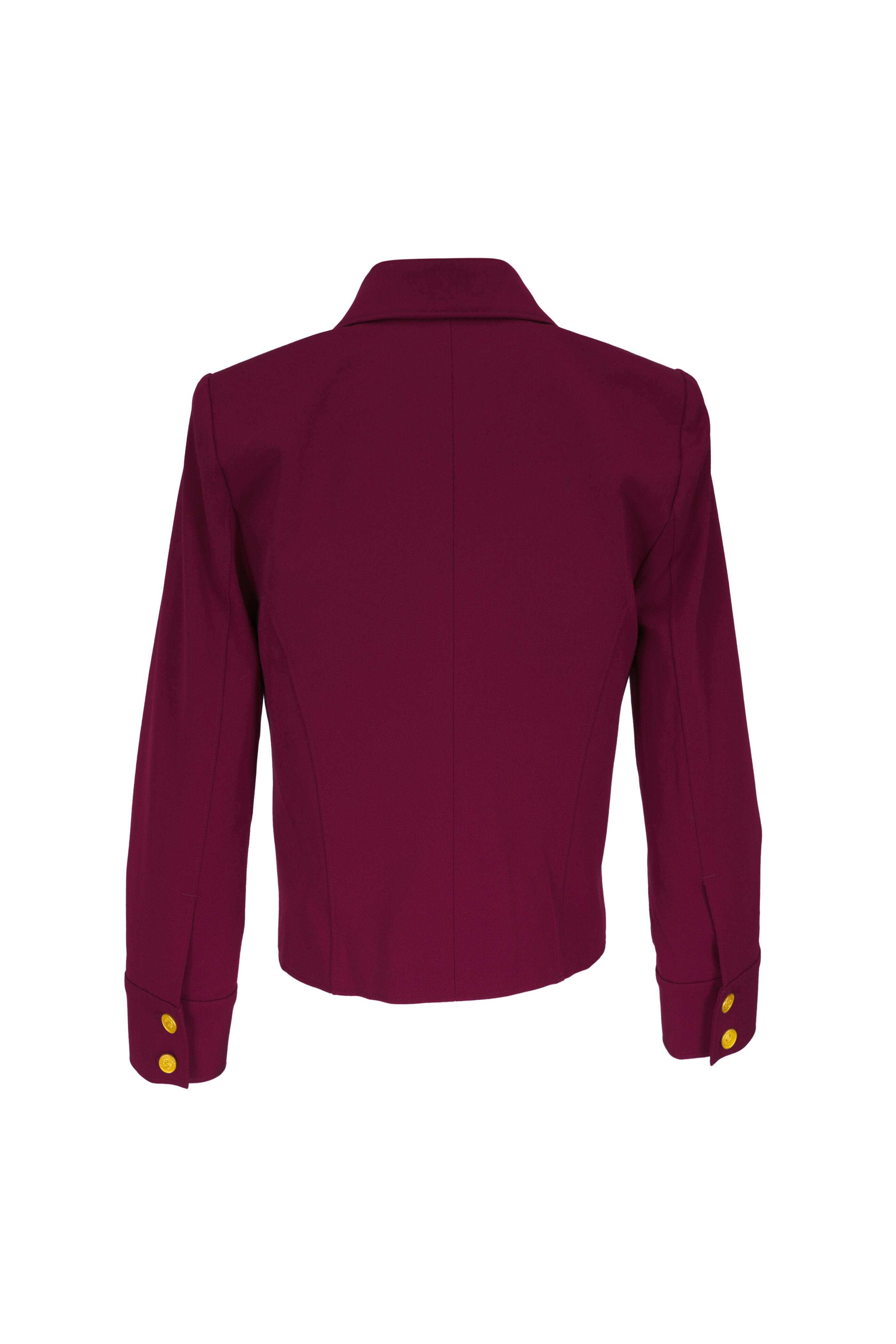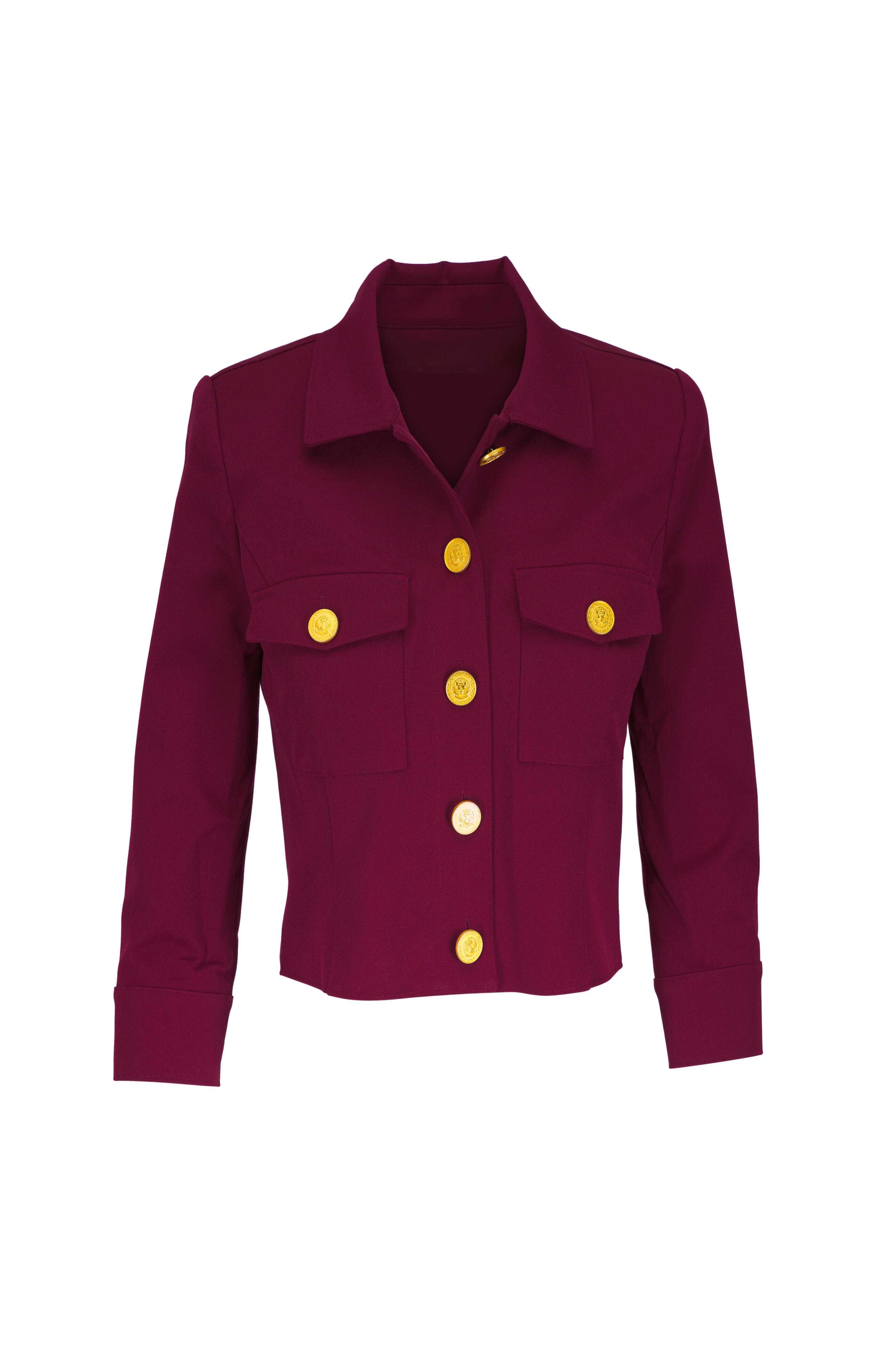 Spread collar. Front button placket. Chest button patch pockets. Shoulder pads. Imported. About 19.25" from shoulder to hem. 68% polyester 29% rayon 3% spandex; lined. Dry clean.
