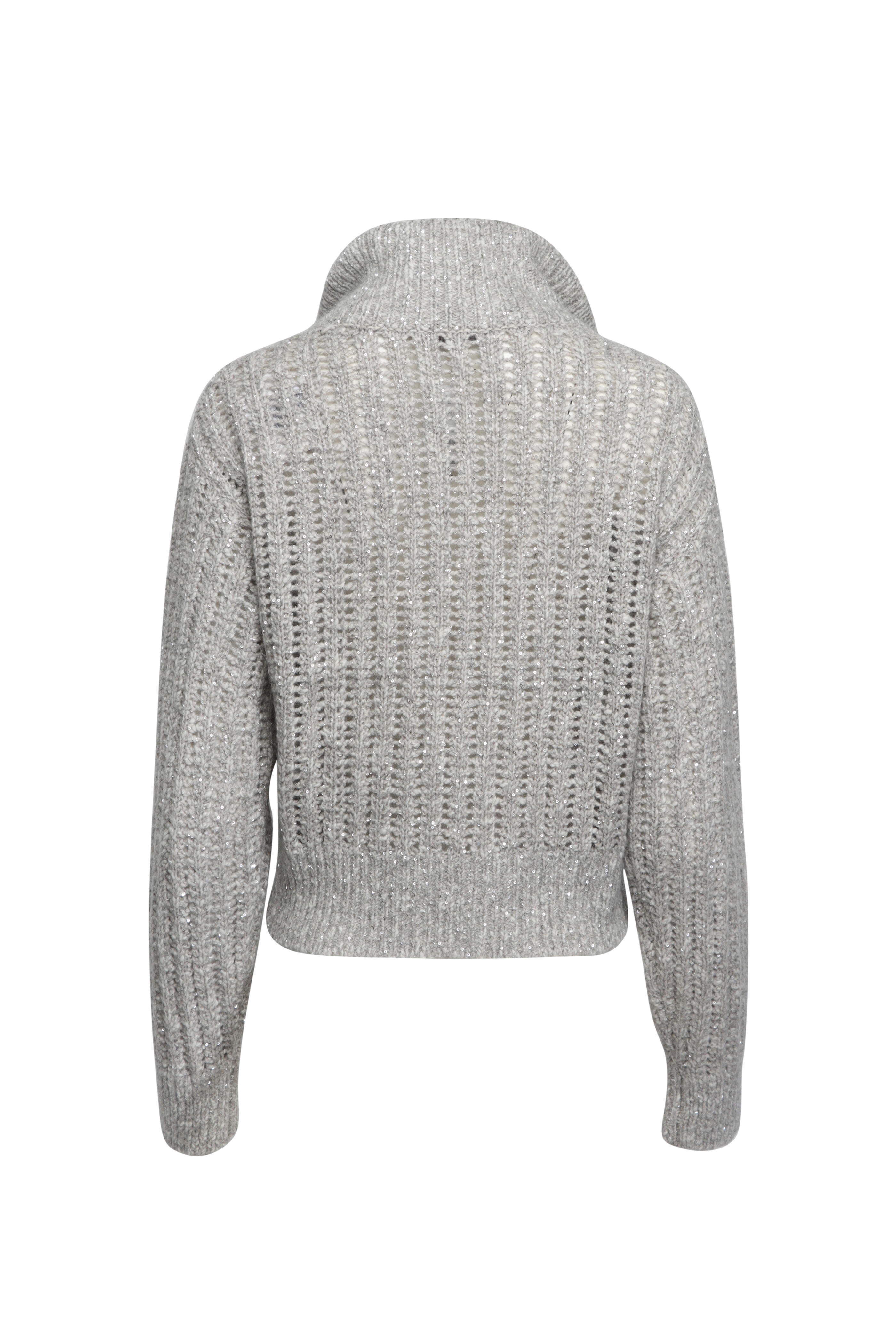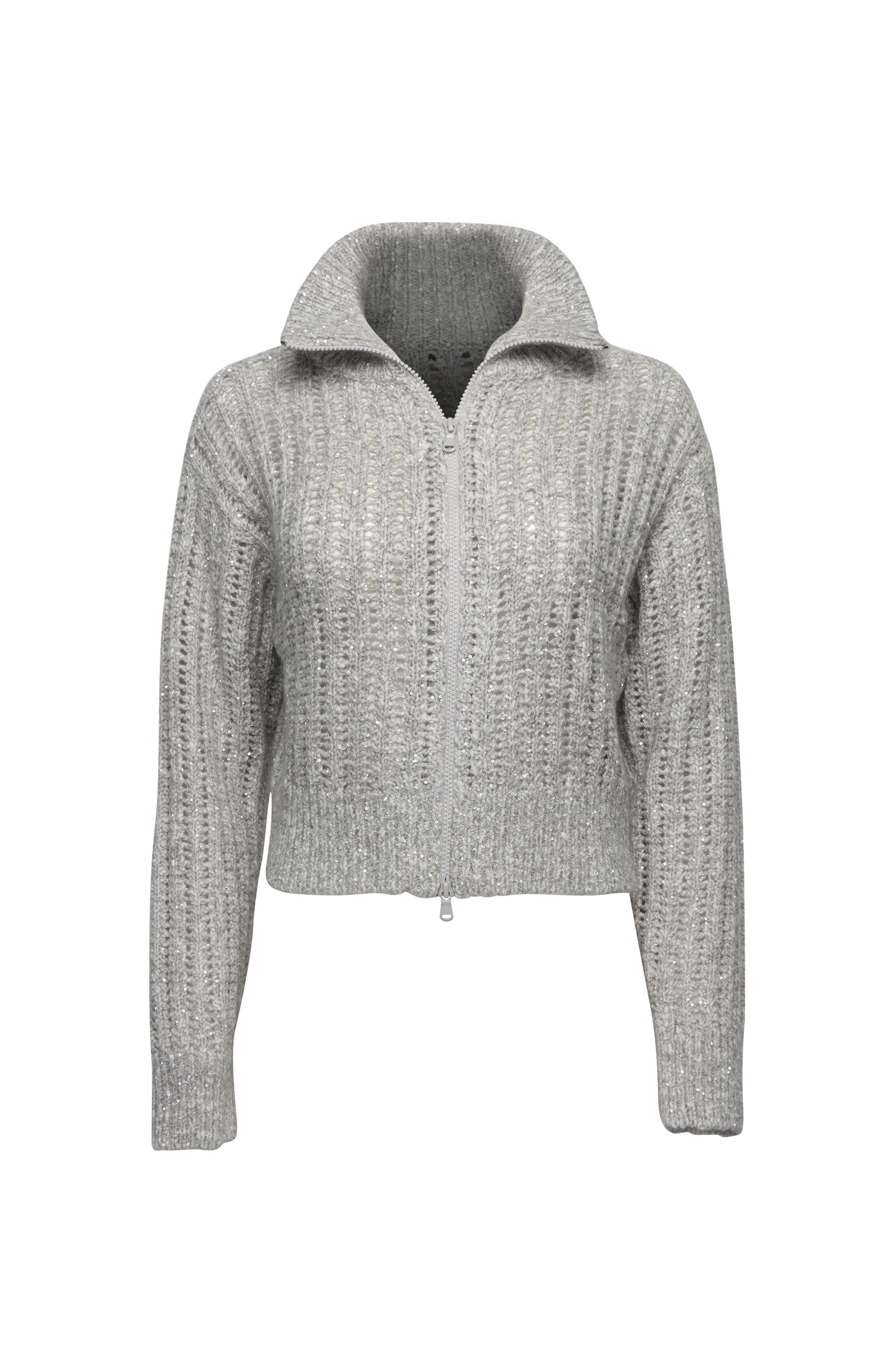 Stand collar. Drop shoulders. Long sleeves. Dual front zip closure. Straight hem. Ribbed neck, cuffs, and hem. Micro paillette detail. Open knit fabrication. Made in Italy. 28% wool, 26% polyamide, 22% cashmere, 19% polyester, 5% mohair outer, 100% polyester sequin detail. Dry clean.