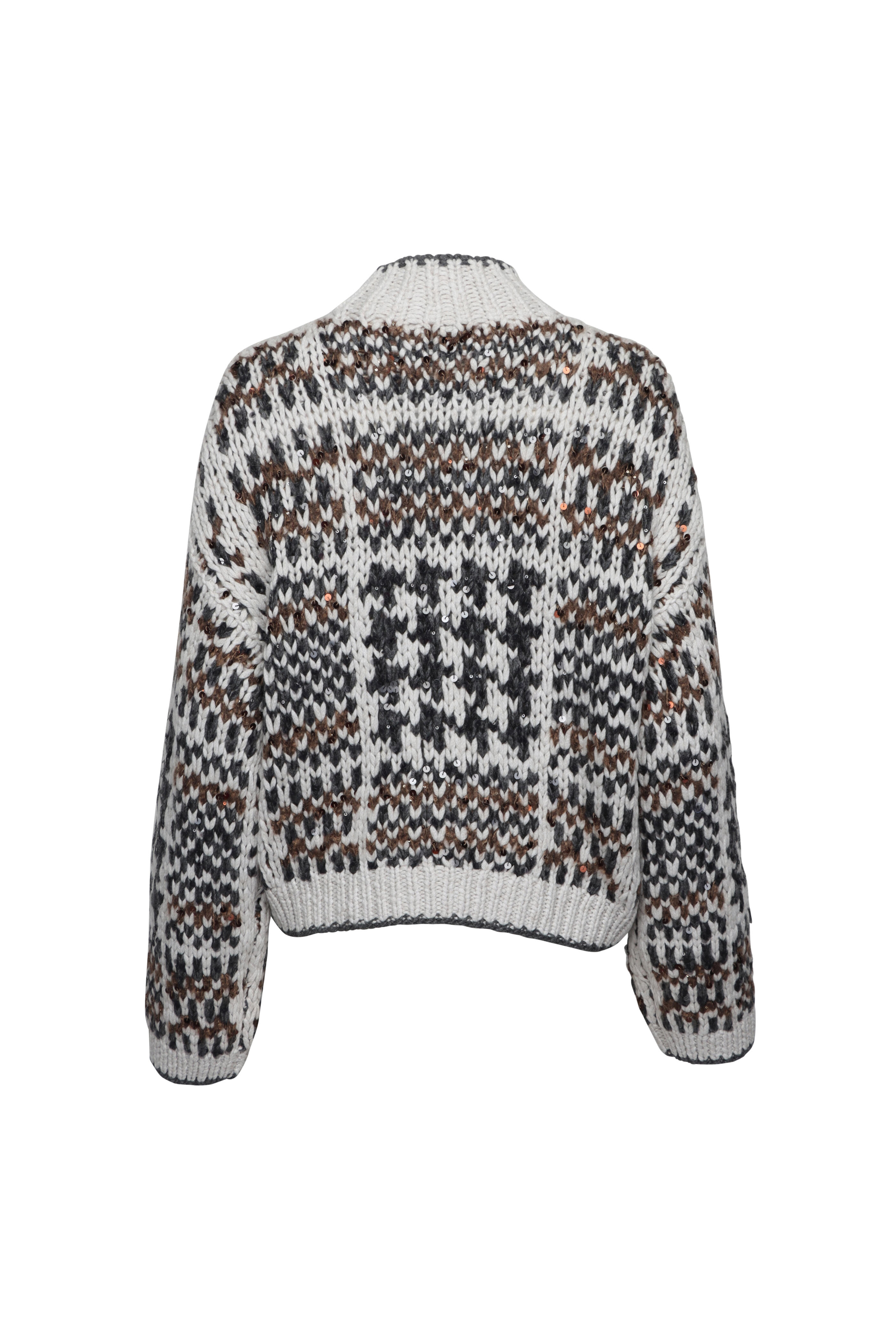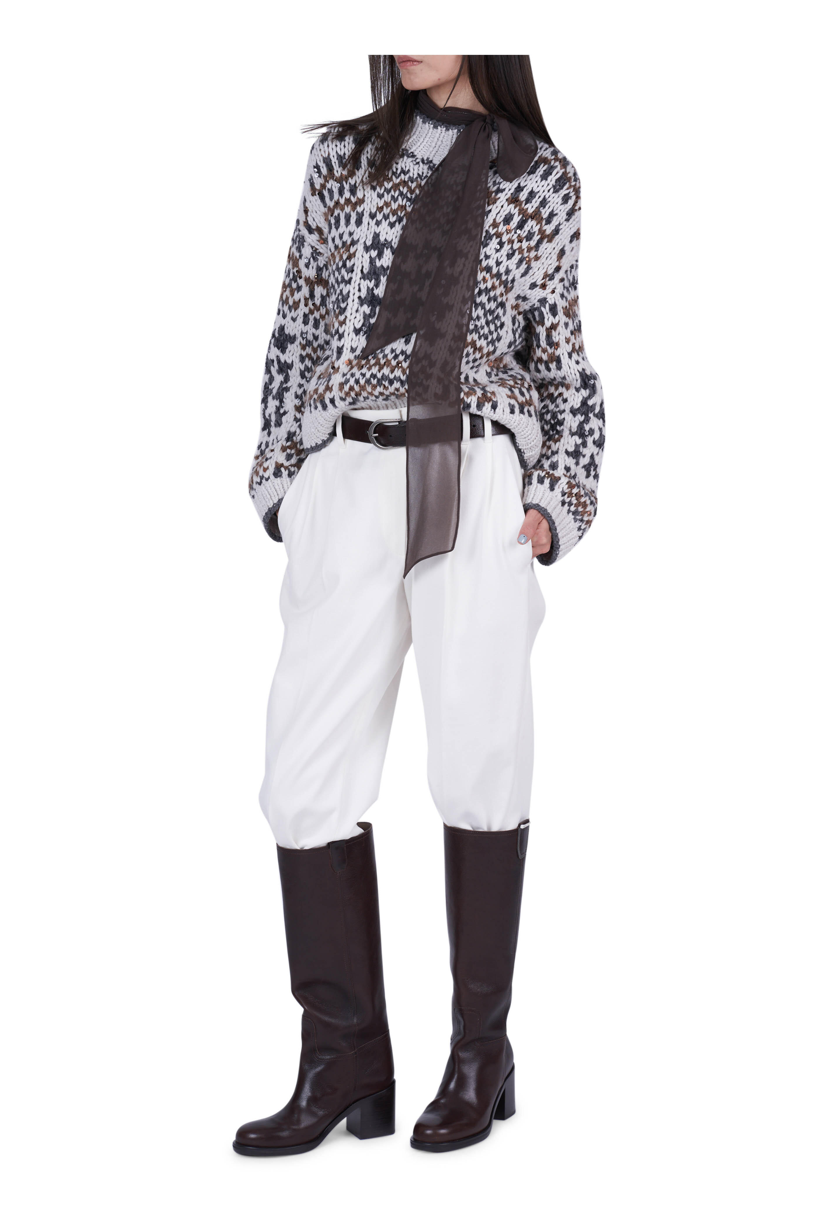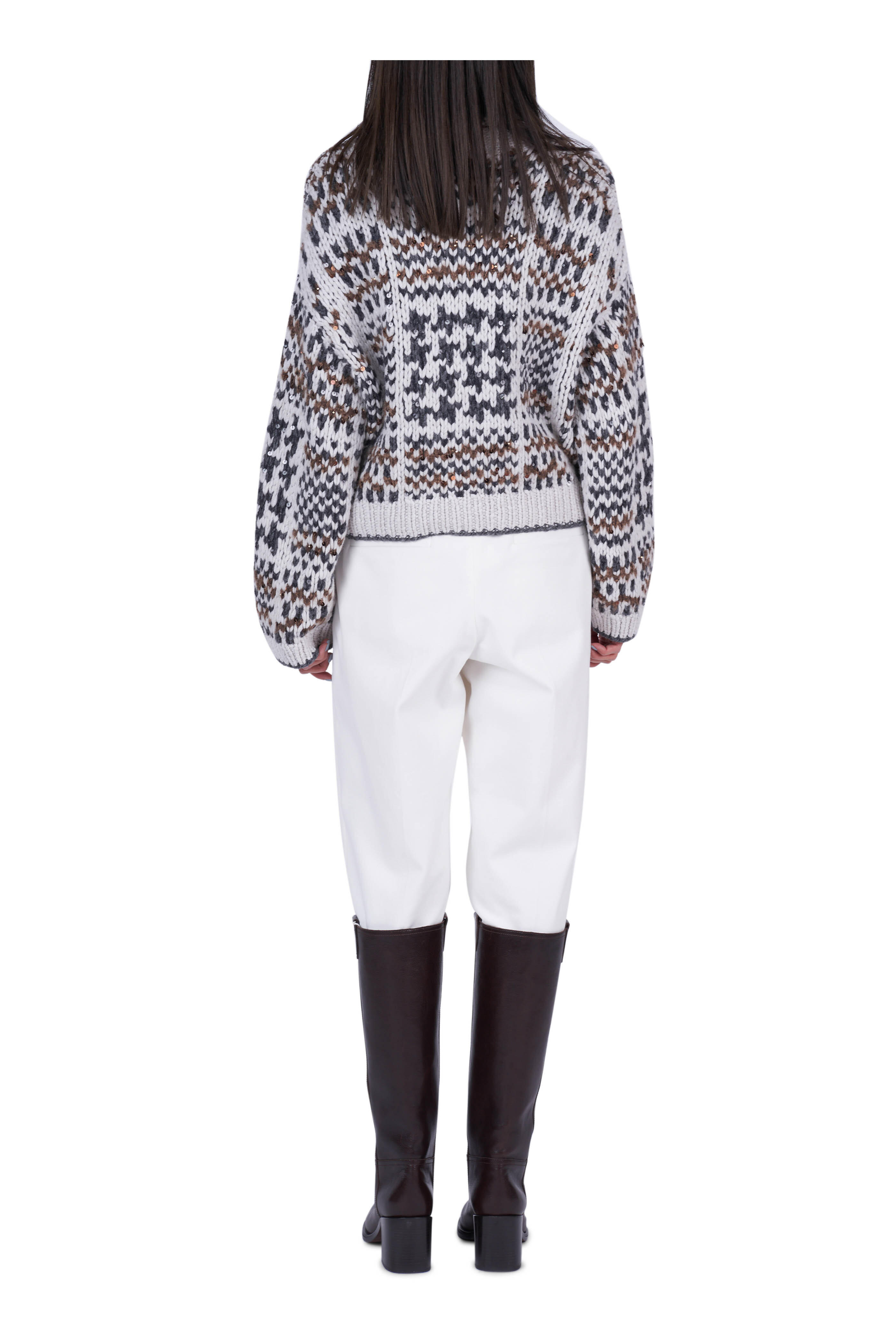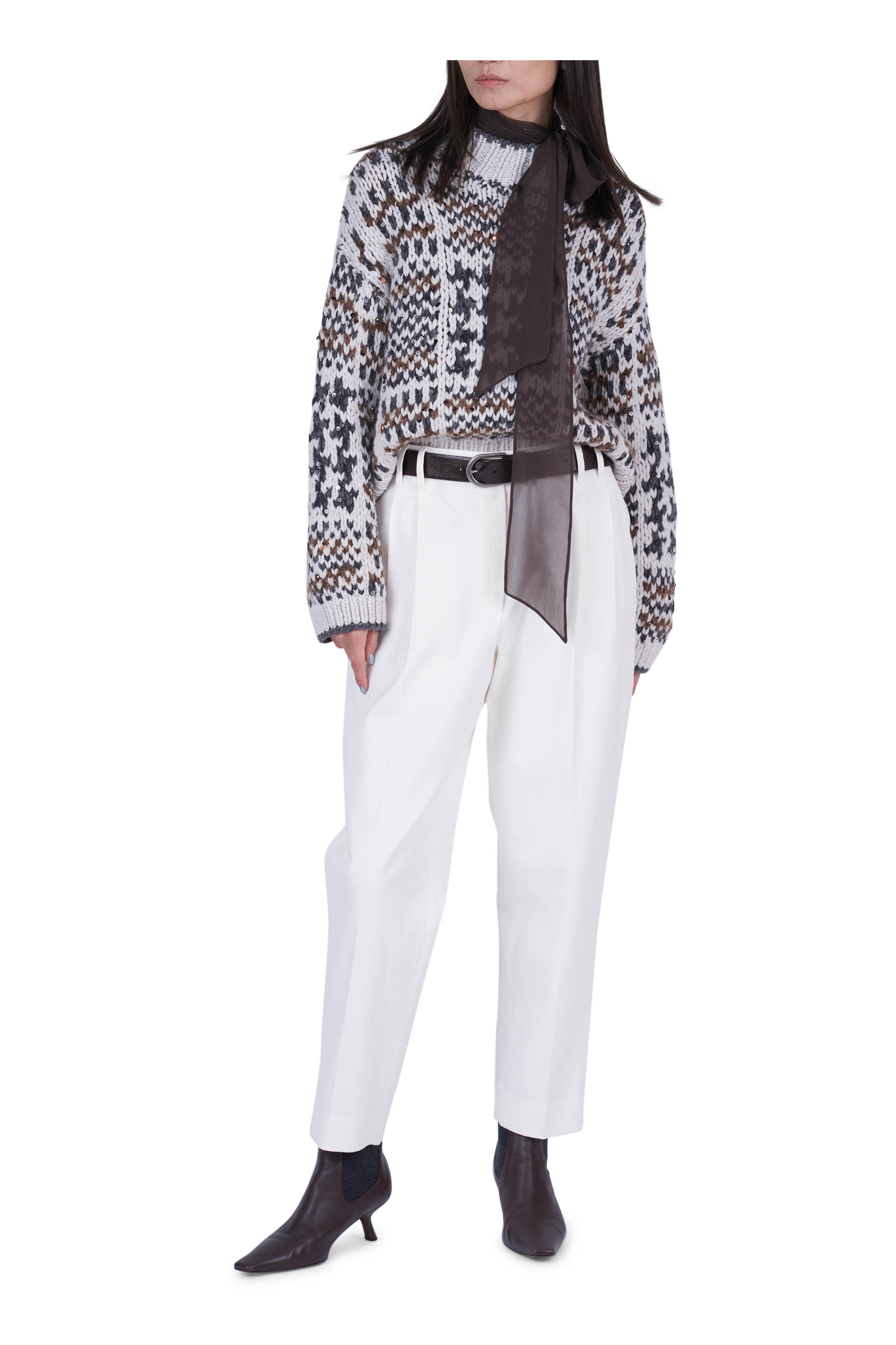 Mockneck. Drop shoulders. Long sleeves. Relaxed fit. Ribbed neck, cuffs, and hem. Jacquard knit fabrication. Made in Italy. 100% cashmere. Dry clean.