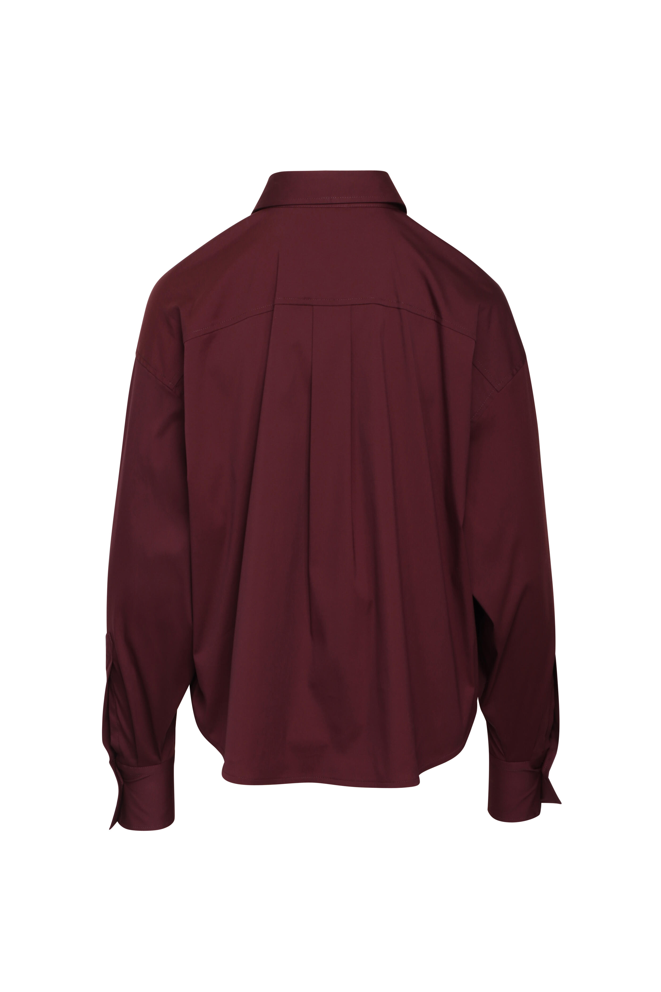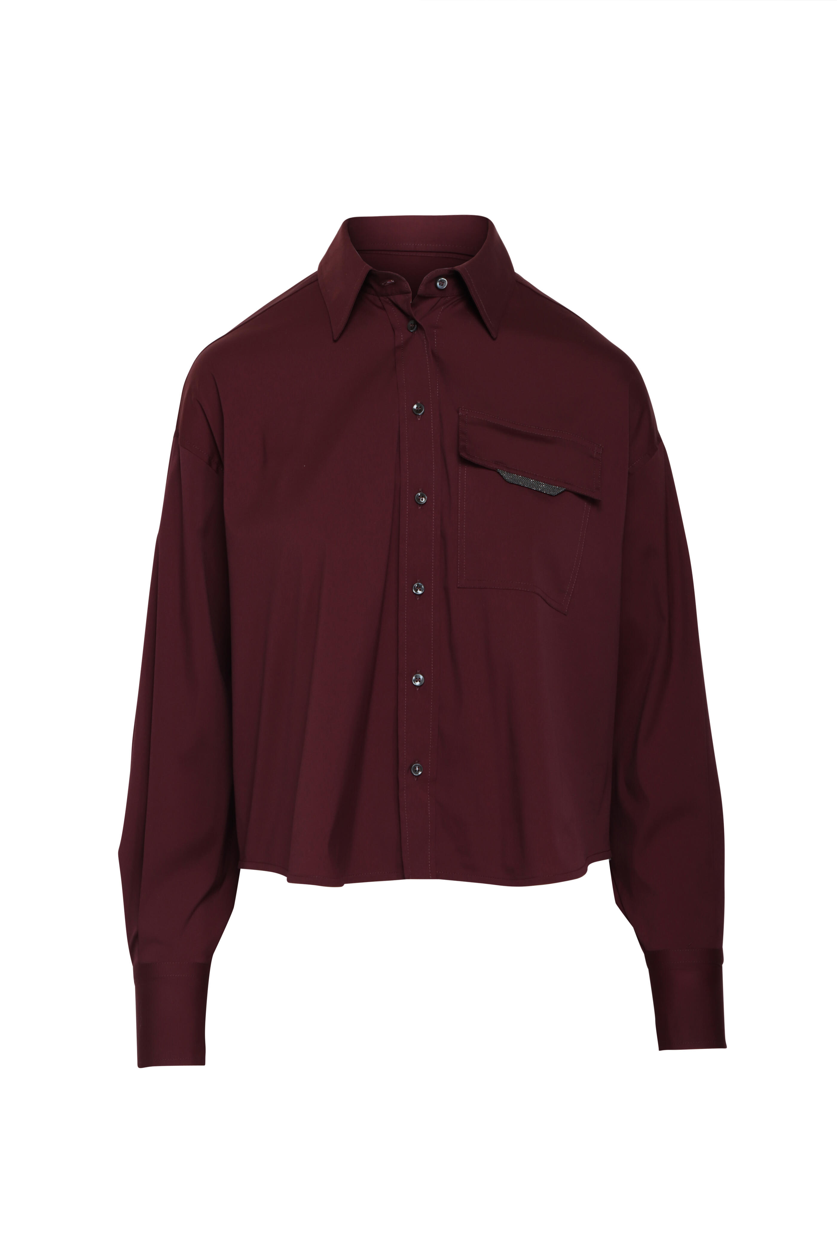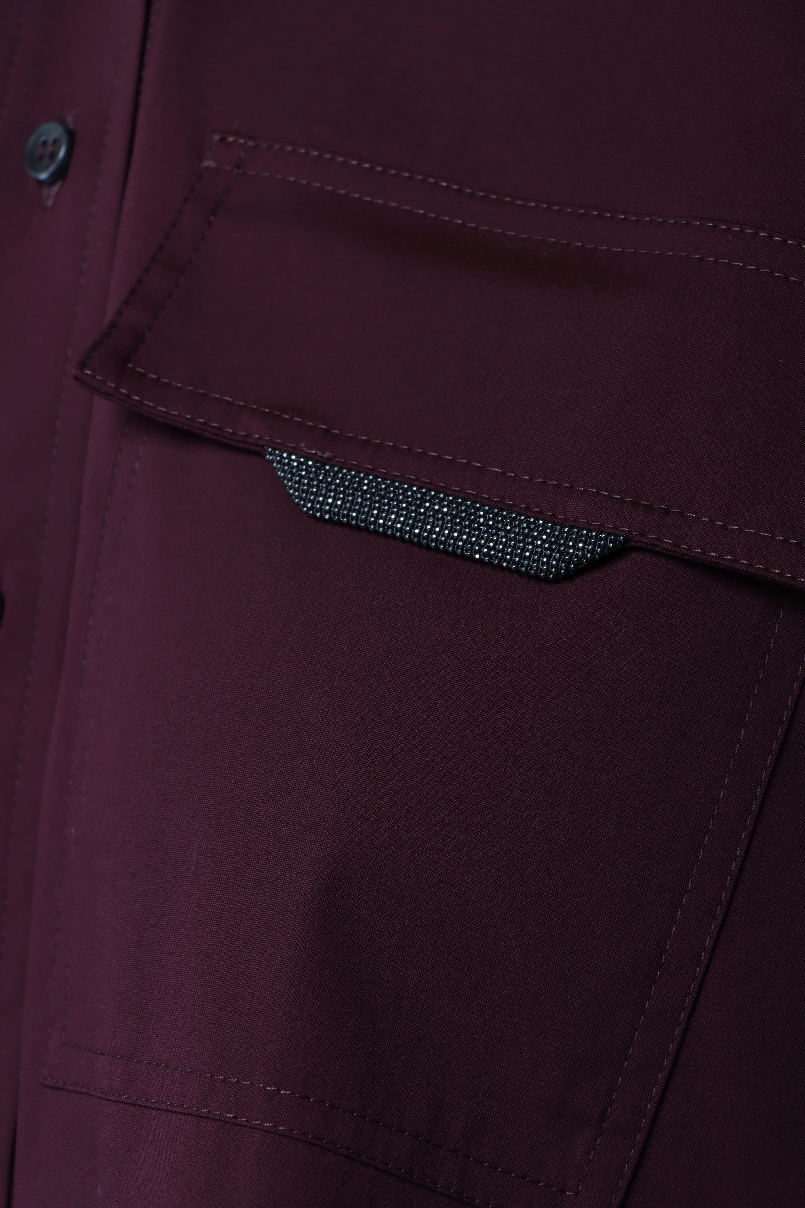 Collar. Drop shoulders. Long sleeves; button cuffs. Button front closure. Single chest flap patch pocket; monili tab detail. Boxy fit. Rounded shirttail hem. Made in Italy. 72% cotton, 23% nylon, 5% elastane. Dry clean.