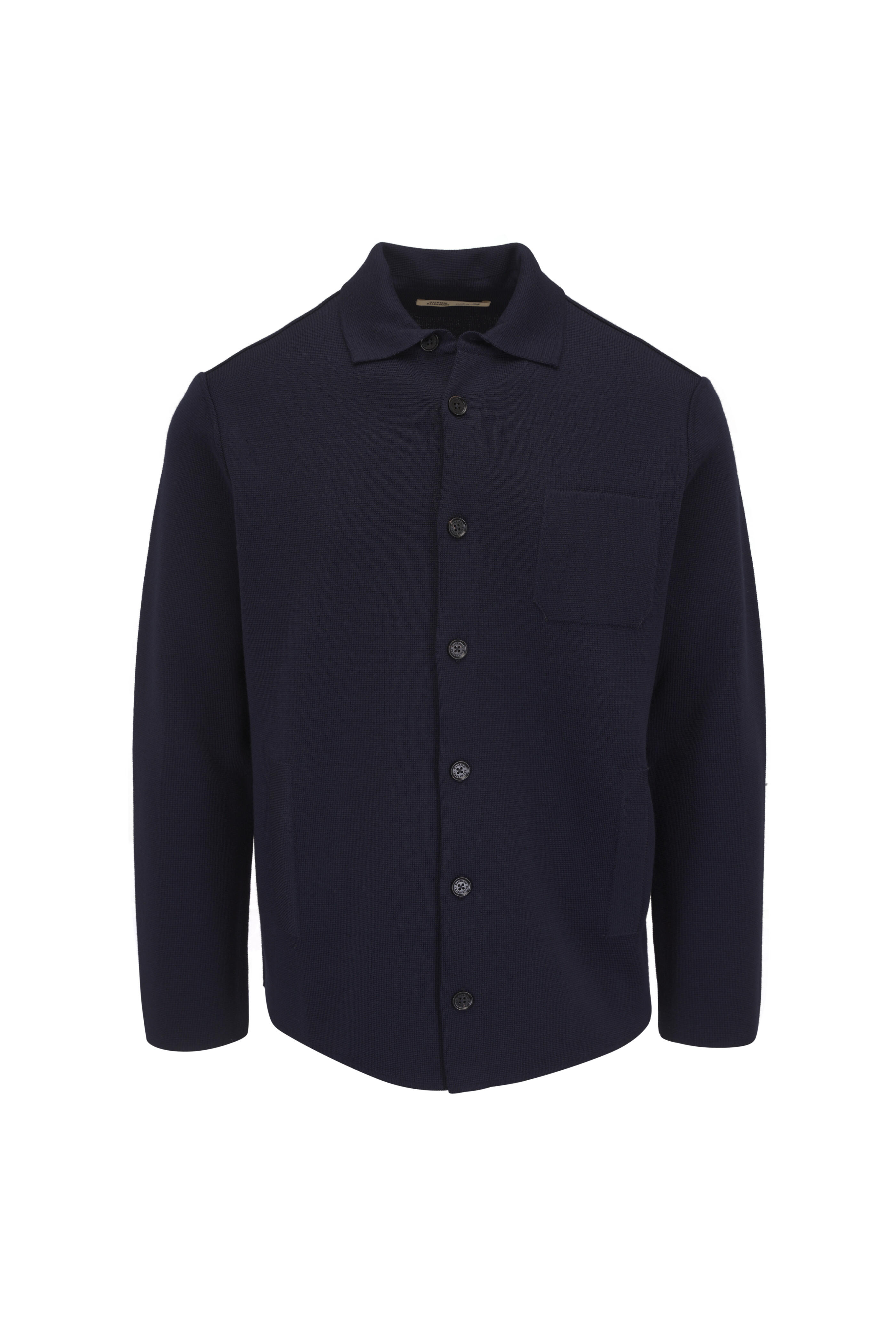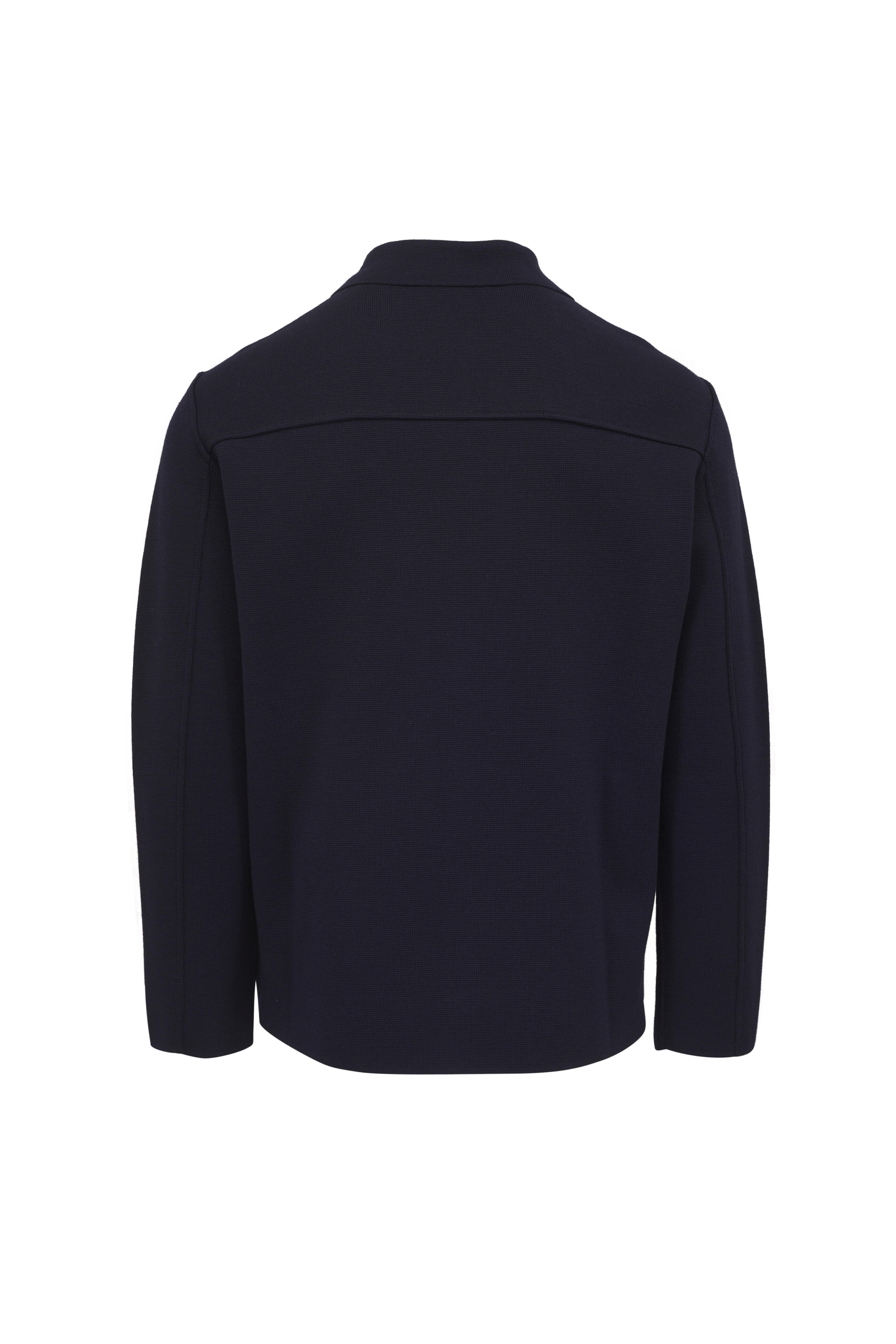 Spread collar. Front button placket. Lower slip pockets; chest patch pocket. Straight hem. Made in Italy. Shoulder to hem 29" (size 41). 100% Virgin wool. Hand wash.