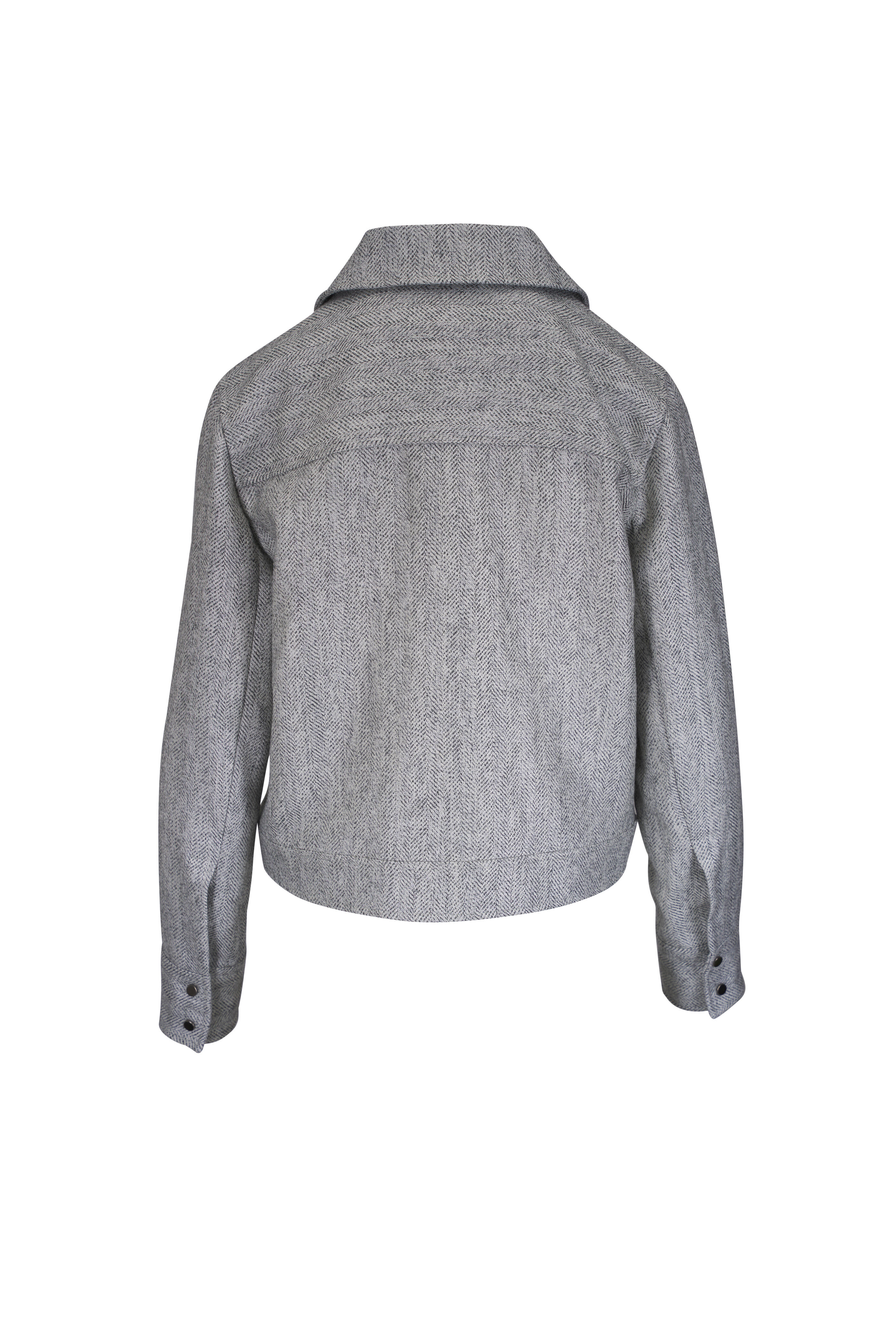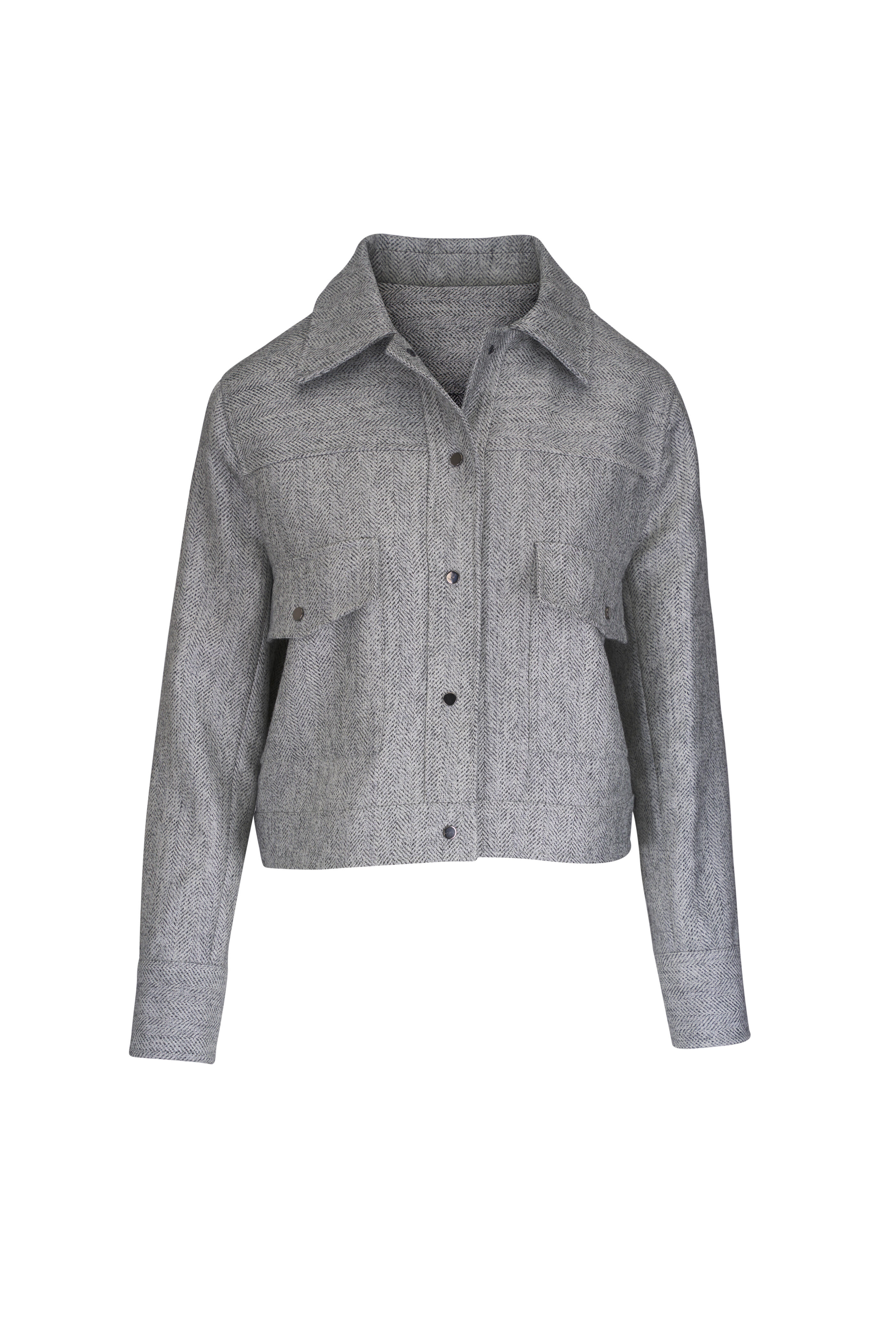 Point collar. Front button fastening. Two chest flap pockets. Made in Italy. 70% wool, 30% viscose. Dry clean.