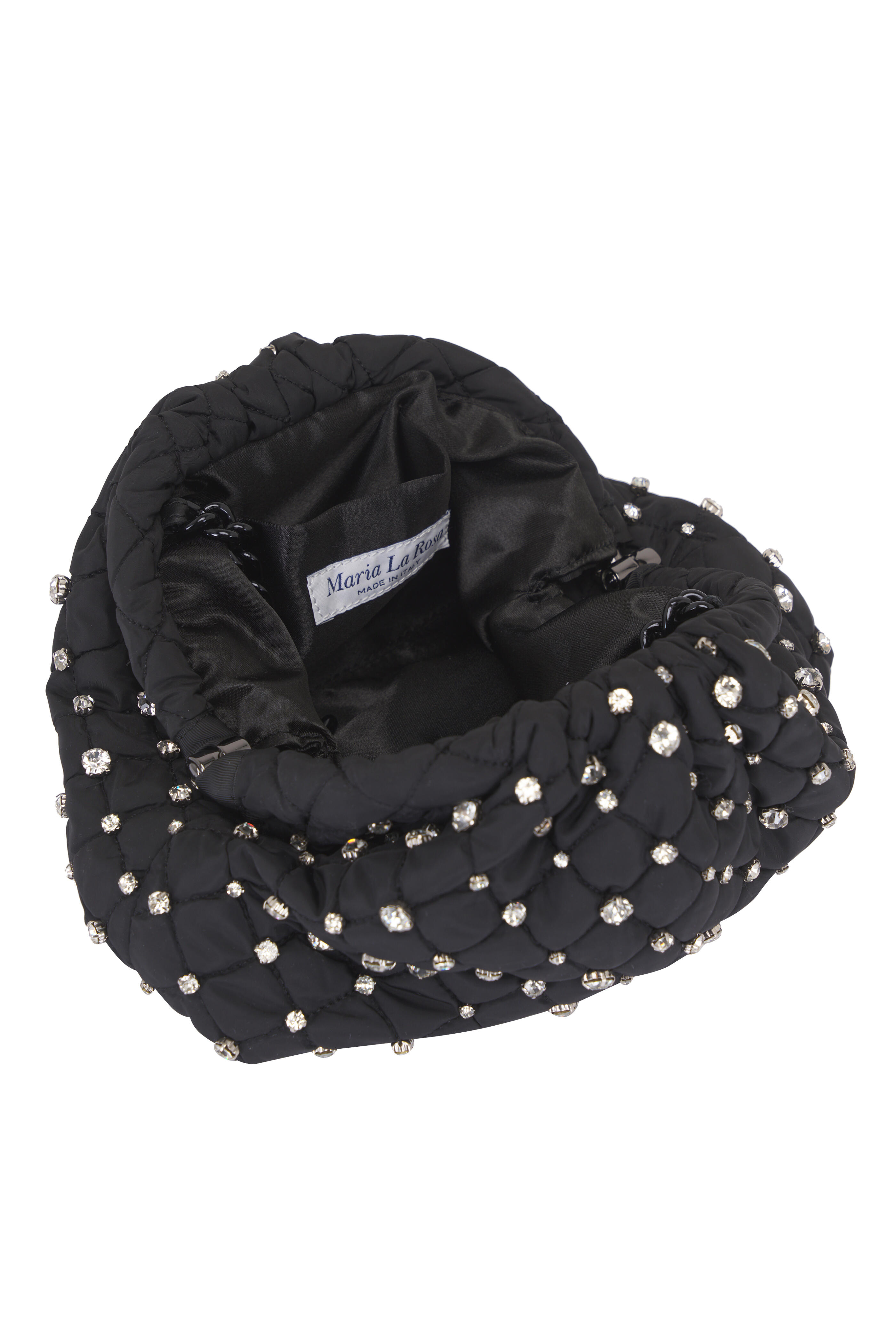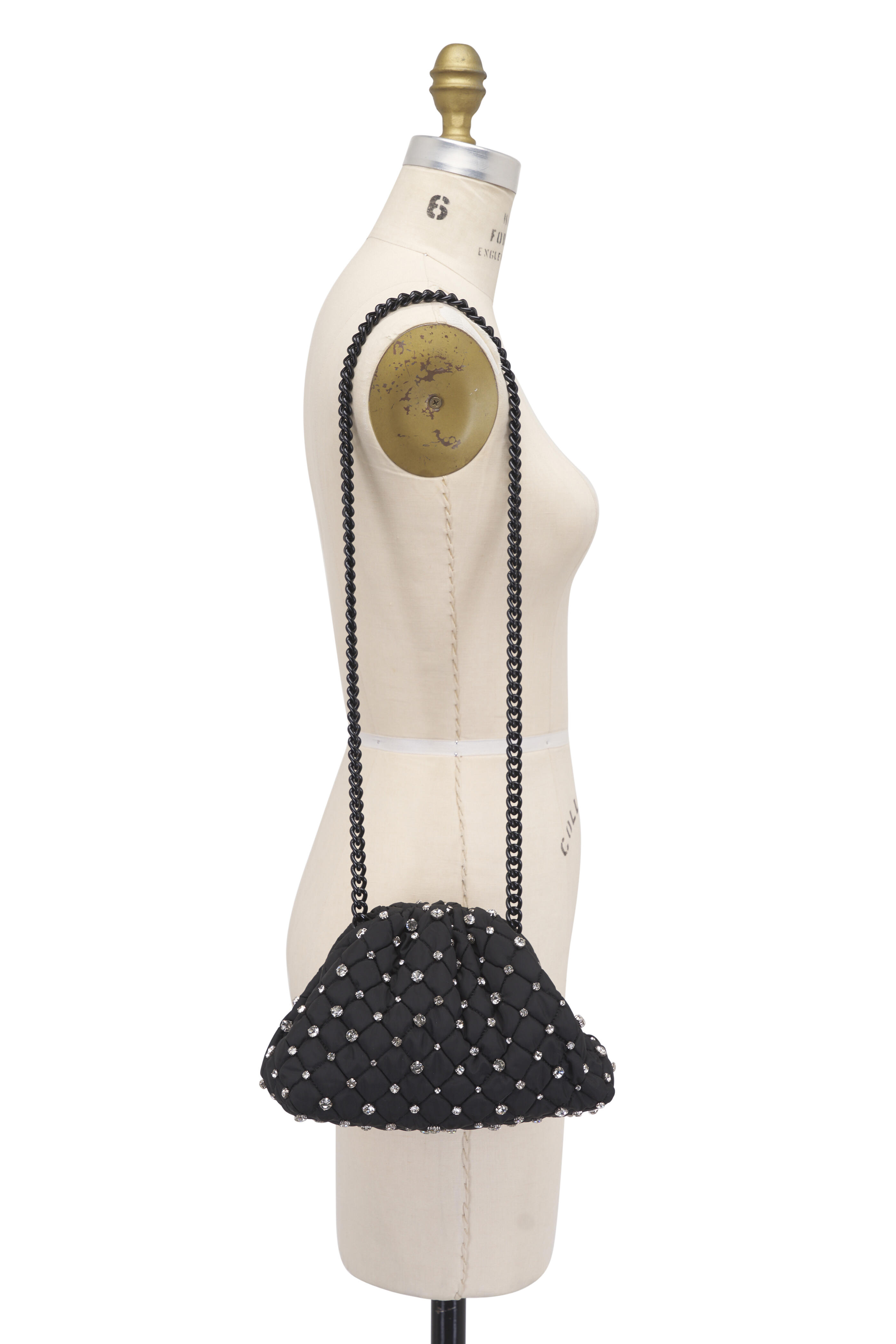 Quilted fabric. Black metal shoulder chain. Hinge closure. Single compartment; interior wall pocket. Satin lining. Hand embroidered rhinestones. Made in Italy. Width: 22 cm. Height: 16 cm. Depth: 8 cm.