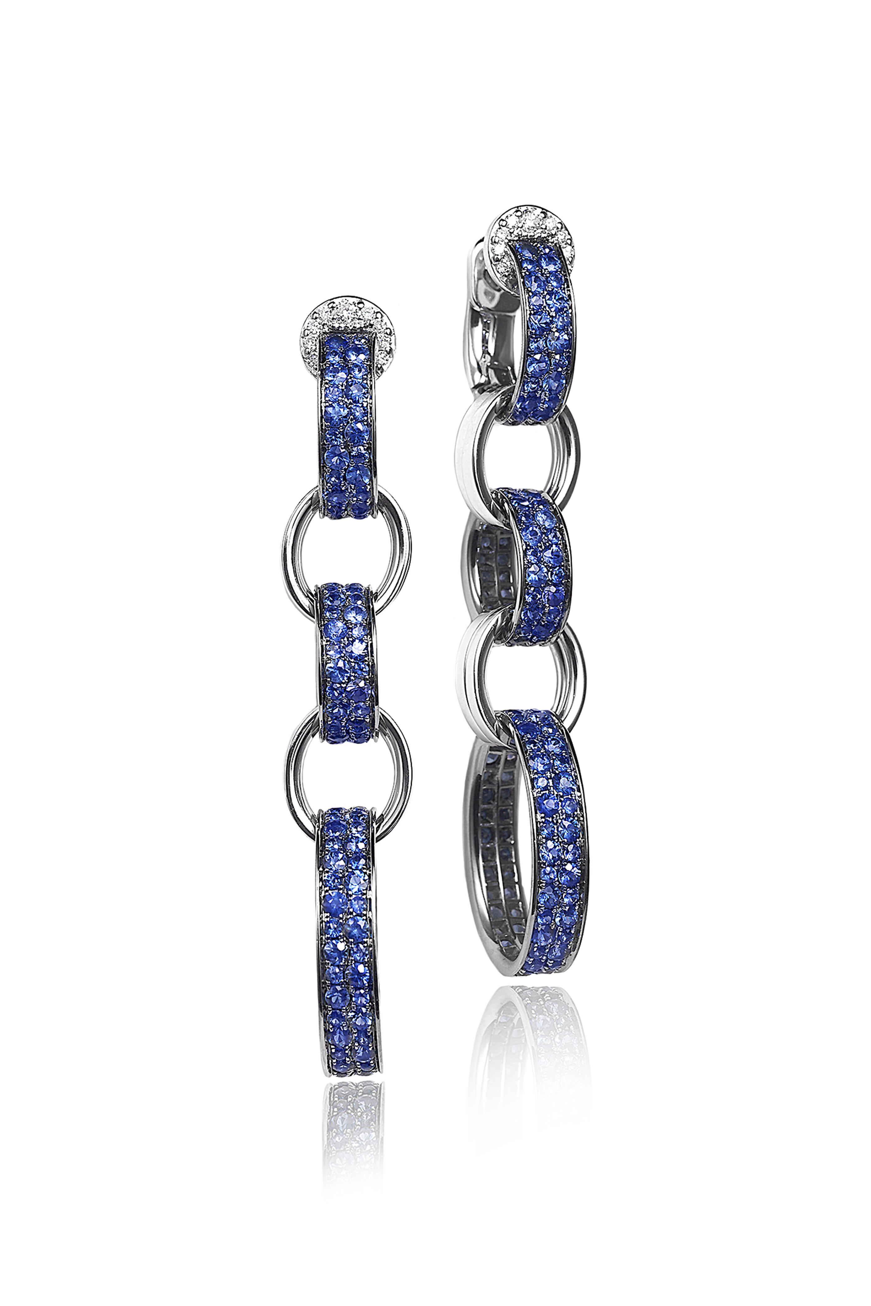 18k white gold. Black rhodium. 5.45 carat blue sapphire. .14 carat white diamonds.