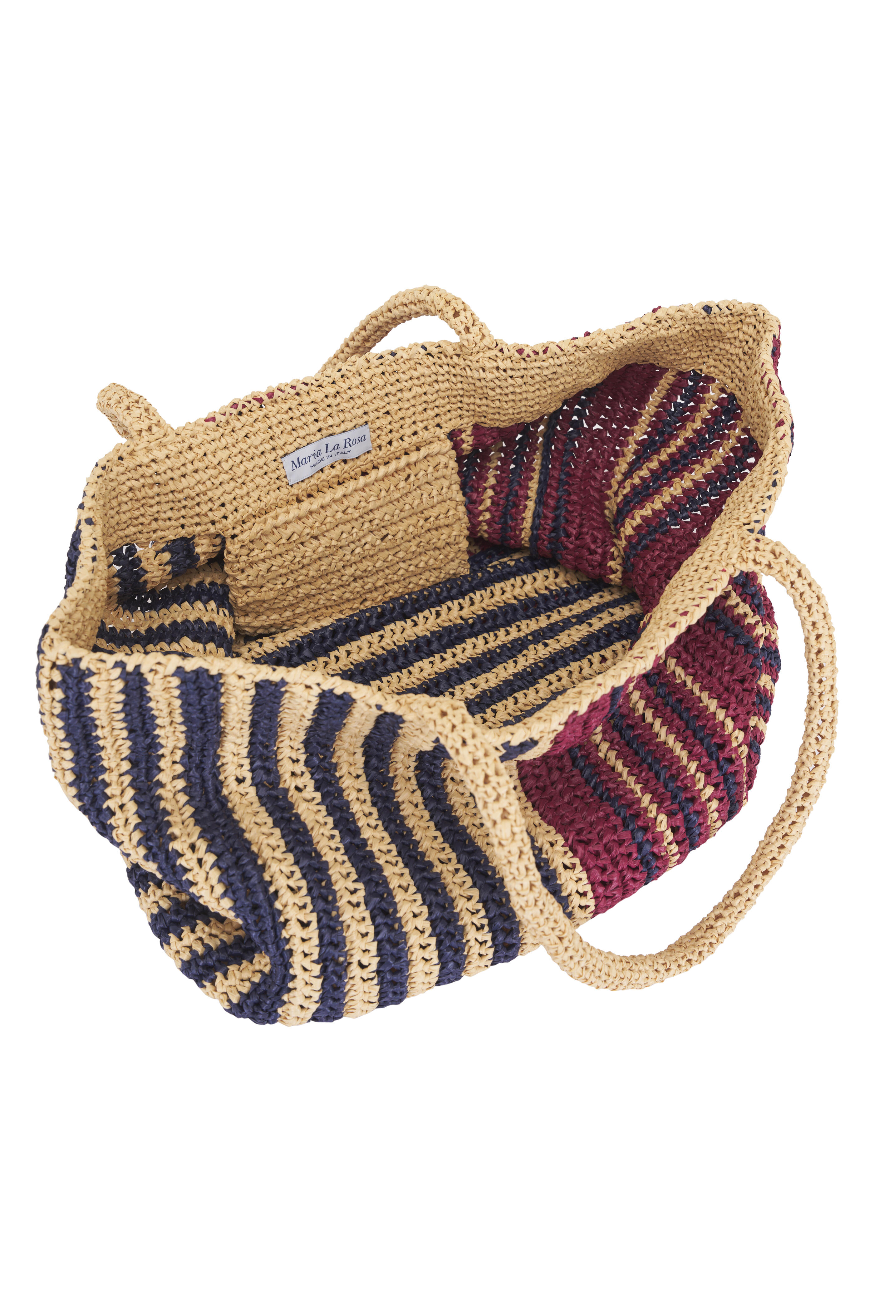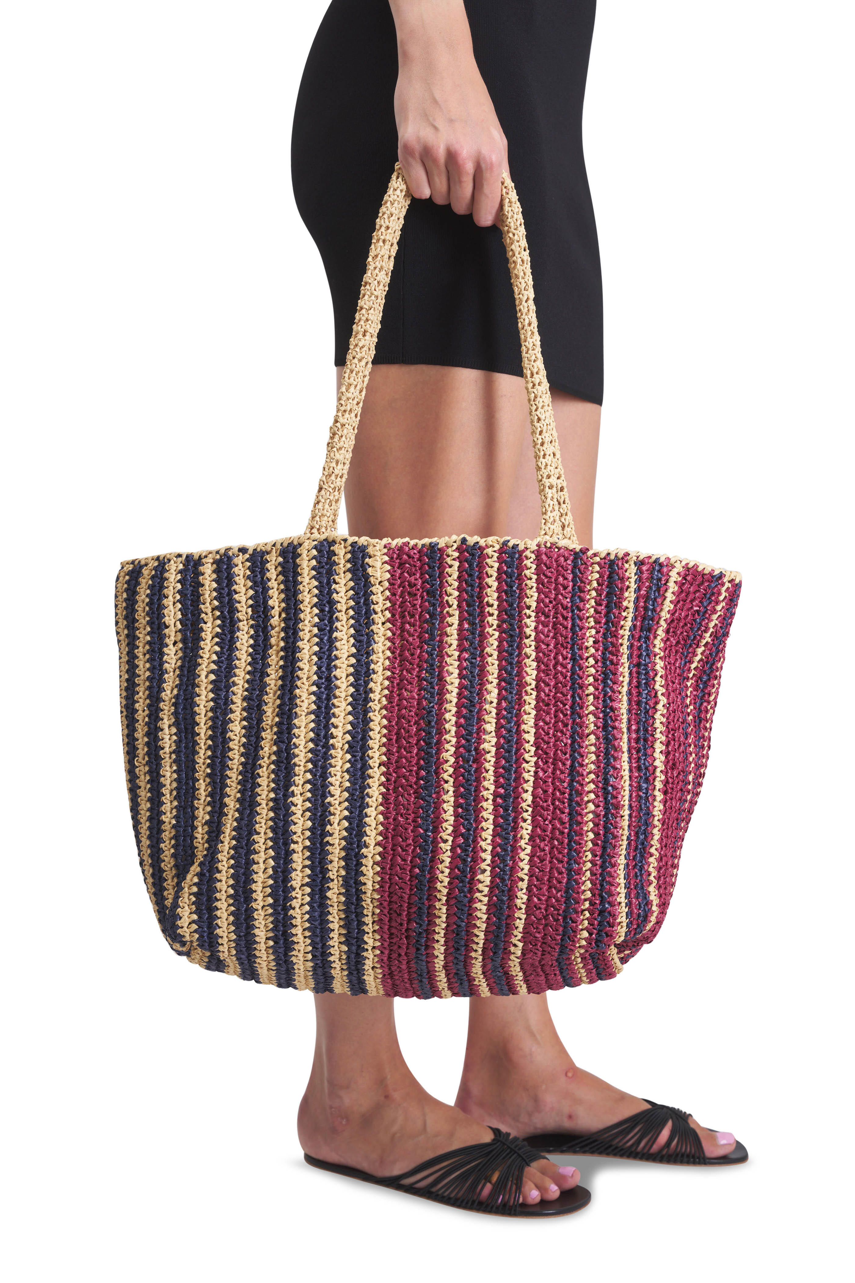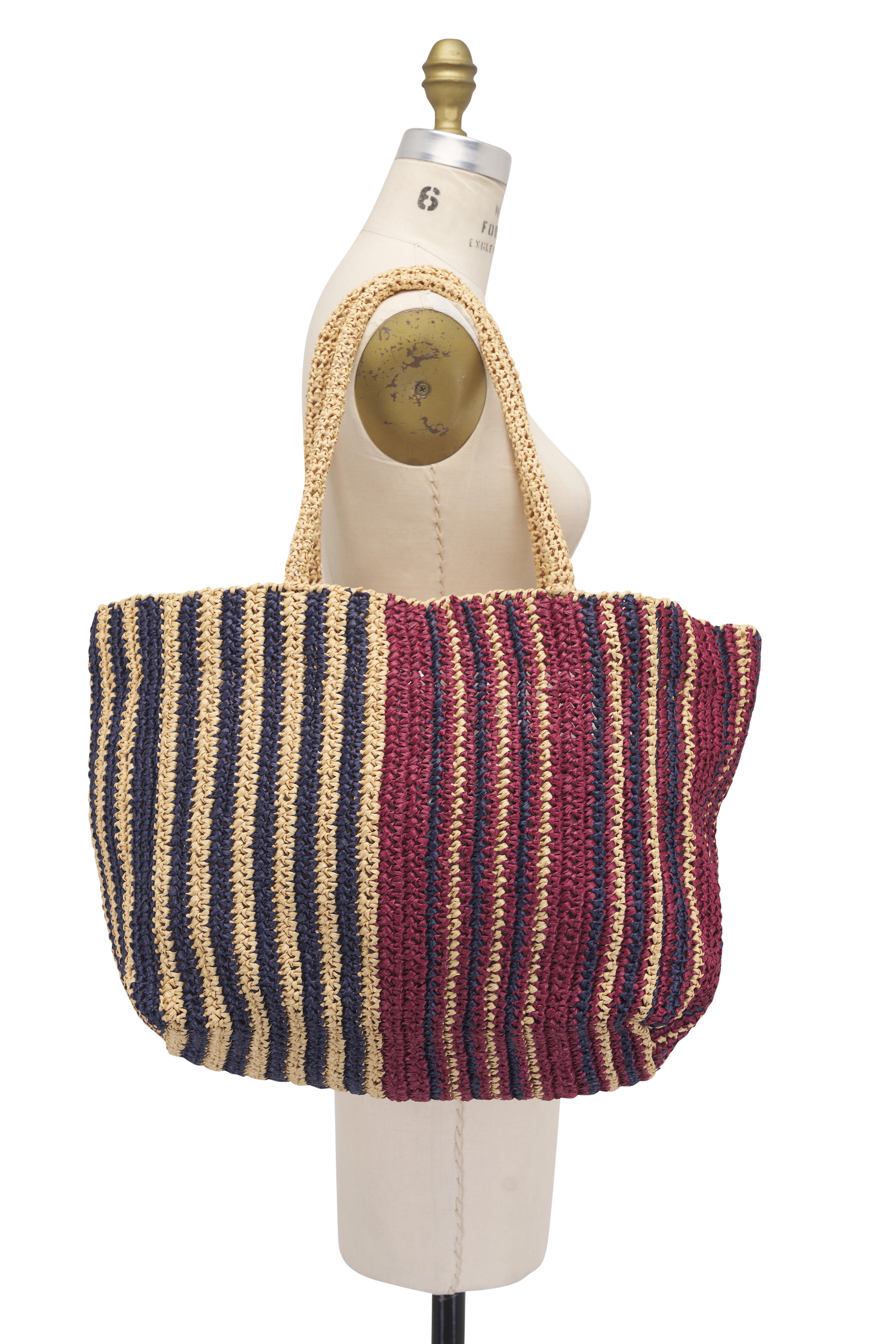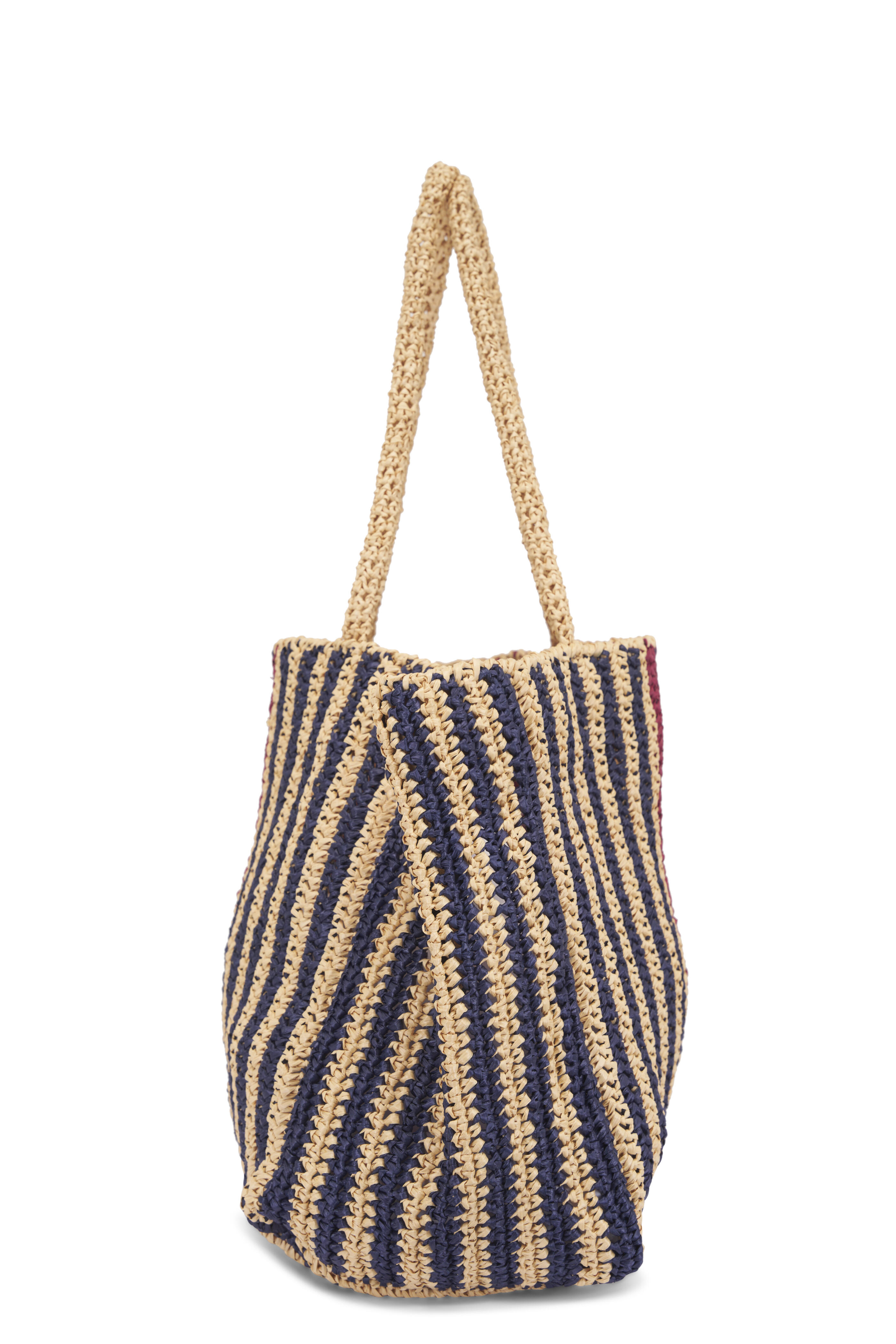 Raffia. Dual top handles. Open top, single compartment. One internal pocket. Unlined. Made in Italy. Height 13". Width 15". Depth 7". Handle Drop 10".