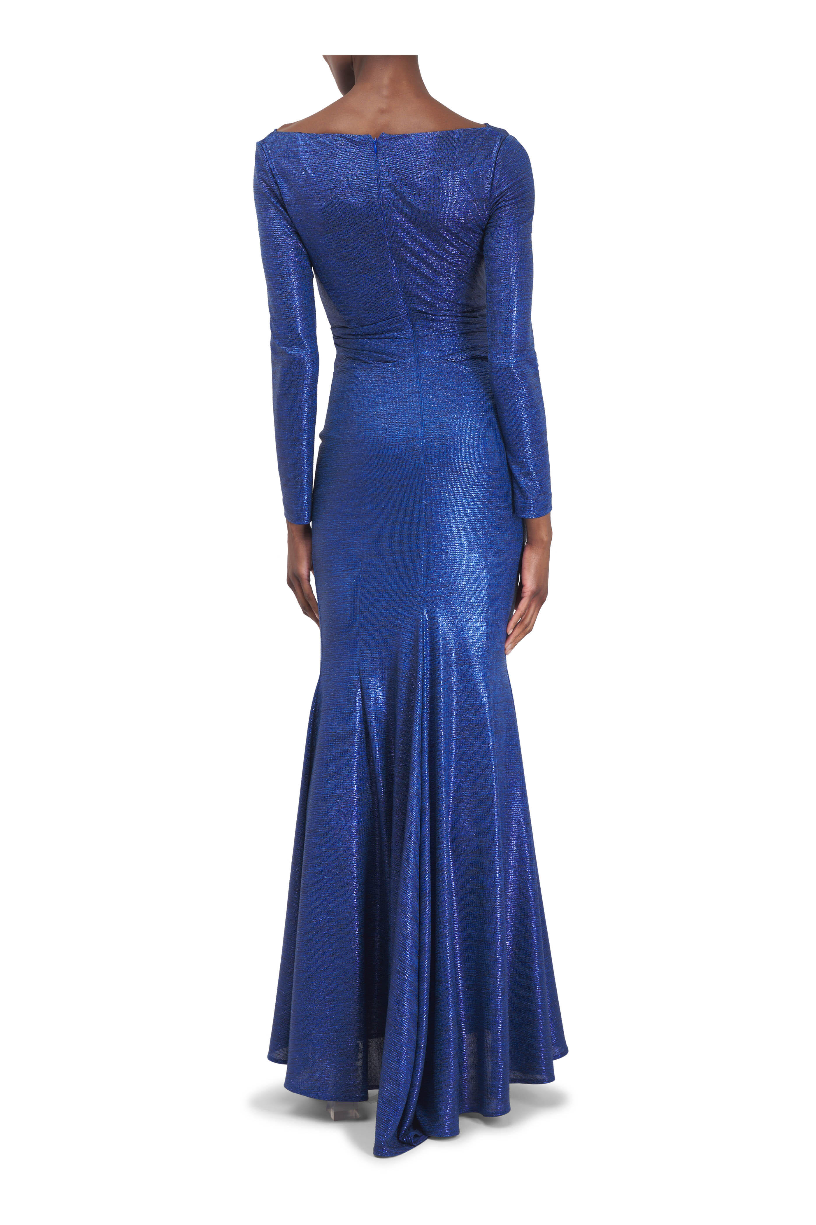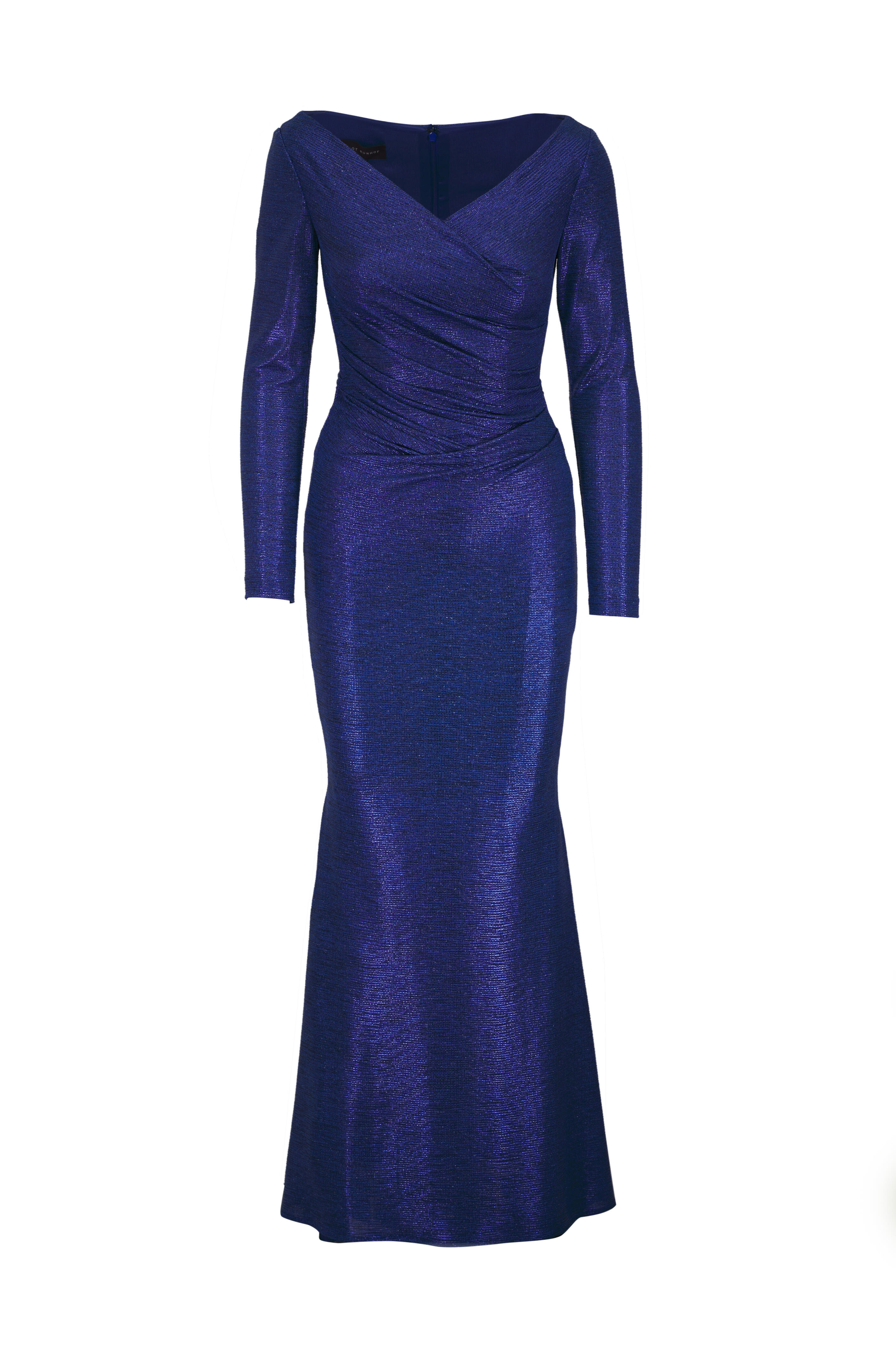 Wet clean. V-neckline. Concealed back zip. Ruched bodice. Train hem. Made in Germany. Style: OL0151-14. Color: MV15. Approximately 66" shoulder to hem( measurements taken from size 8). 95% polyester, 5% elastane; fully lined.