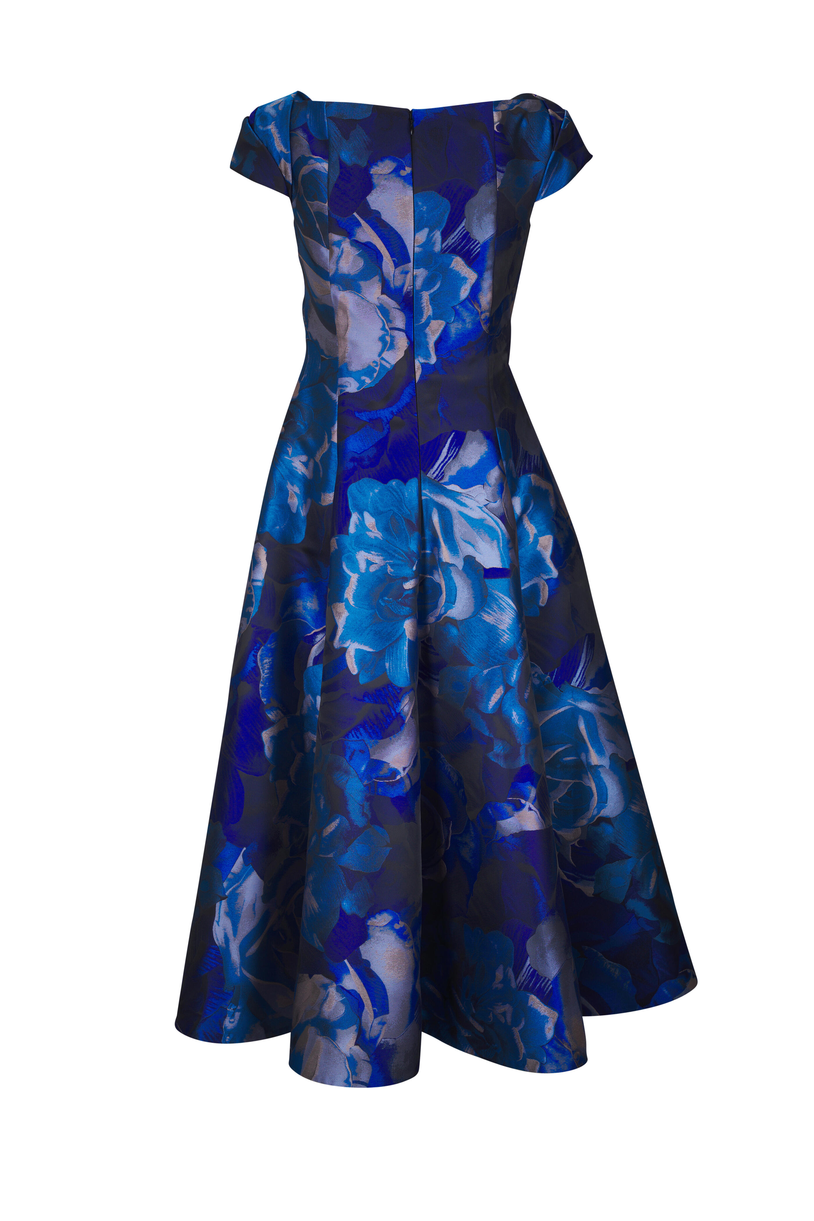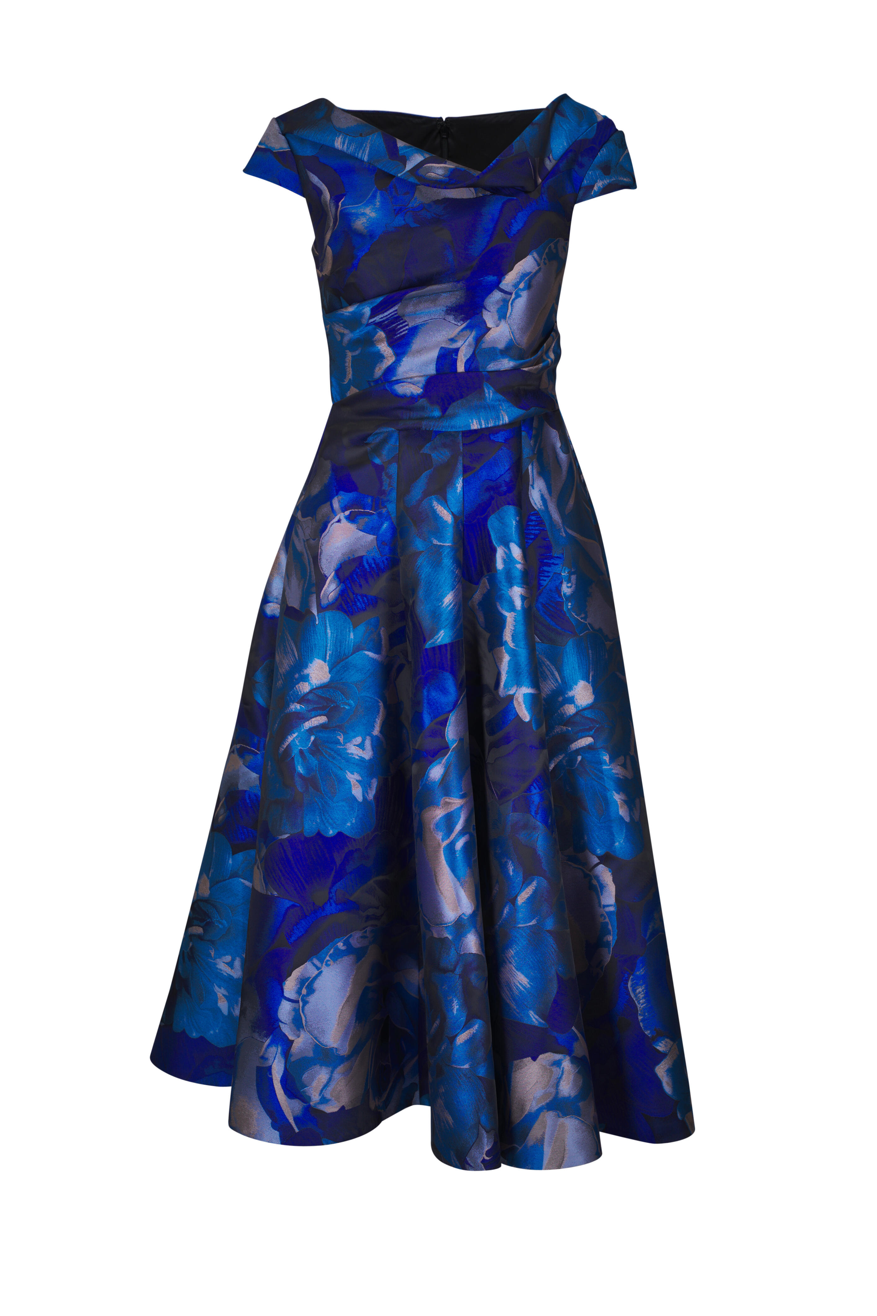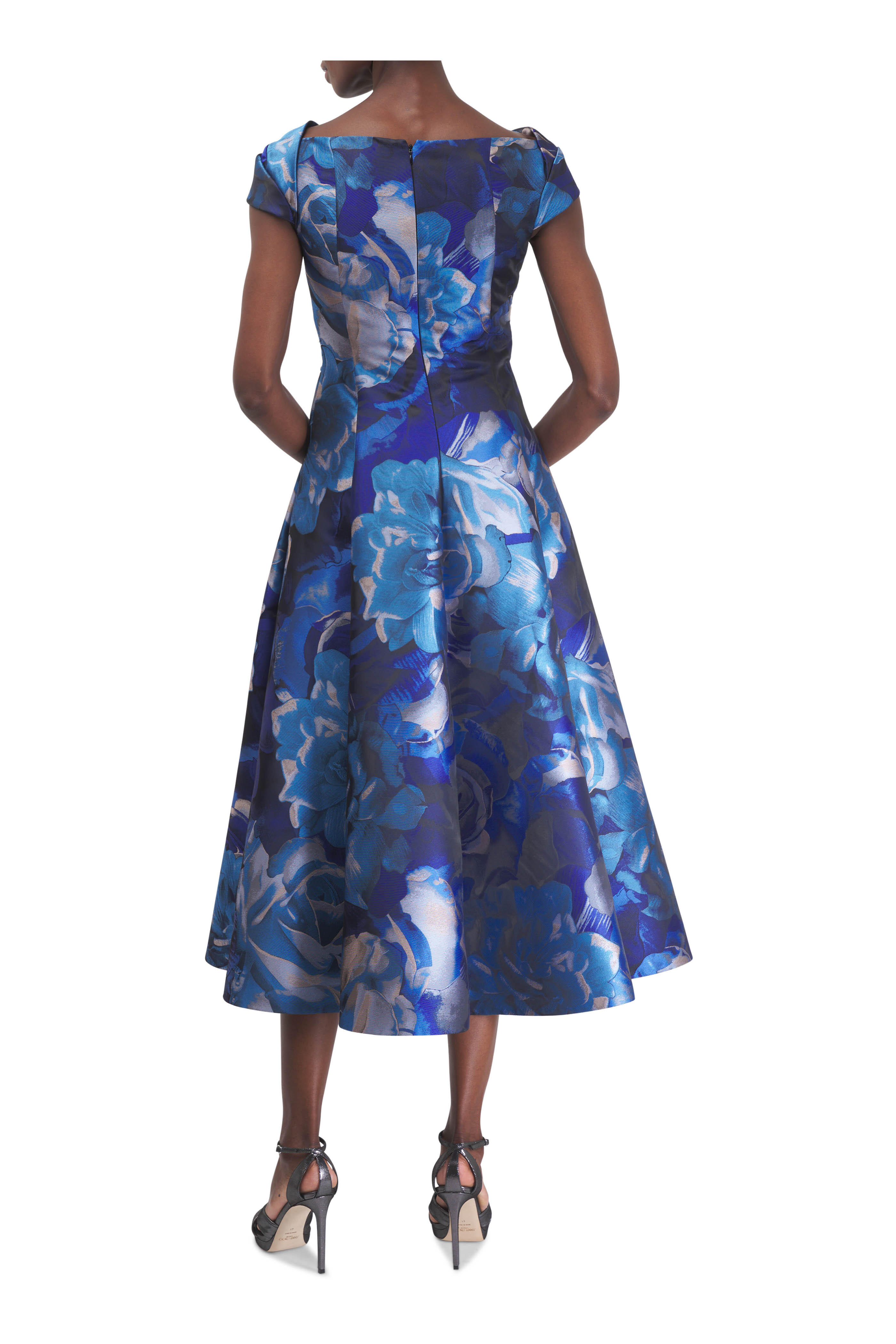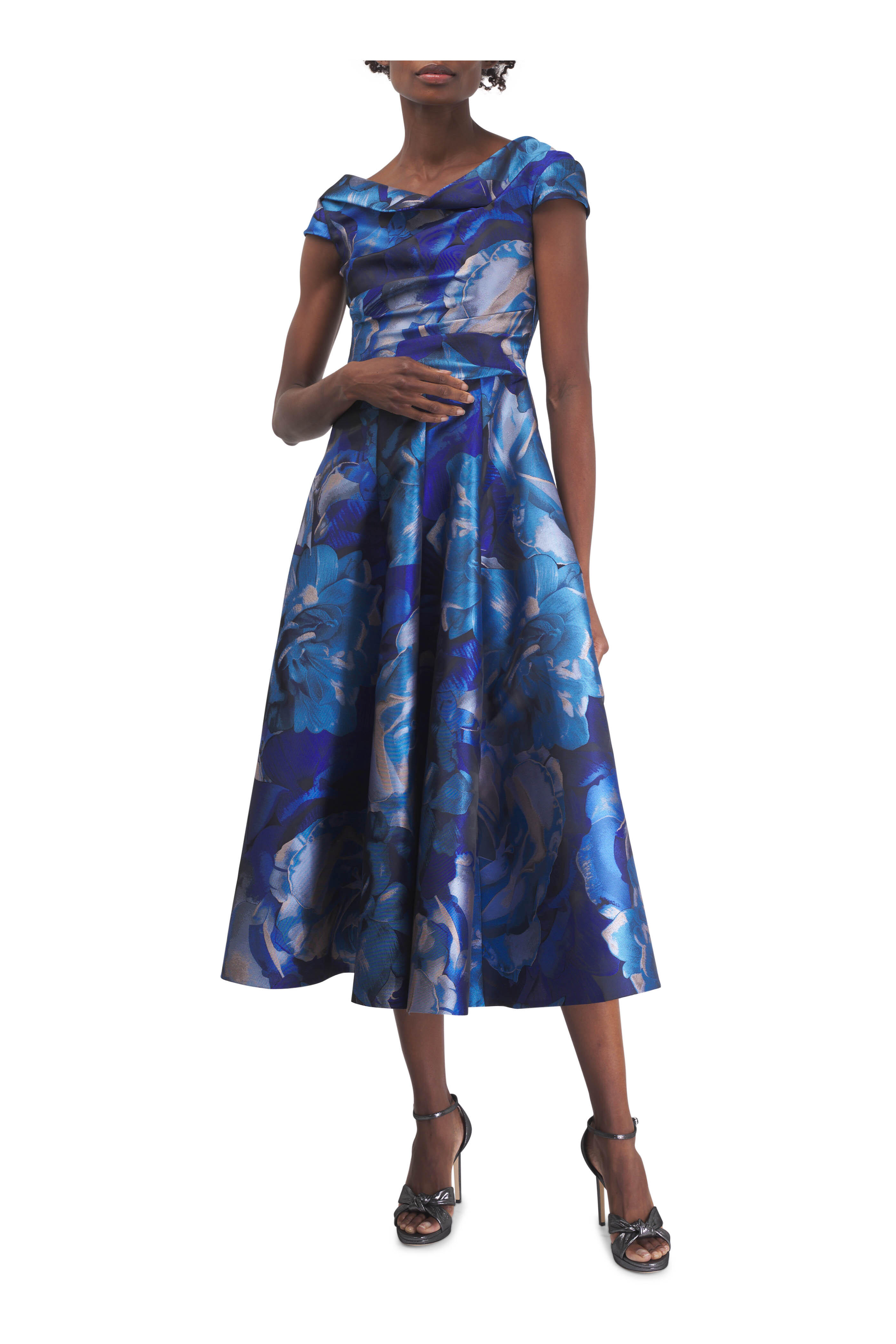 Asymmetrical neckline. Concealed back zip. Side slip pockets; velvet lined. Made in Germany. Approximately 50" shoulder to hem (measurements taken from size 6). 100% polyester; lined. Dry clean.