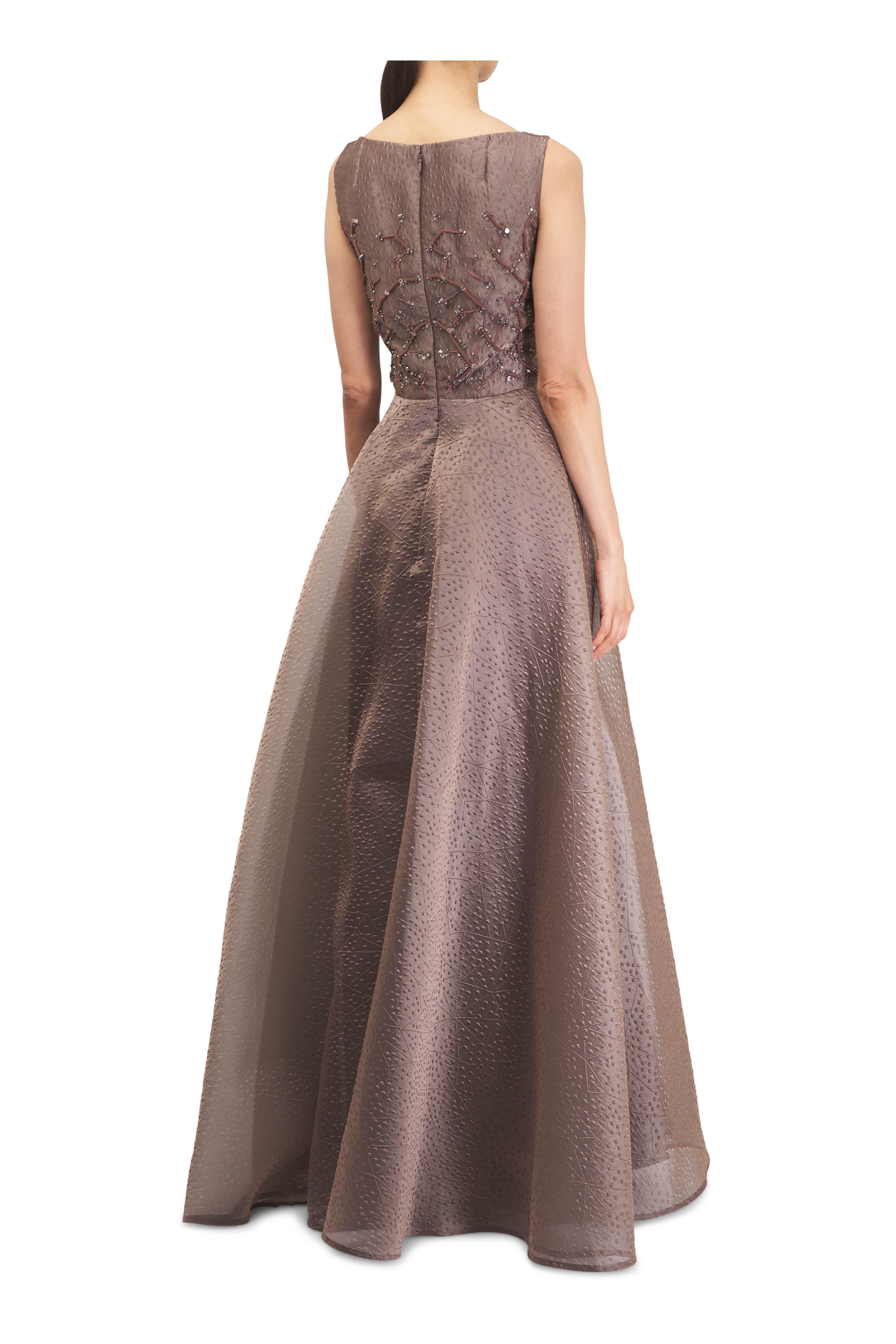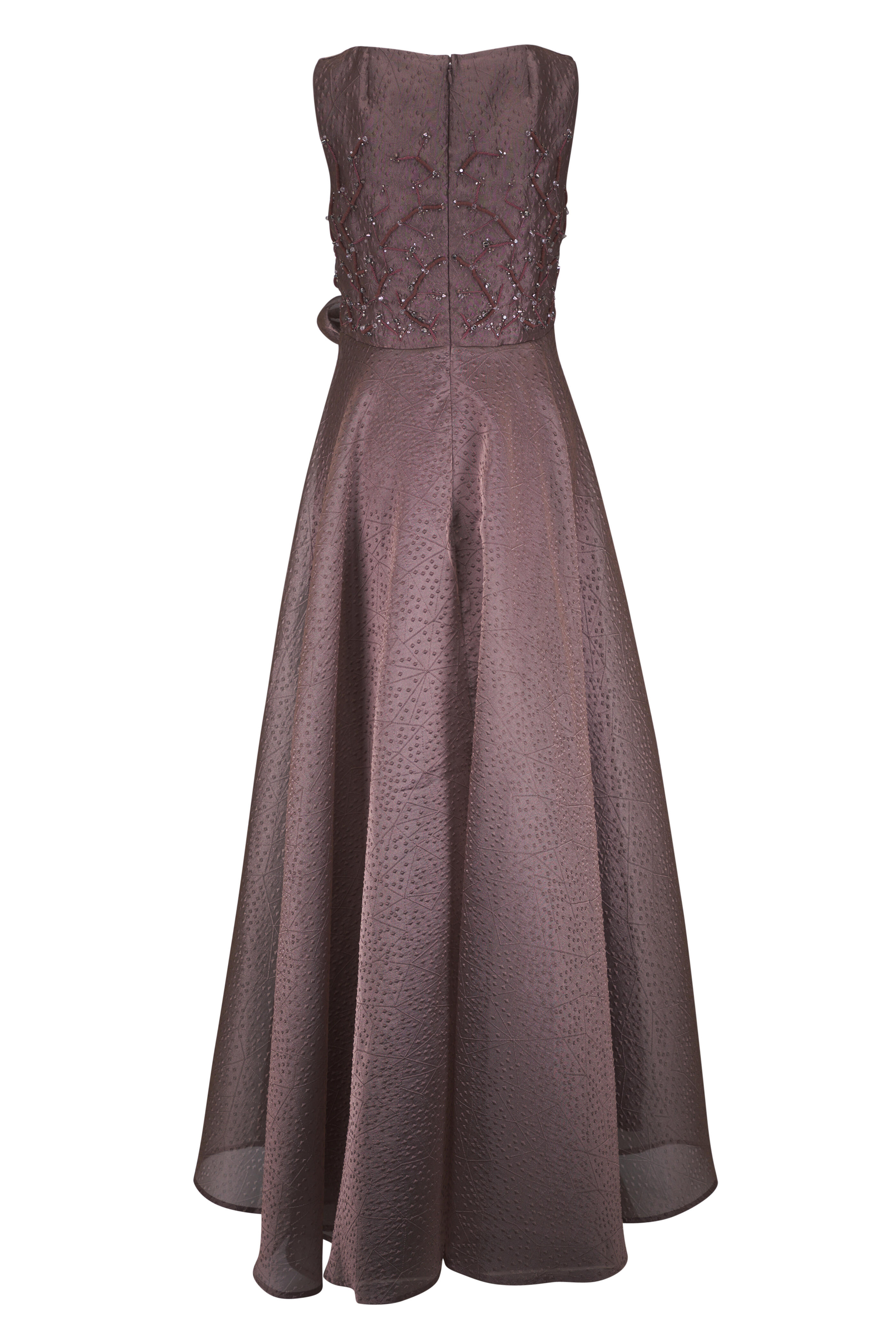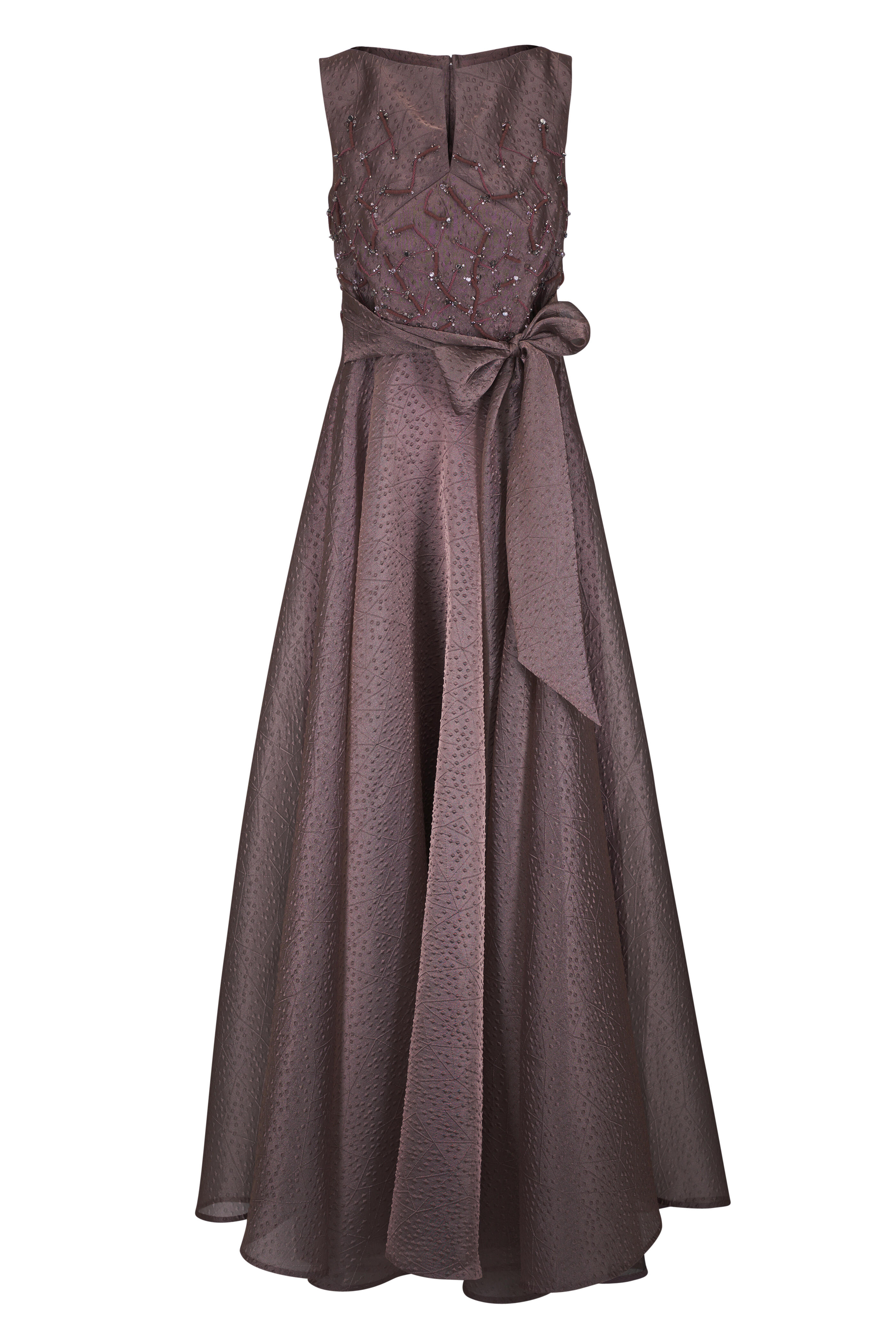 Bateau neckline with split. Concealed back zip. Attached bow. Imported. Floor length. 100% polyester; lined. Dry clean.