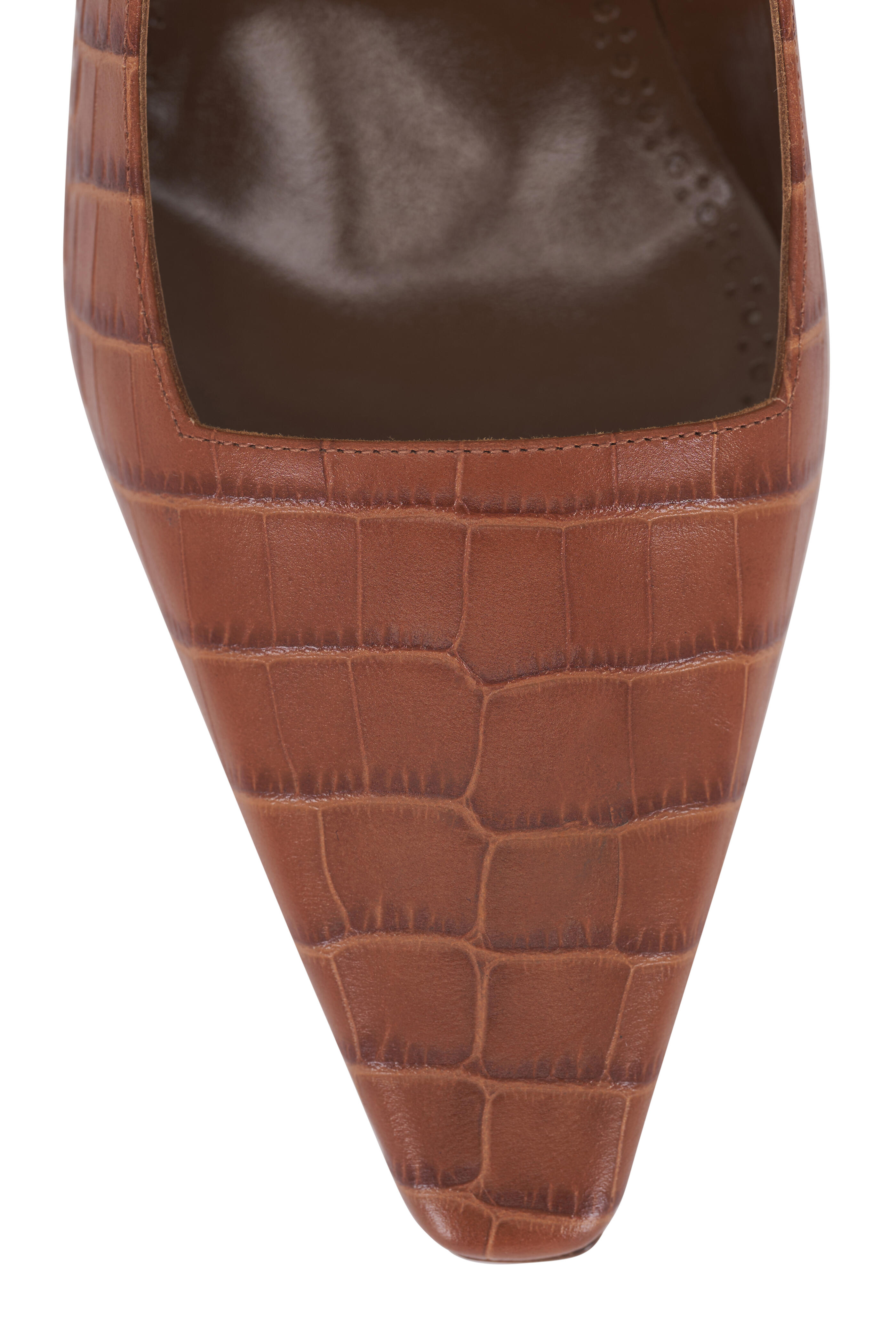 Embossed leather upper. Closed, pointed toe. Slip on style. Leather lining and insole. Self-covered stiletto heel. Leather sole. Made in Italy. Heel meausrement: 70mm.