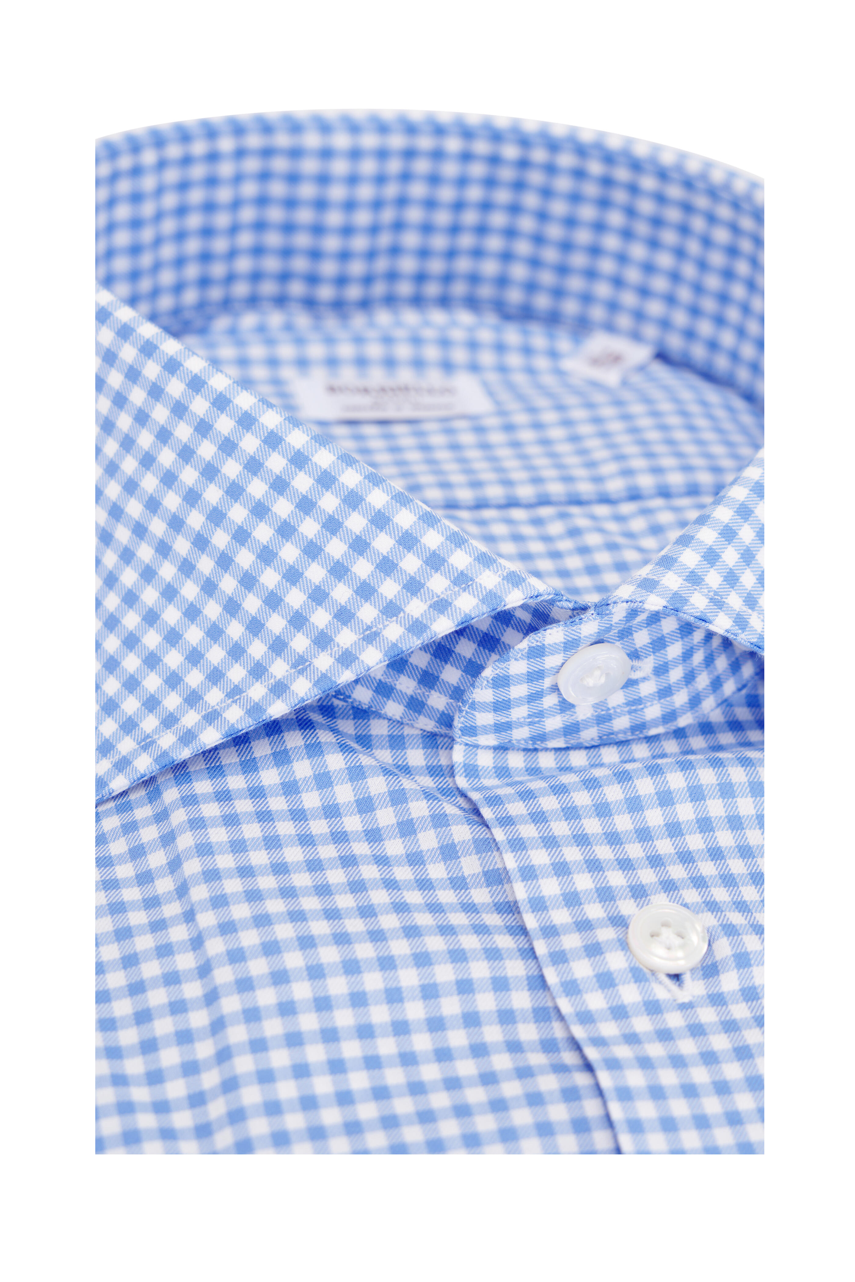 Spread collar. French placket. Single button mitered cuffs. Made in Italy. 100% cotton. Machine wash.