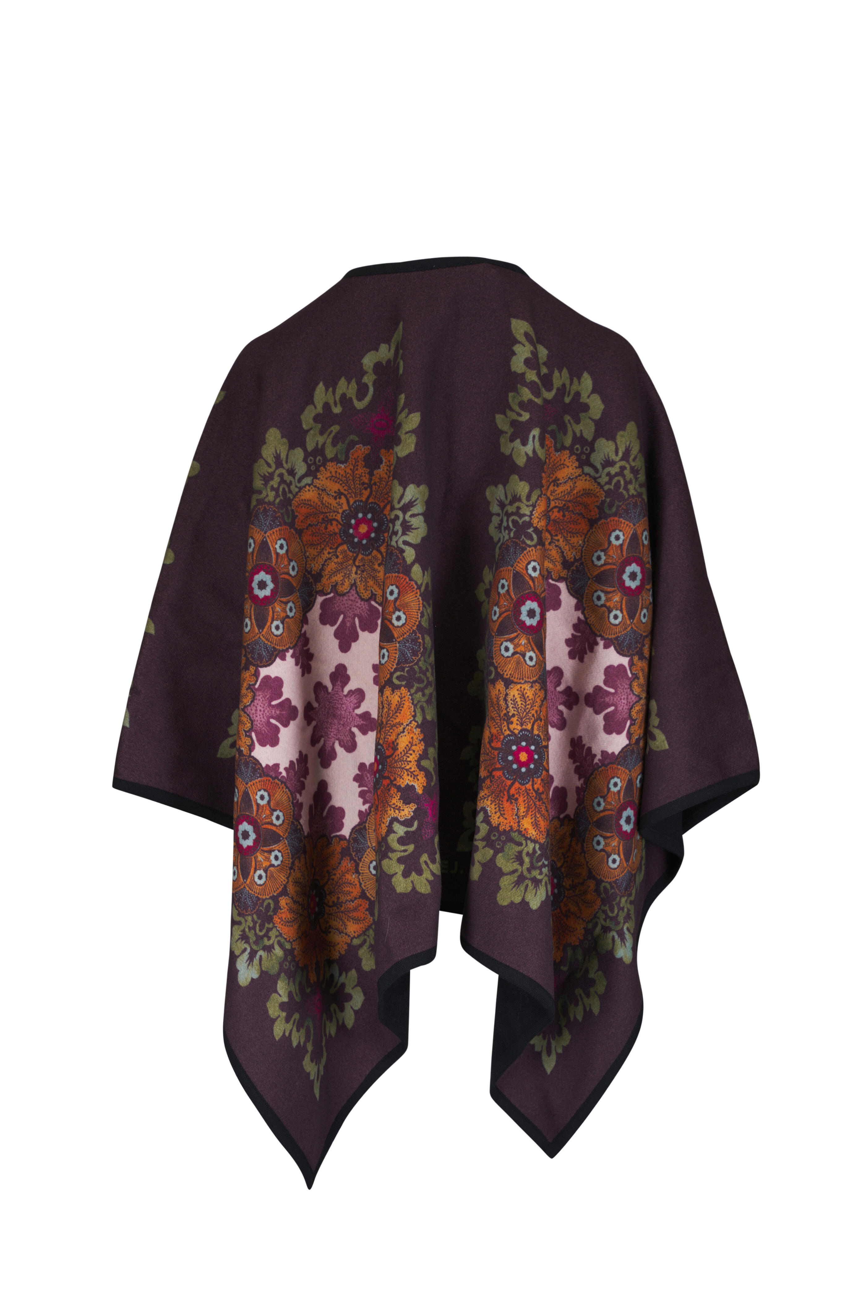 Open front. Blanket wrap. Hand placed print. Made in Italy. 100% virgin wool. Dry clean.
