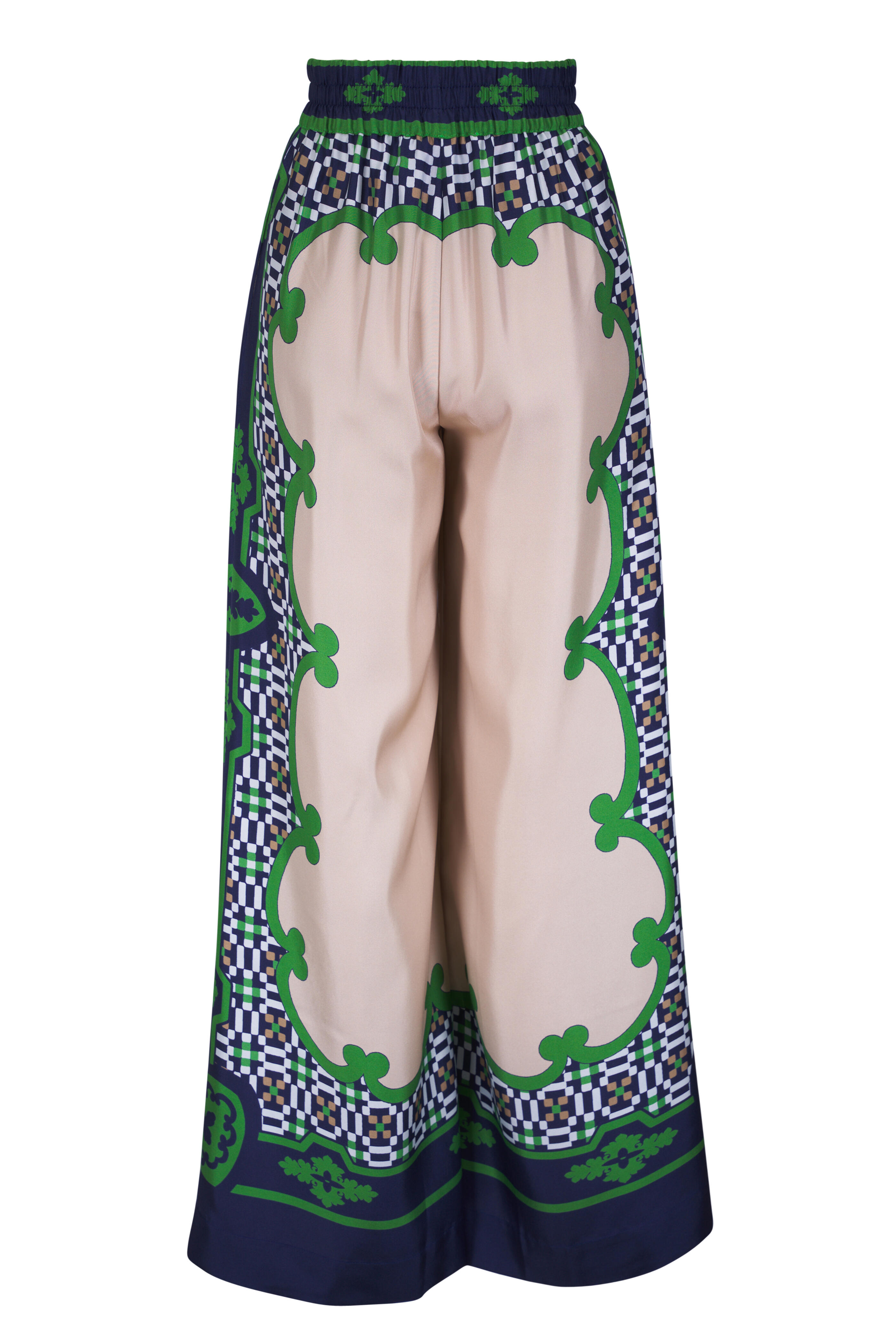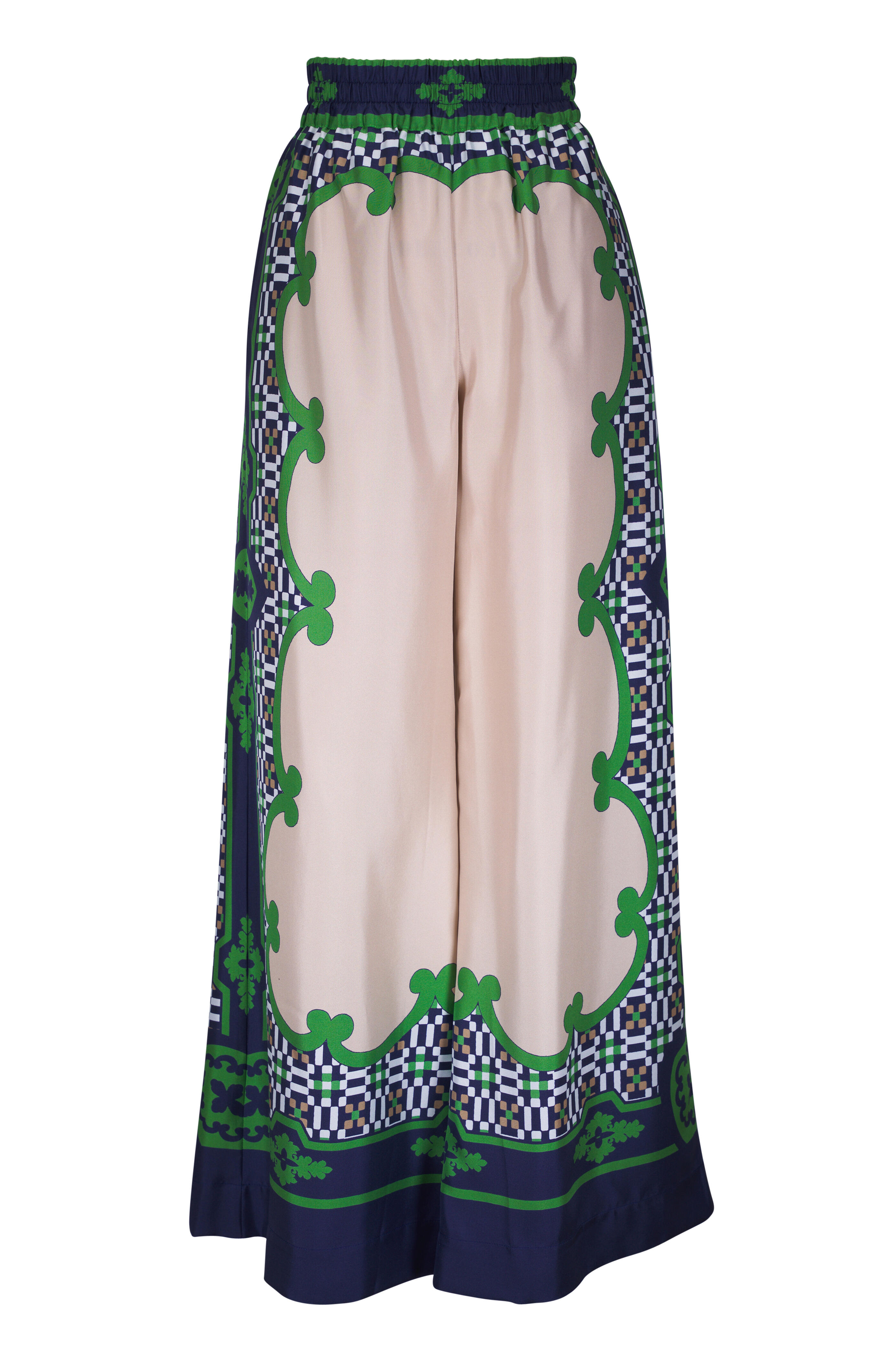 Elasticized waist. Side slip pockets. Made in Italy. 30" inseam. 100% silk. Dry clean.