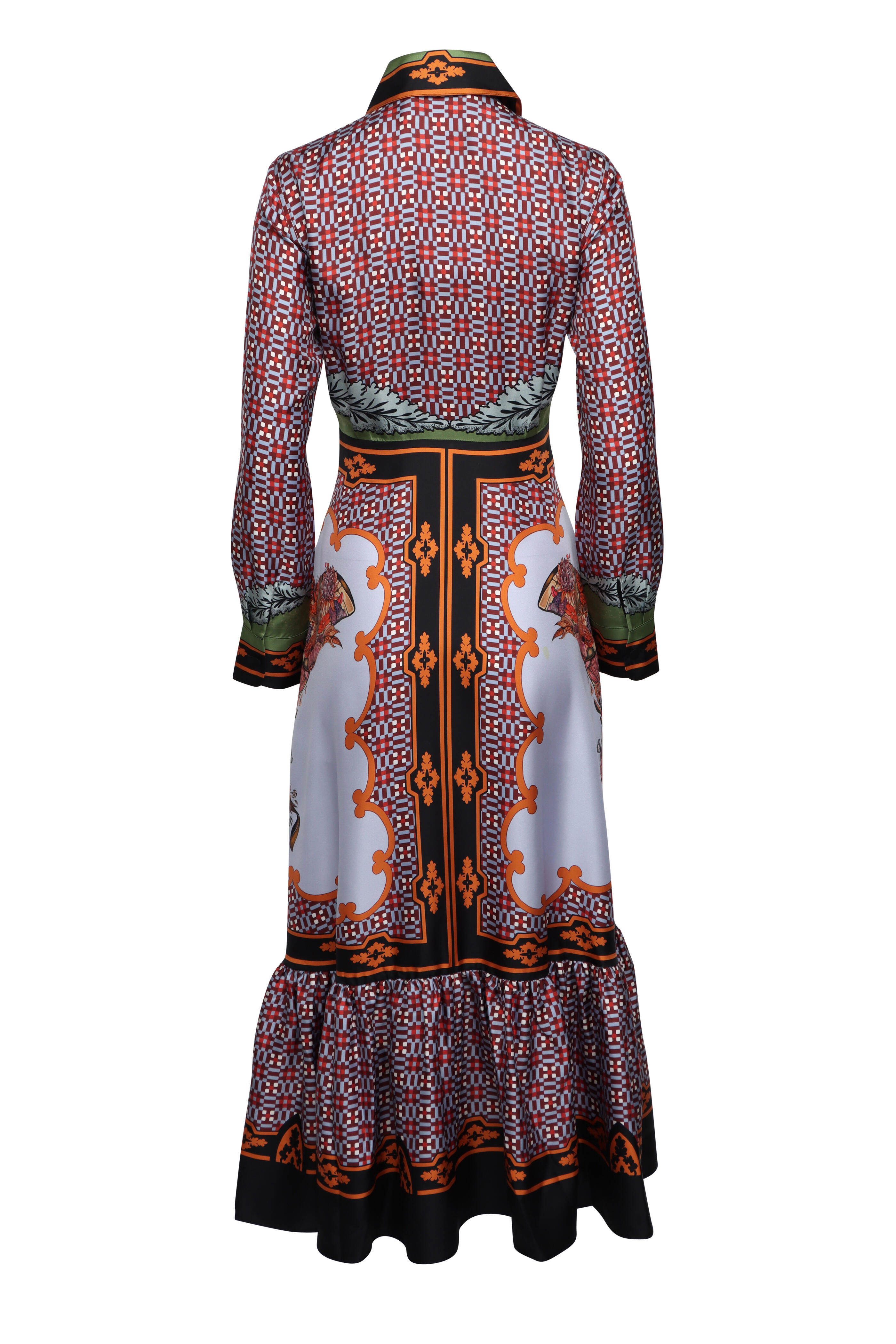 Collar. Long sleeves; button cuffs. Quarter button placket. Concealed side zip closure. Aline skirt. Flounce hem. Made in Italy. Bust 33’’ (Size S). Waist 26’’ (Size S). Hip 37’’ (Size S). Ankle to maxi length. 100% silk. Dry clean.