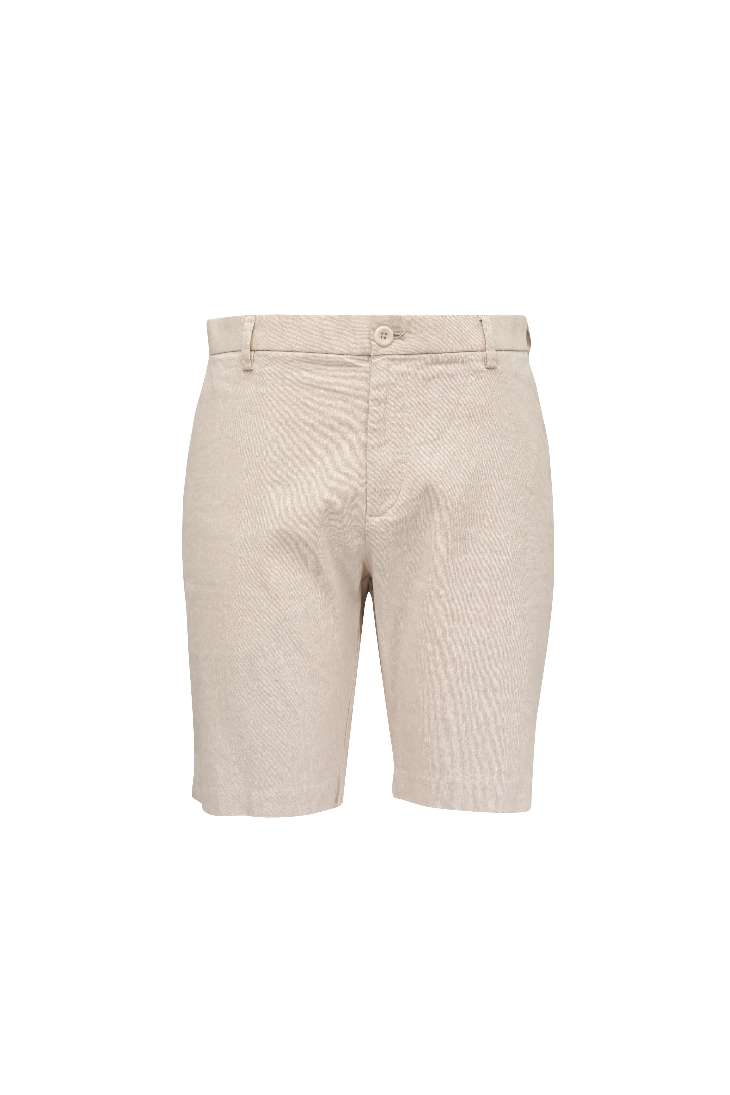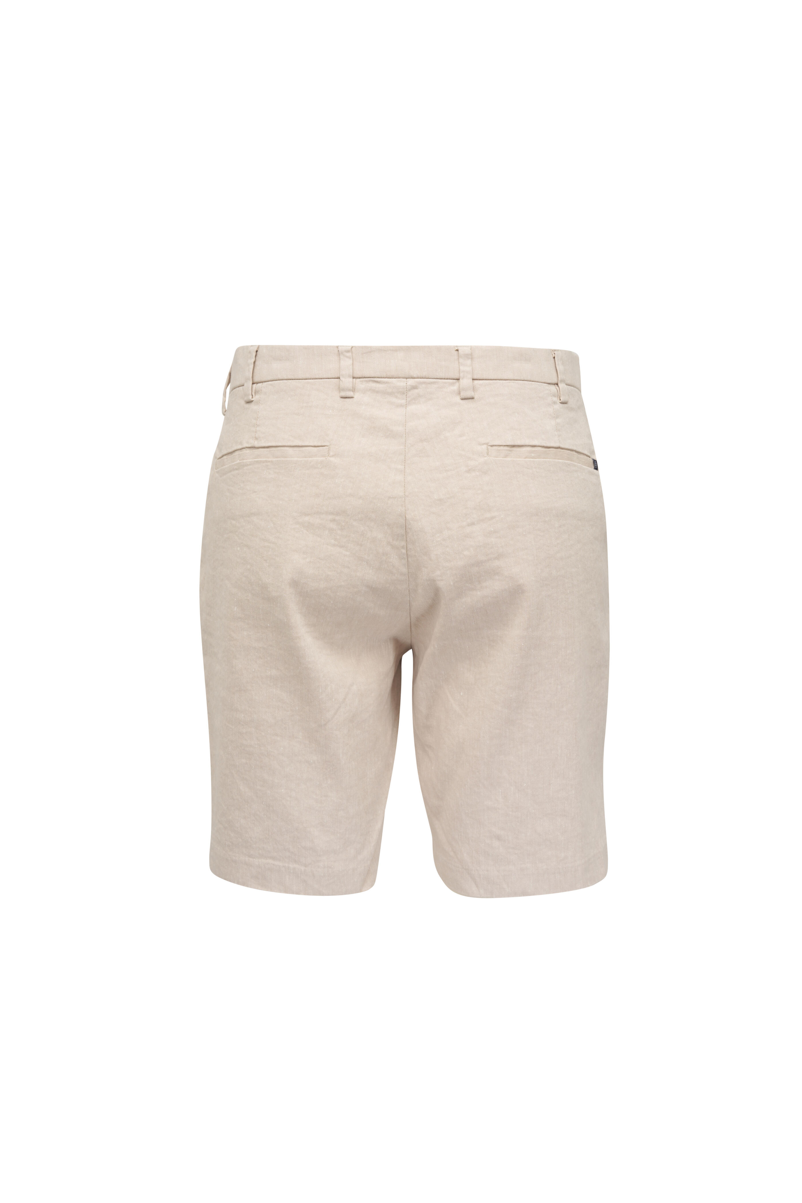 Zip fly; button closure. Elasticized waist; belt loops. Front slip pockets; back welt pockets. Imported. Inseam 10" (size 36). 4x stretch. 66% linen, 32% cotton, 2% spandex. Machine wash.