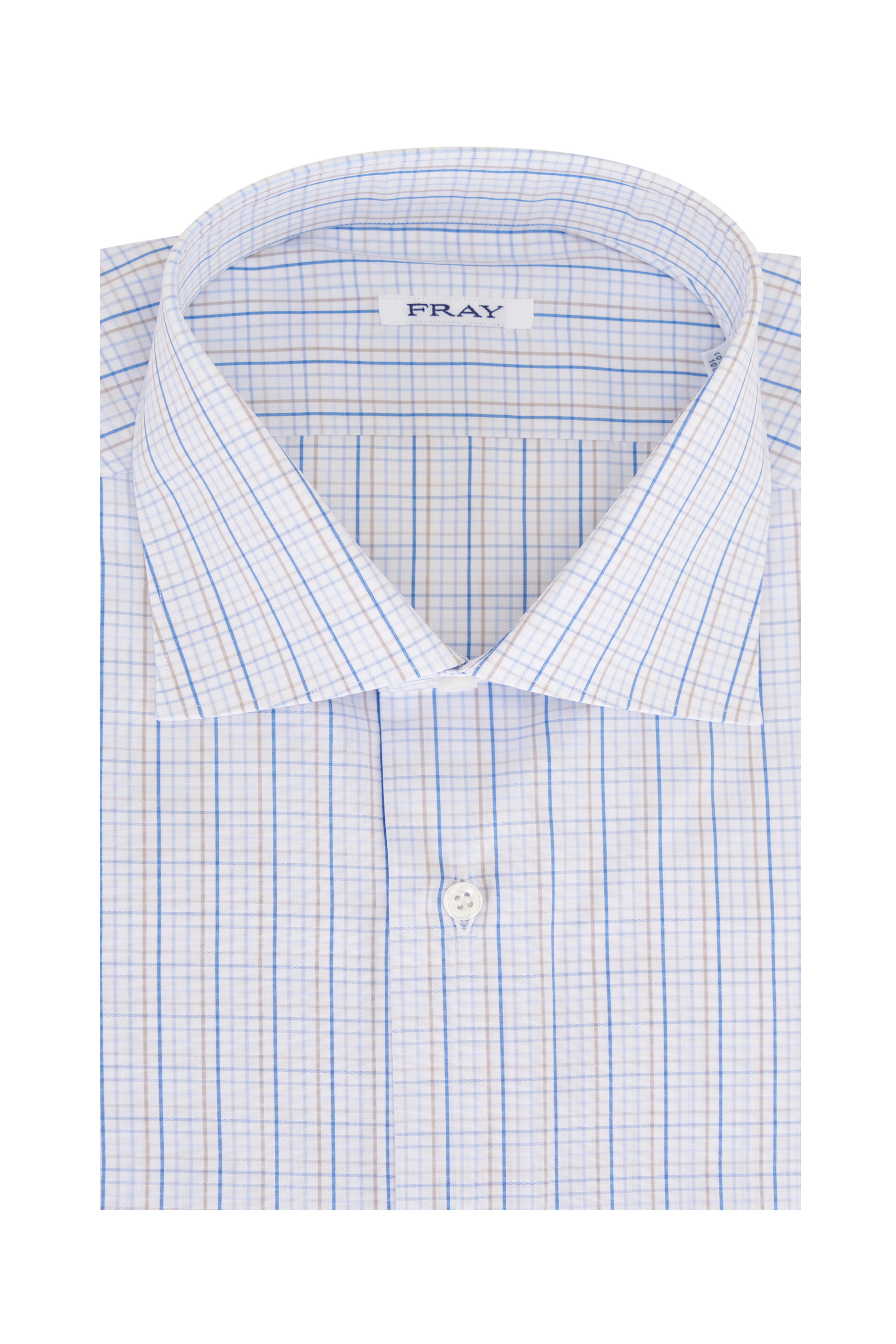 Spread collar. French front button placket. Single button barrel cuffs. Made in Italy. 100% cotton. Machine wash.