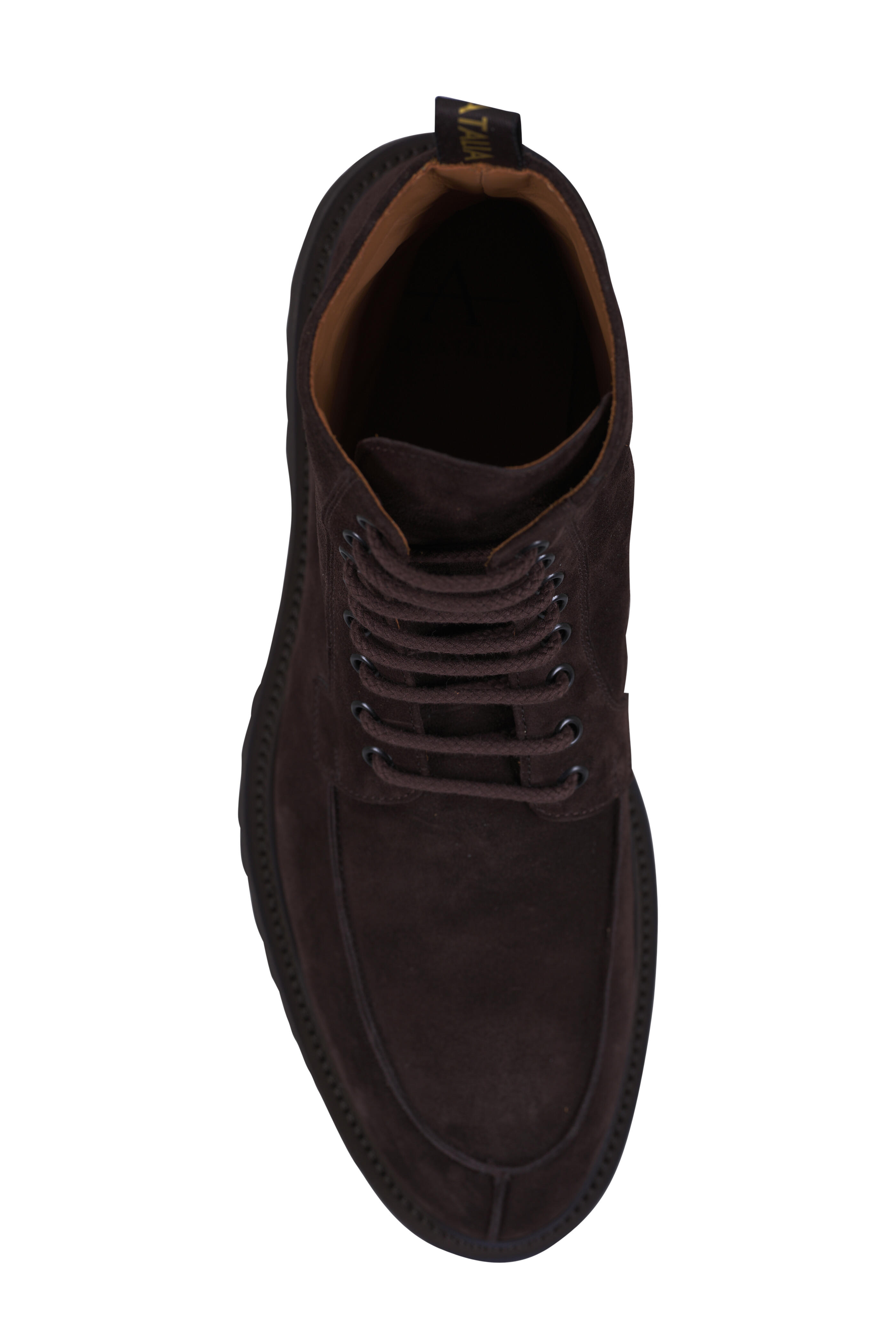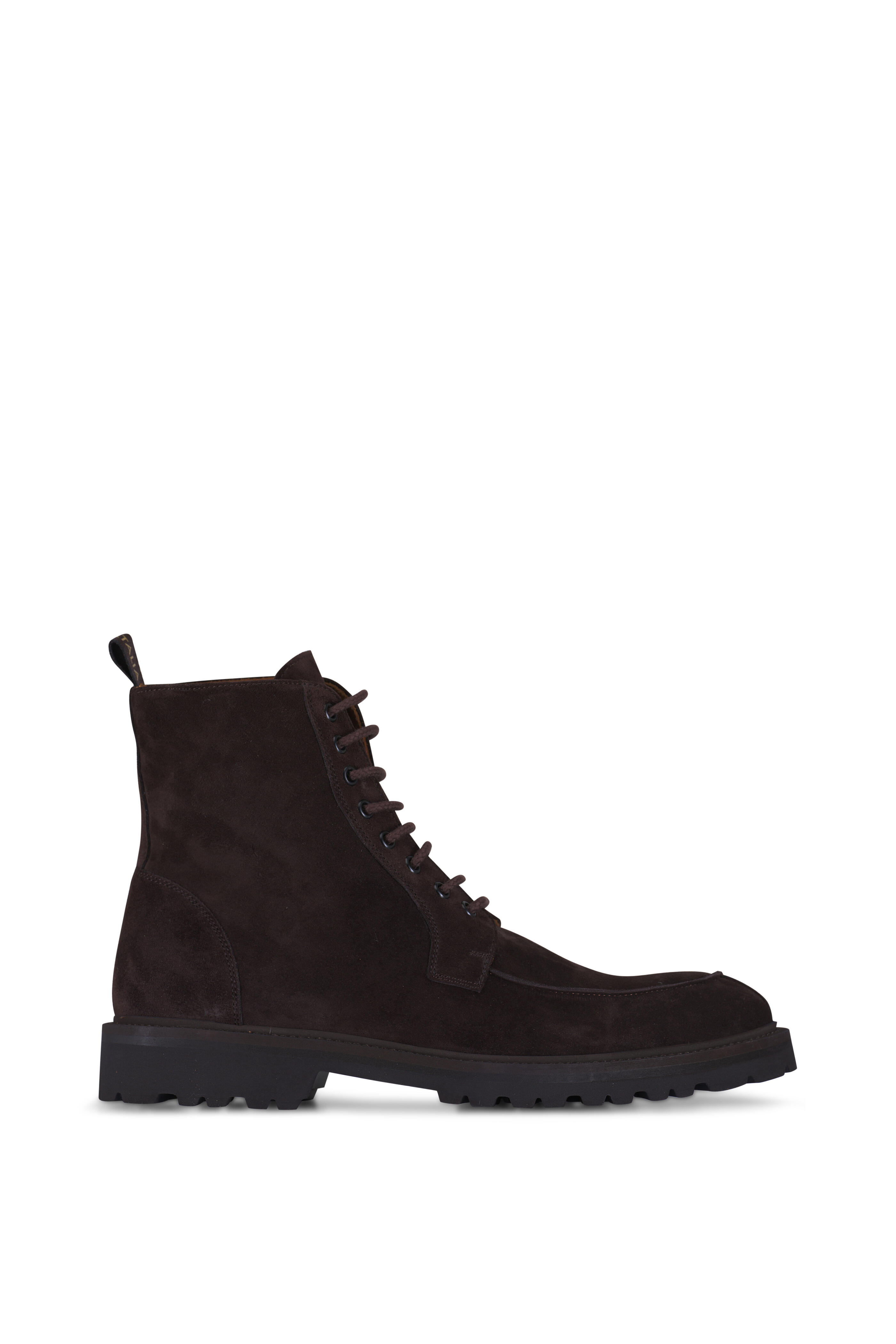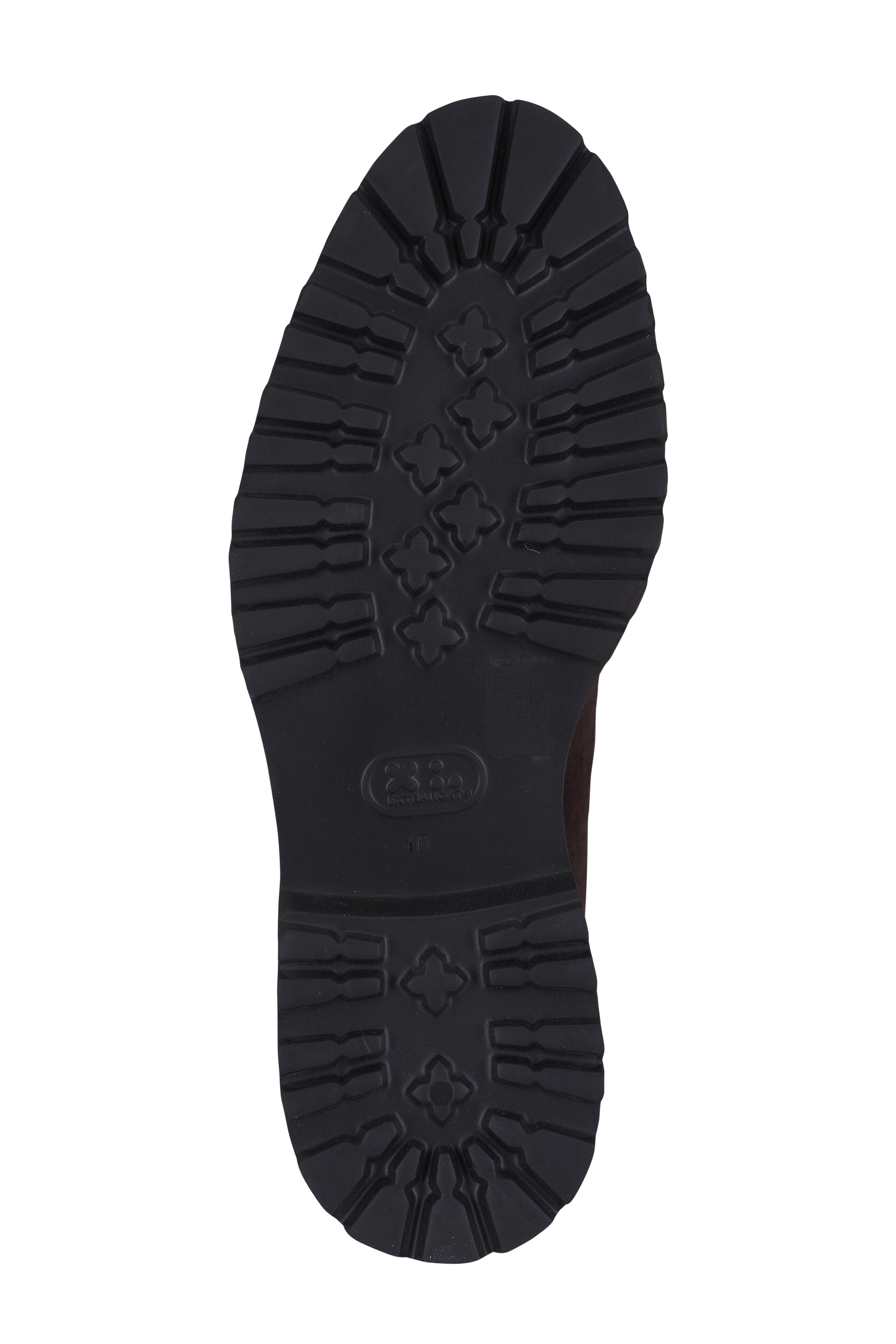 Water-resistant suede upper. Round toe. Lace-up; back pull tab. Leather lining; foam-cushioned insole. Lightweight rubber lug outsole. Made in Italy.