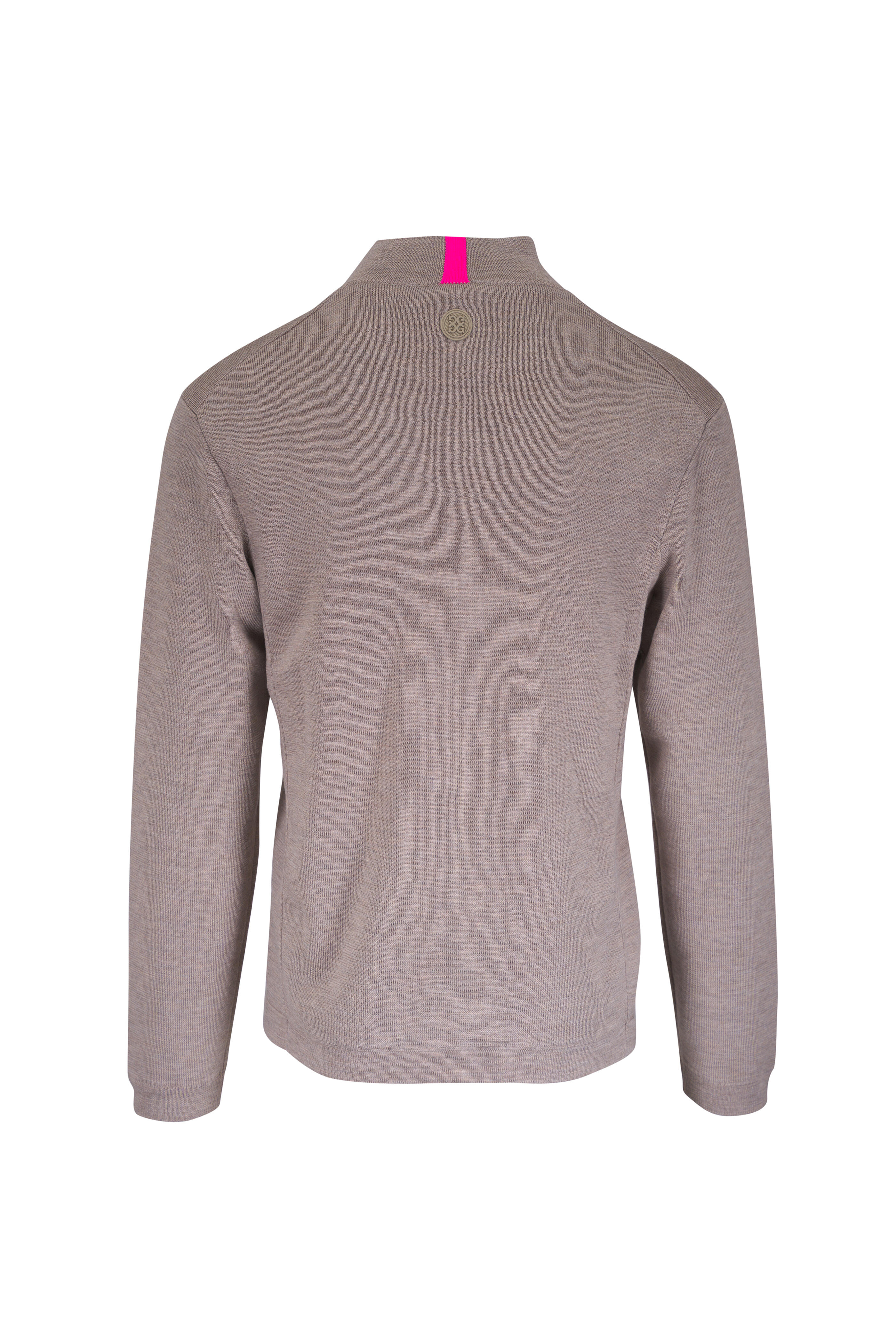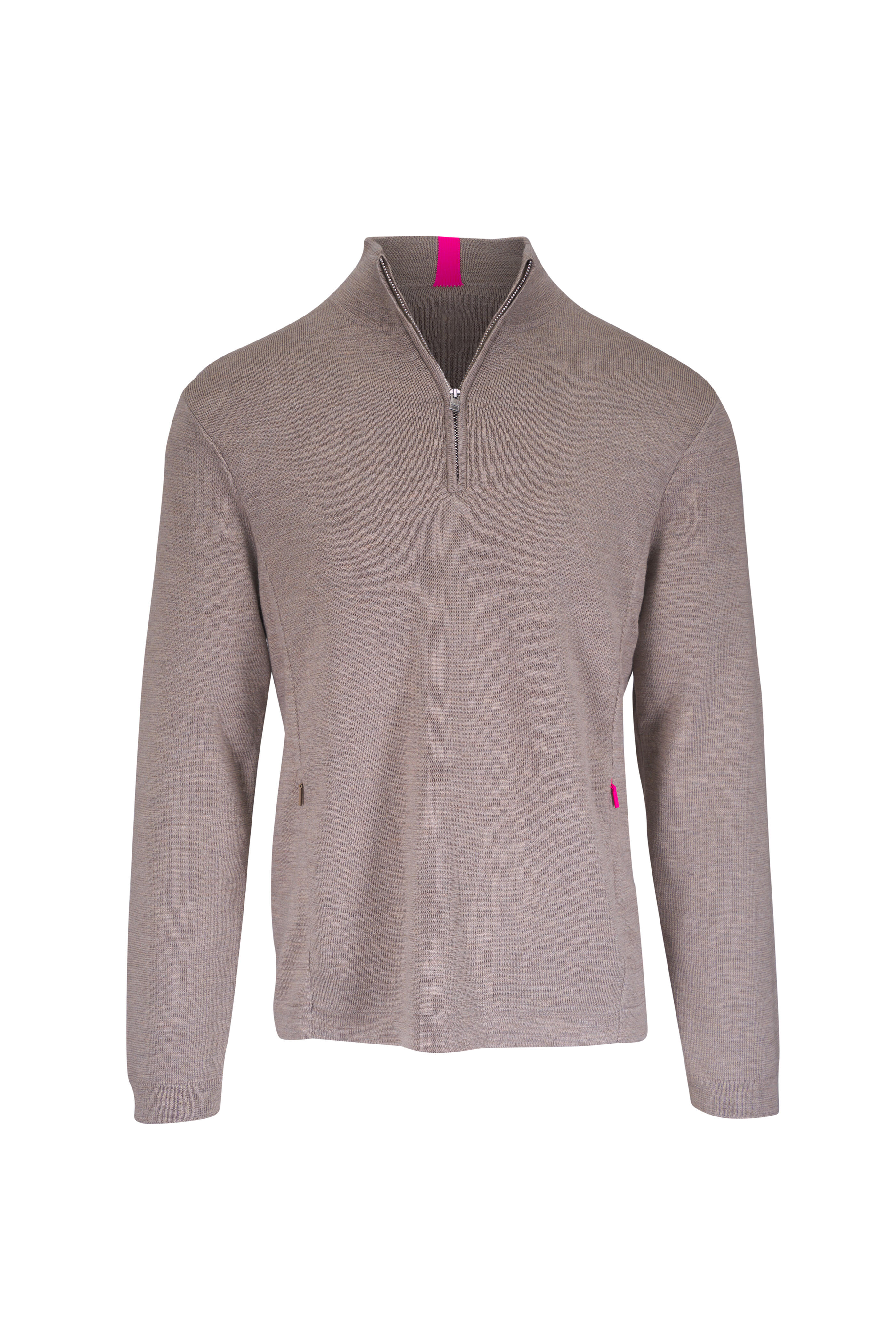 Stand collar. Quarter zip placket. Ribbed trims. Lower slip pockets. Straight hem. Imported. Shoulder to hem 28" (size M). 100% Wool; lined: 100% polyester. Dry clean.