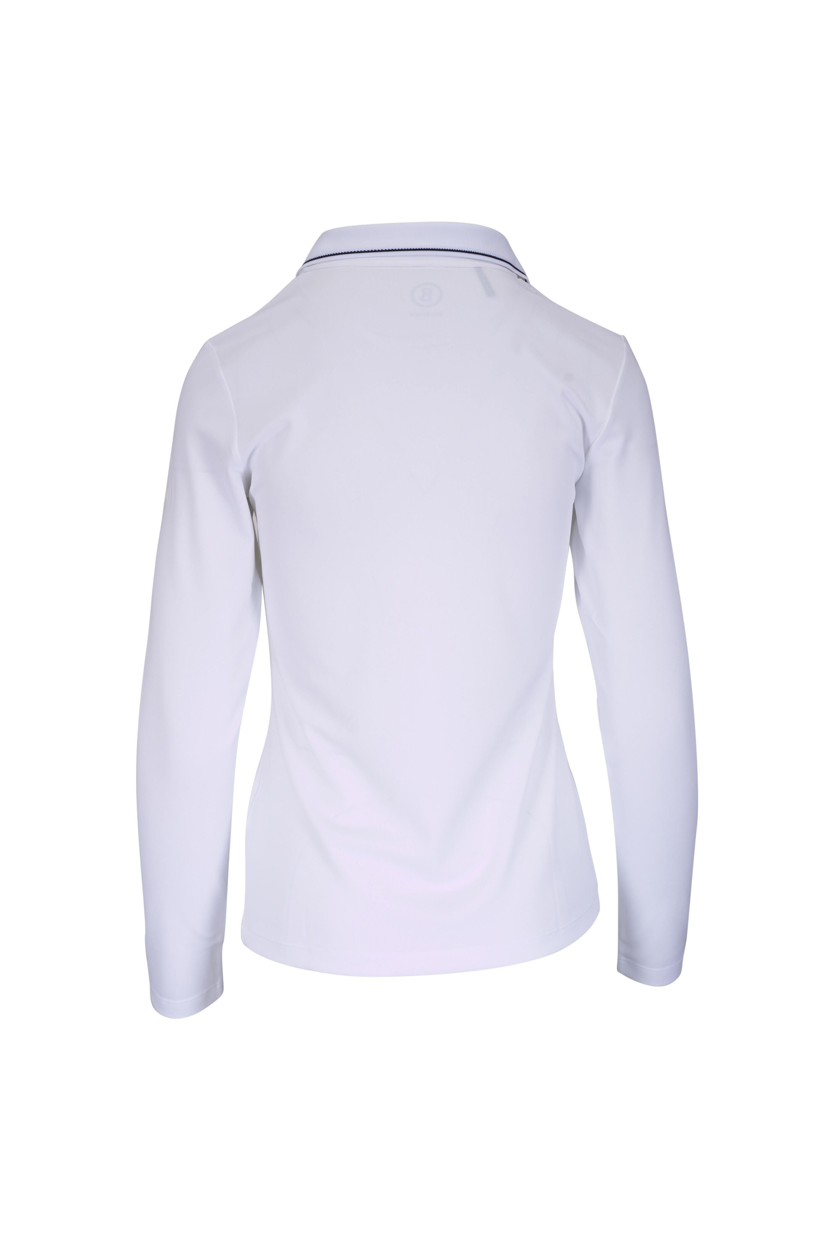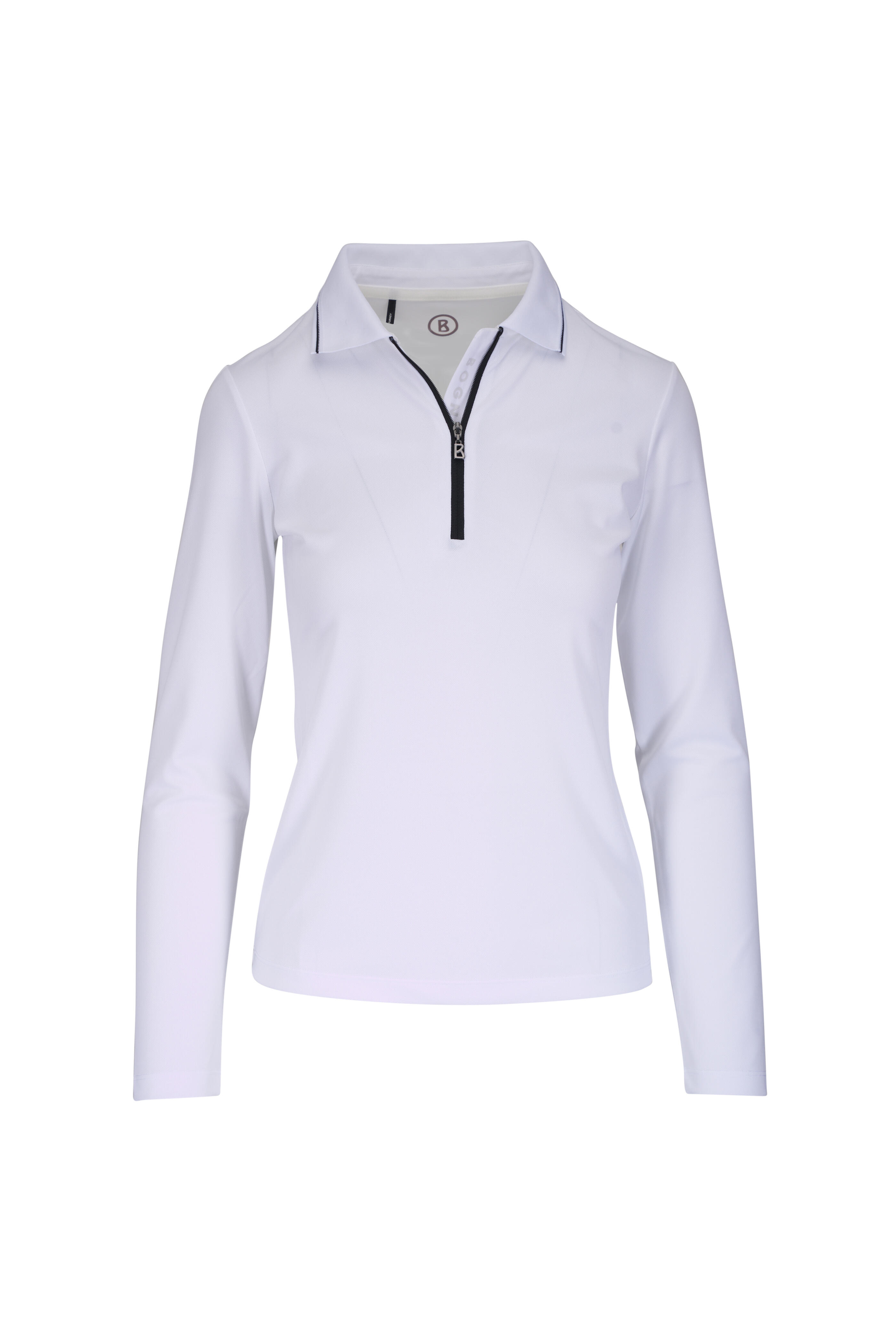 Spread collar. Front partial zip placket. Contrasting details and decorative stitching on the collar. Rubberized label emblem on the sleeve. Imported. 96% polyester, 4% elastane. Machine wash.