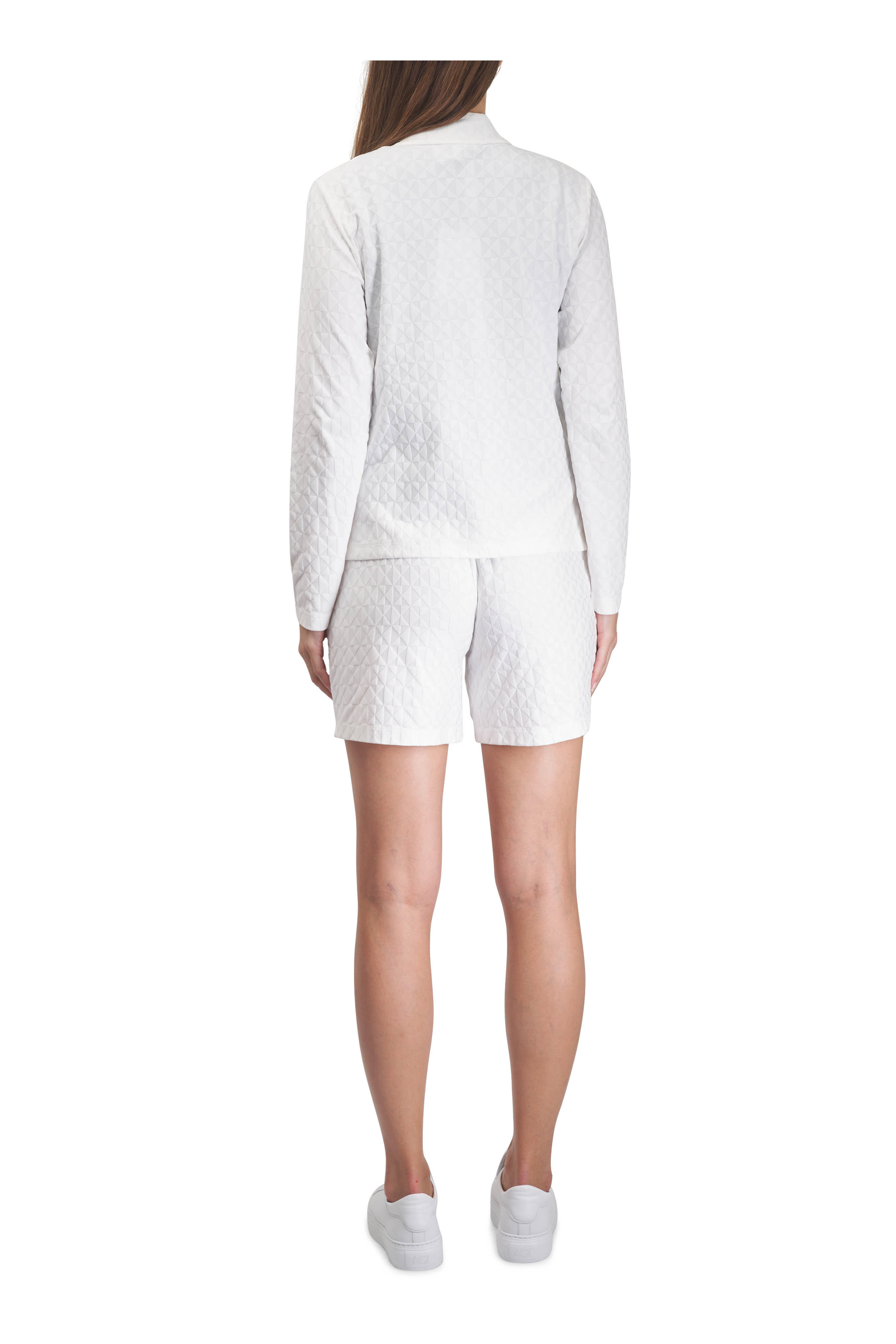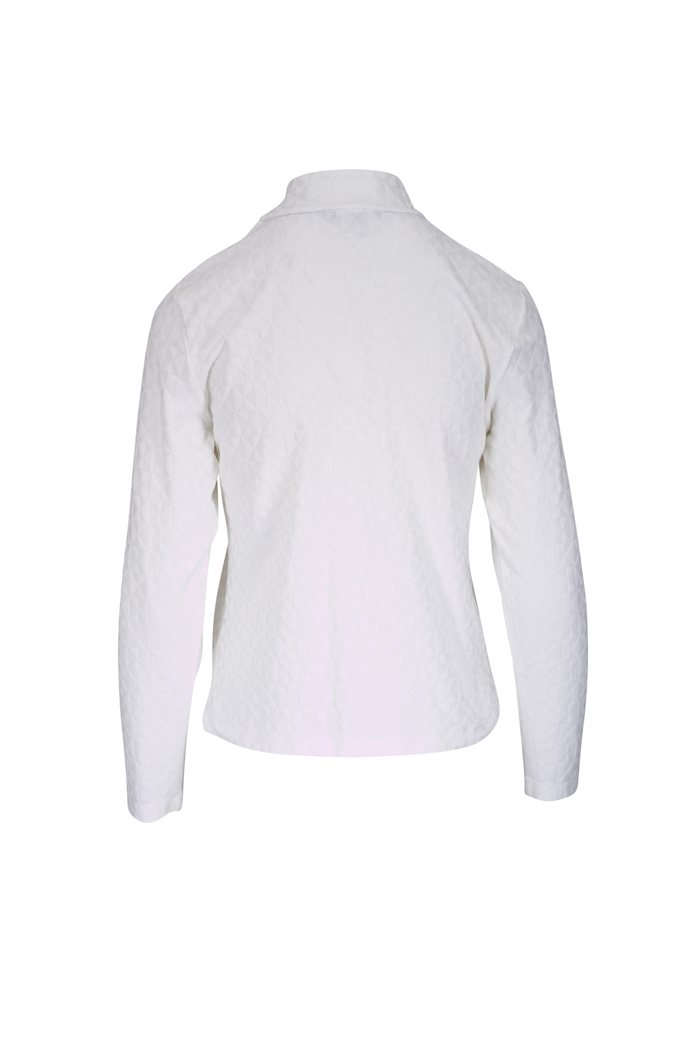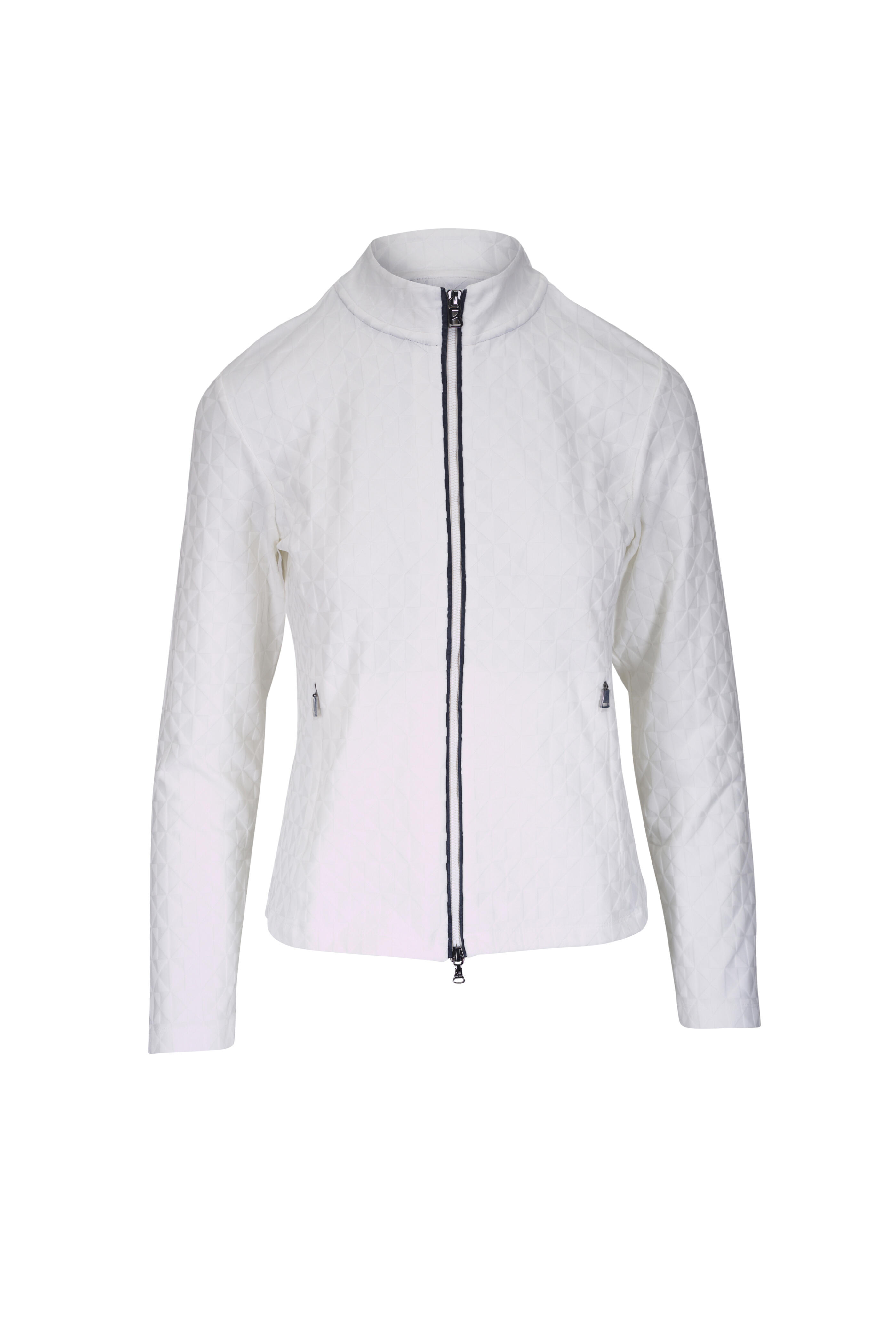 Stand collar. Front zip placket. Side zip pockets. Subtly rounded hemline. Imported. 92% polyamide, 8% elastane. Machine wash.