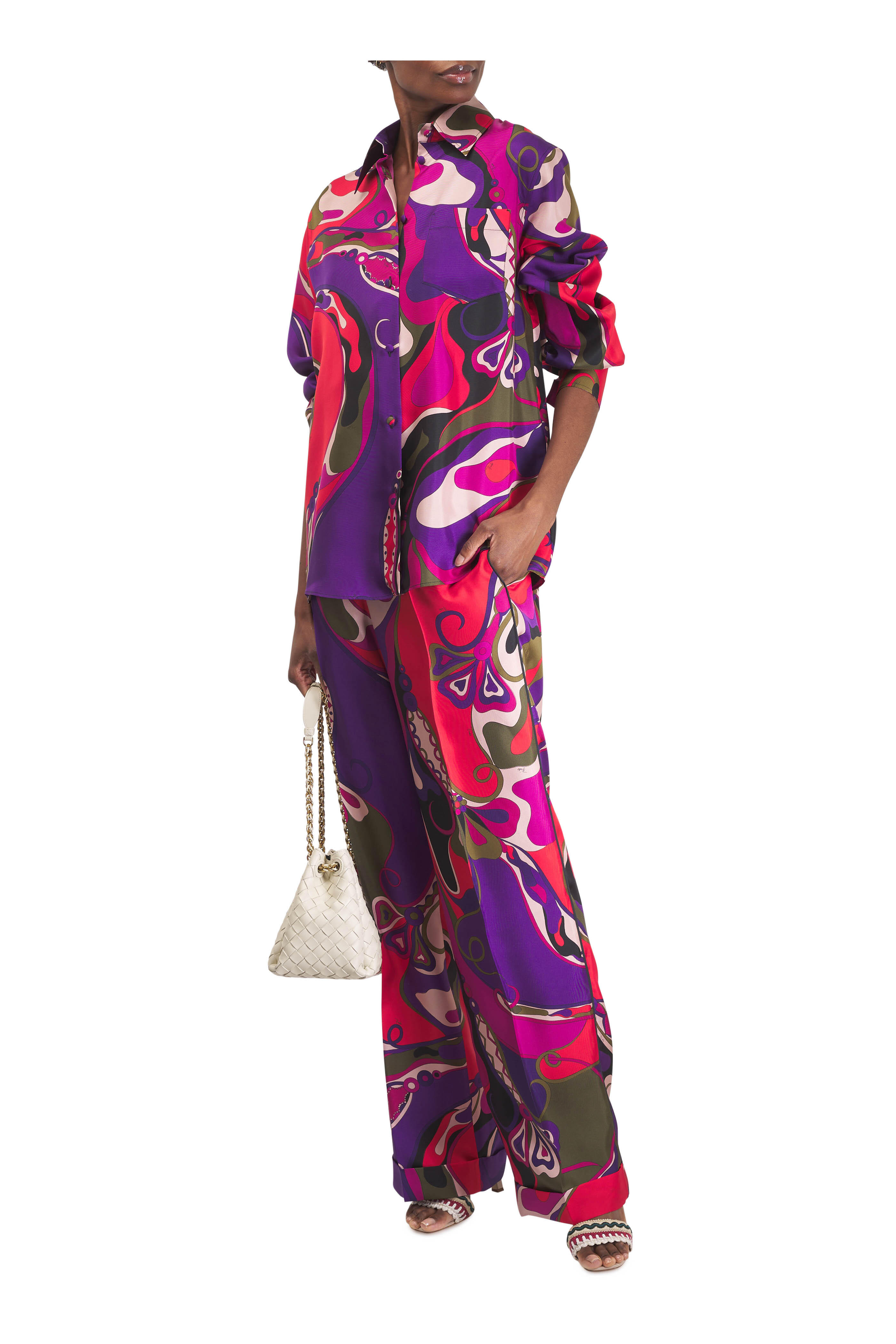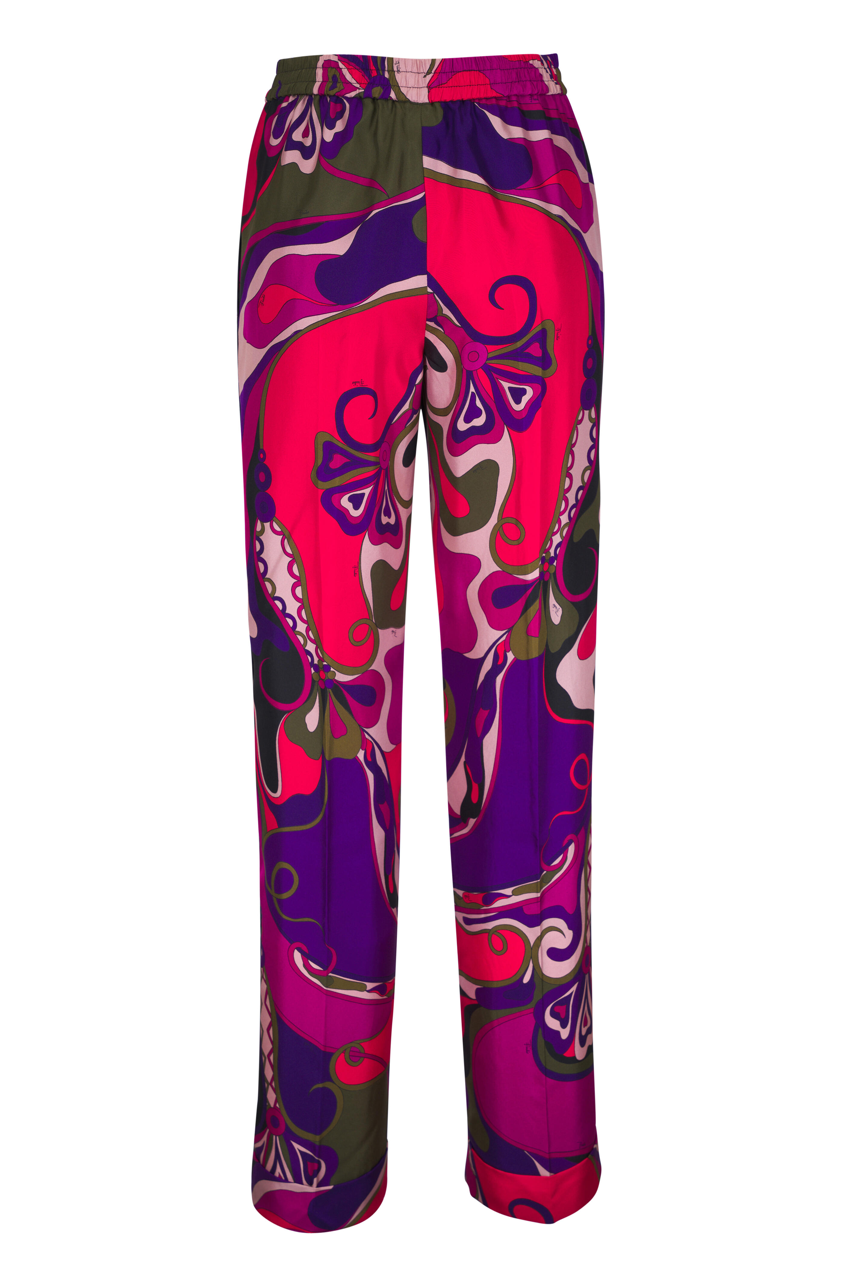 Zip fly; button closure. Elasticized back. Pressed front crease. Side slip pockets. Cuffed hem. Made in Italy. 33" Inseam (size xs). 100% Silk. Dry clean.