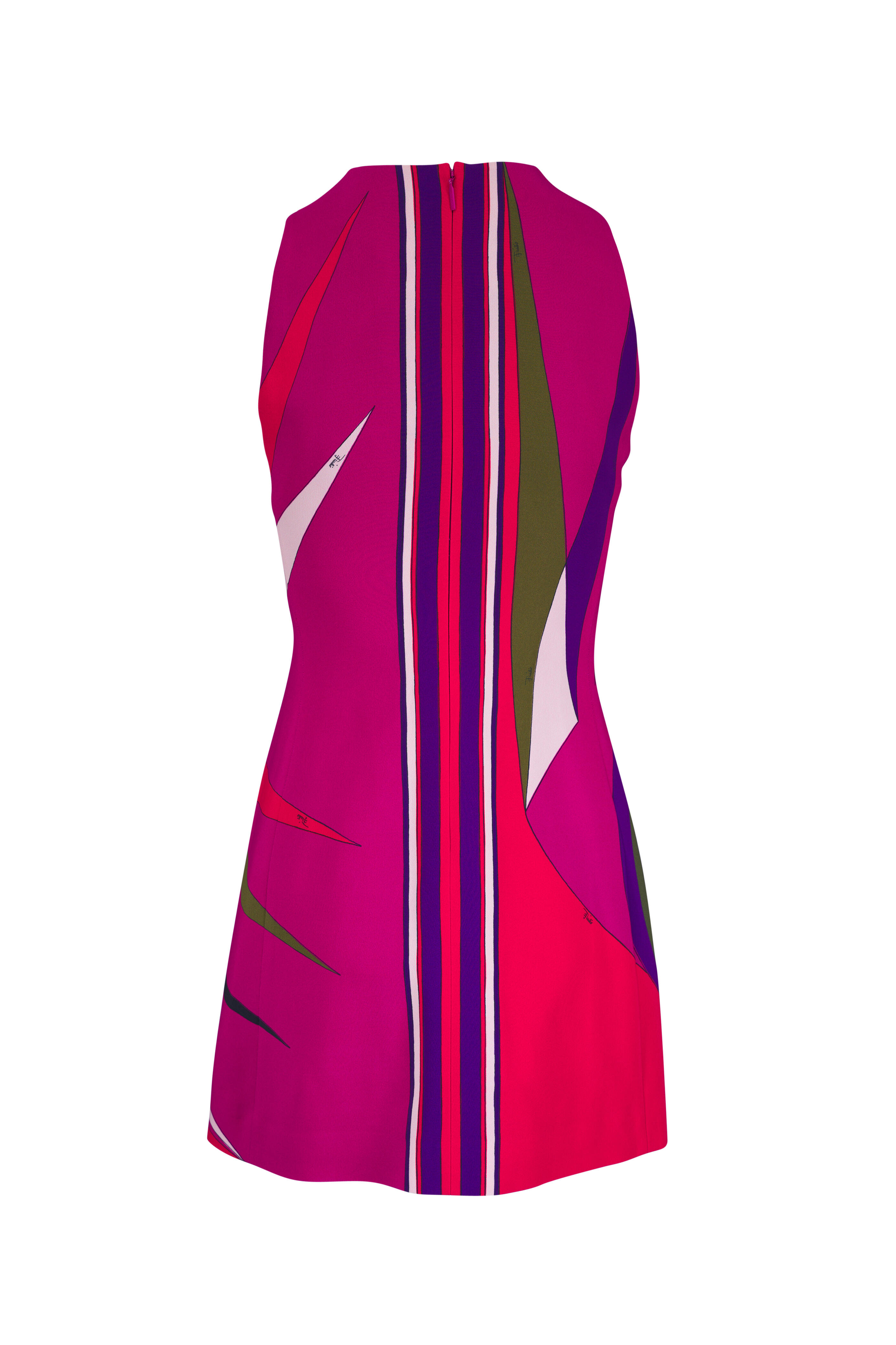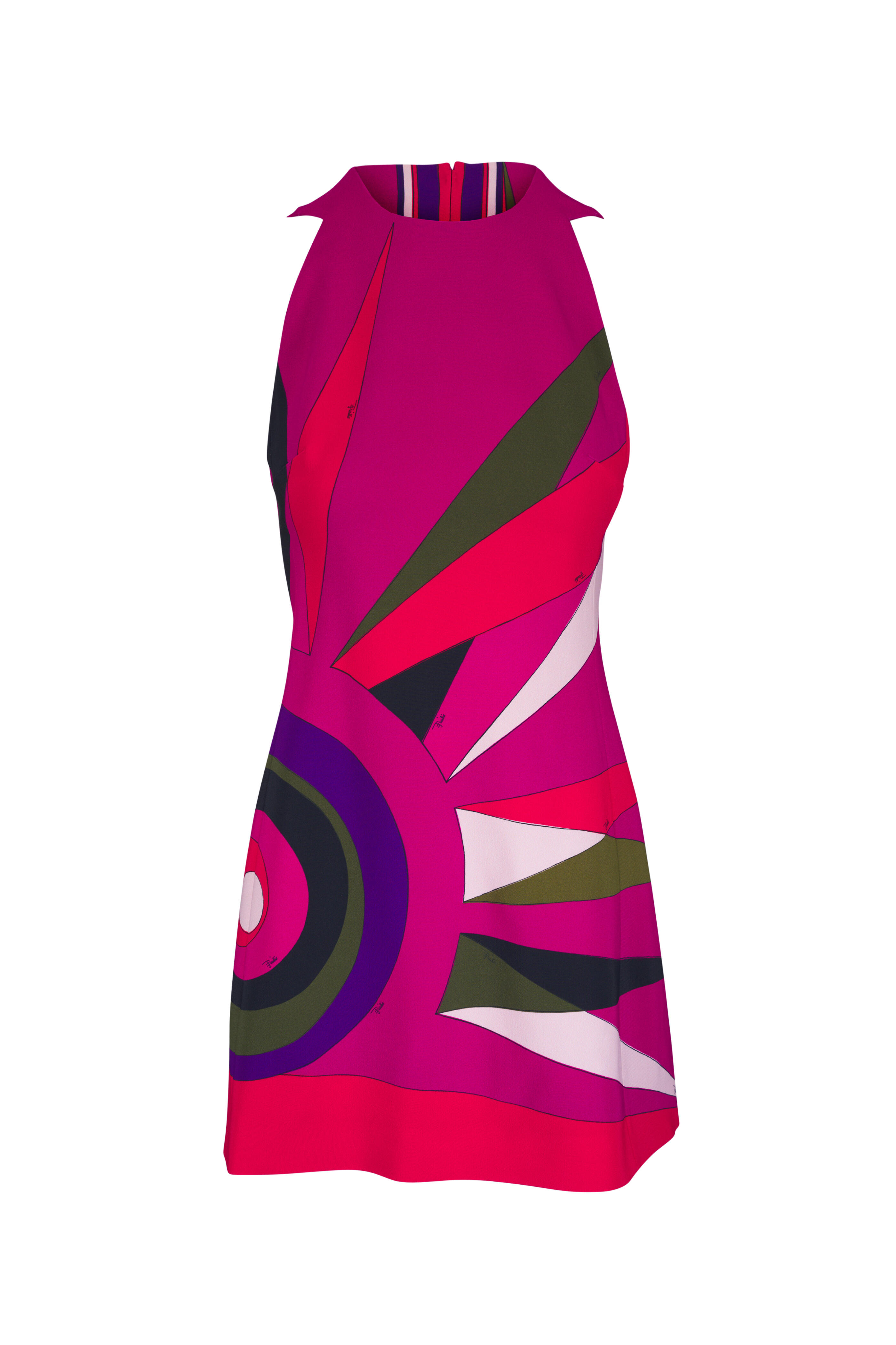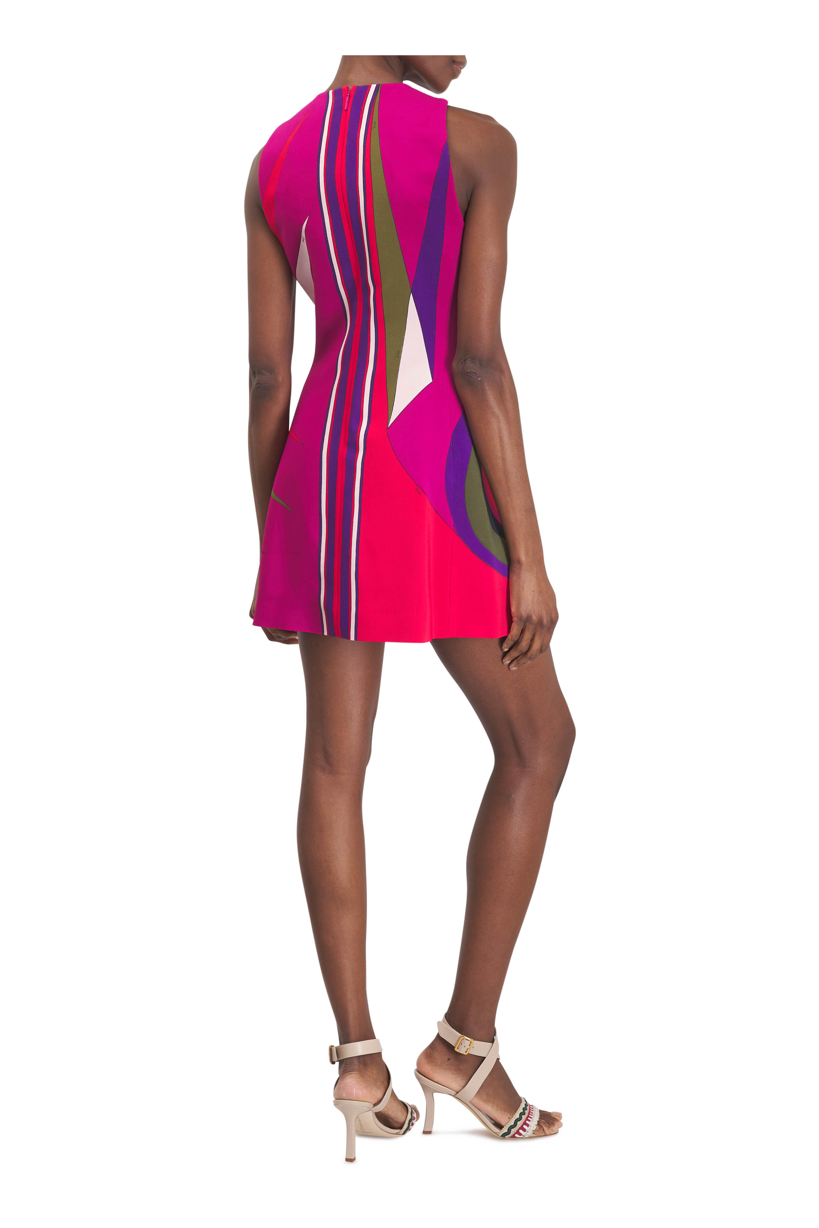 Round neckline. Concealed back zip. A-line dress hem. Made in Italy. Approximately 32" shoulder to hem (size 4). 96% viscose, 4% elastane; Lining: 67% acetate, 33% polyester. Dry clean.