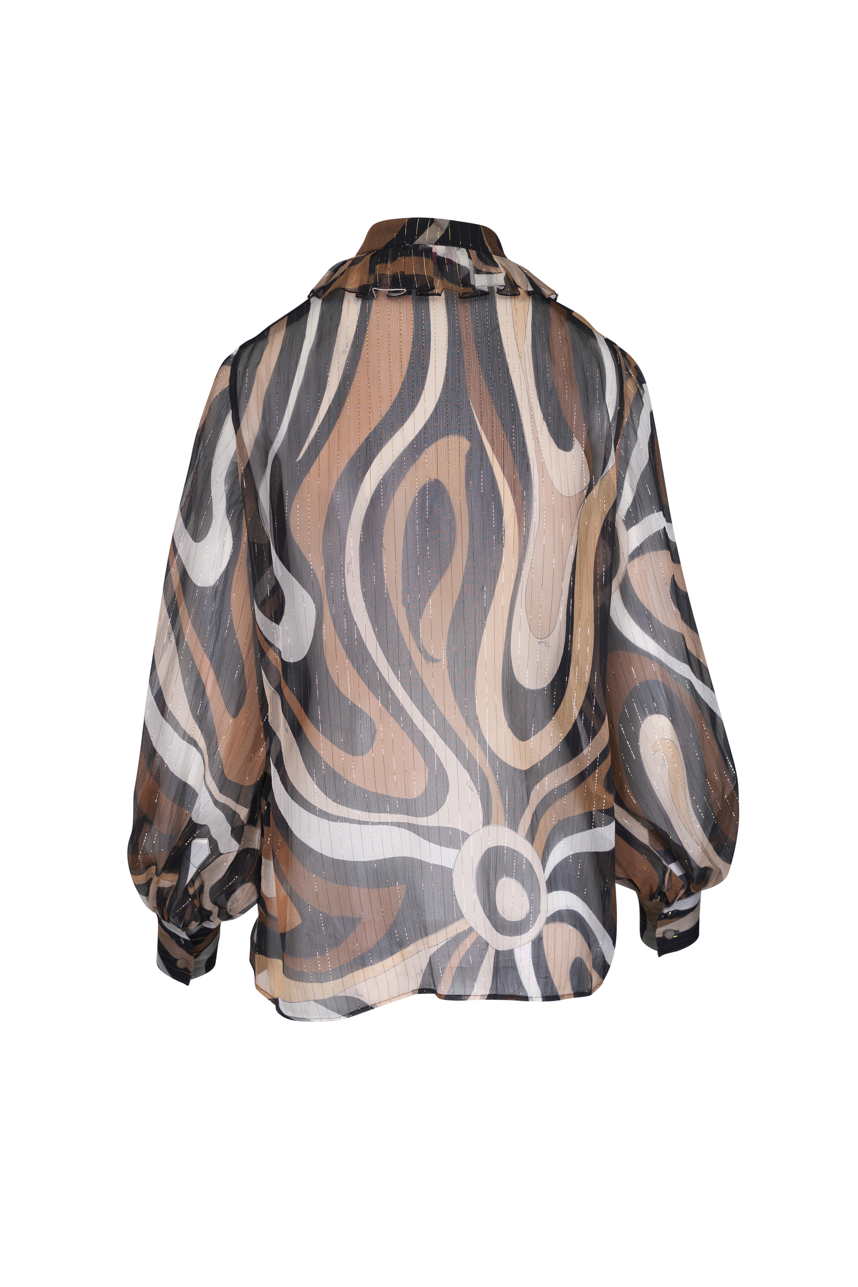 Gathered neckline with a front tie. Half-placket front with a seven-button closure. Made in Italy. 97% silk, 3% polyester. Dry clean.