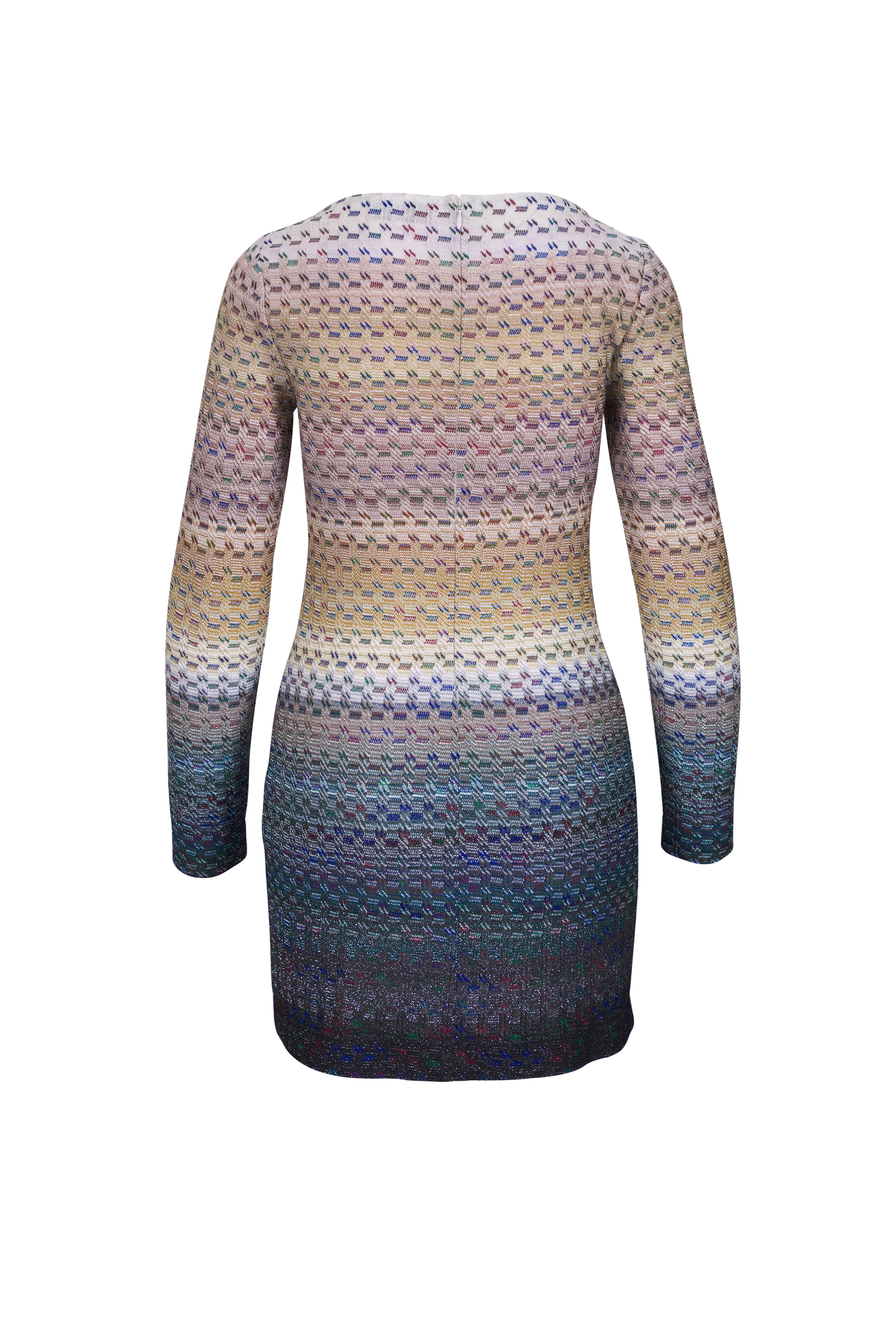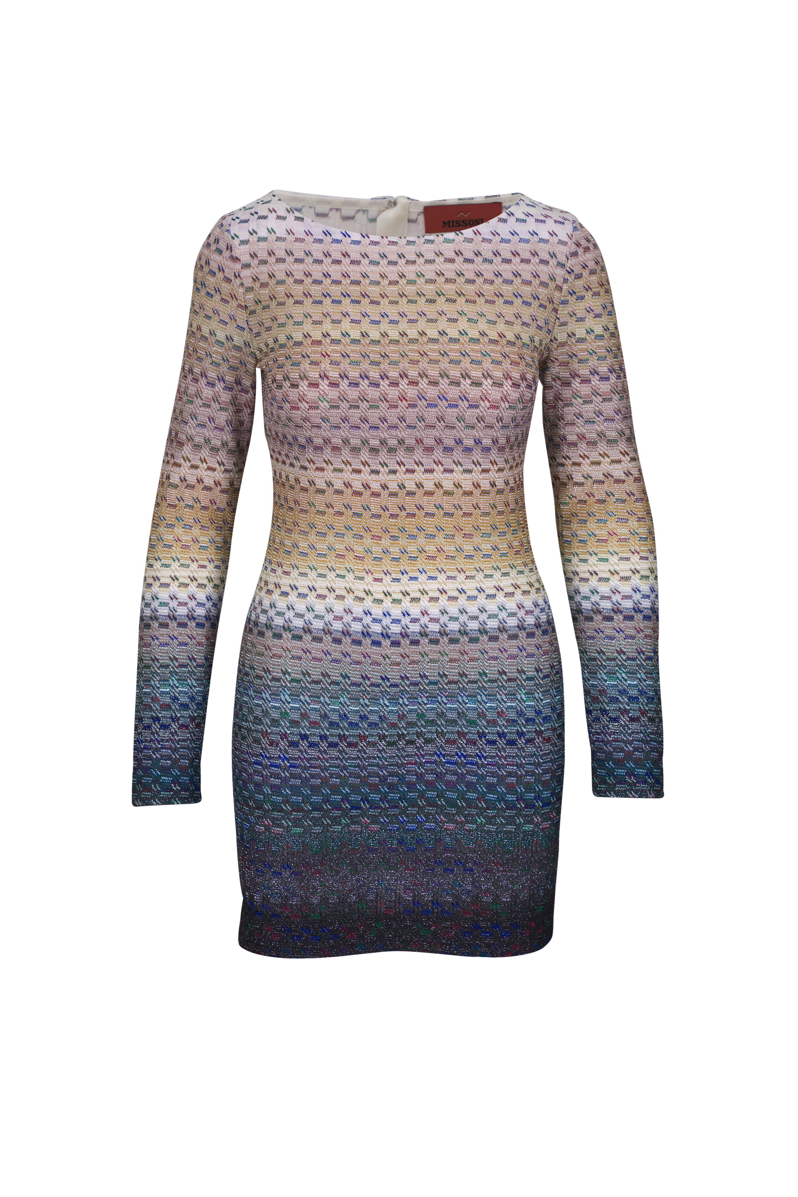 Bateau neckline. Offset raschel knit. Lamé filament blend. Made in Italy. Mini. 88% rayon, 12% metal fiber. Dry clean.